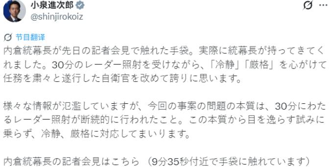小泉进次郎干了一件“奇葩”的事情,小泉进次郎把被“雷达照射”的F-15战机的飞行员所戴的手套拿出来展示,并在上面写上“冷静”、“严格”四个字。他说,我为那些在接受30分钟雷达照射的同时,仍能保持“冷静”、“严格”,并沉着完成任务的飞行员感到自豪。 先给不熟悉的朋友说说小泉进次郎是谁,他出身日本政治世家,父亲是曾任日本首相的小泉纯一郎,靠着家族影响力和自身的曝光度,在日本政坛一直有不少关注度。 他曾担任过日本环境大臣、防卫大臣等重要职务,属于日本自民党内的年轻派力量,一直比较注重通过各类公开活动传递自身的政治主张,也很擅长利用公共事件塑造自身形象。 回到这次展示手套的事上,从表面看,这是对执行任务飞行员的肯定。 毕竟长时间被雷达照射对飞行员的心理和操作都是极大考验,能沉着完成任务确实不容易,小泉进次郎题字展示,相当于给一线安保人员打气,但往深了想,这背后可能也有他的政治考量。 要知道,日本民众对自卫队的表现一直很关注,尤其是涉及到安保相关的任务,民众很在意自卫队能否有效应对各类突发情况。 小泉进次郎这个时候站出来肯定飞行员的表现,其实也是在向民众传递“自卫队能可靠应对突发状况”的信号,进而巩固自身在安保领域的话语权。 毕竟他有过防卫大臣的任职经历,和自卫队的关联本就比较紧密,借助这样的公开活动强化自身在安保议题上的形象,也是合理的考量。 说白了,小泉进次郎这波“奇葩”操作,本质上是个人立场表达和政治形象塑造的结合,既肯定了一线人员的付出,让民众看到对安保人员的重视,也借着这个话题提升了自身的曝光度,强化了和安保领域的绑定。 不过这波操作也引发了不同讨论,有人觉得是合理的鼓励,也有人觉得有点刻意制造话题。 从目前披露的信息来看,事件的核心事实很清晰:F-15飞行员遭遇30分钟雷达照射后沉着完成任务,小泉进次郎公开展示其手套并题字表自豪。 至于这波操作最终能带来什么影响,还要看后续的舆论走向。 以上都是个人观点,对此你有什么不同的看法,可以在评论区留言讨论!