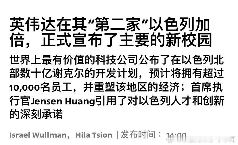 英伟达英伟达是全球最值钱的公司。以色列是英伟达在美国以外最大和最重要的创新发展中心。该公司将在以色列建立第二个总部,规模仅次于硅谷总部,预计可容纳10000多名员工,大约是英伟达目前雇佣以色列劳动力的两倍,约占其38个国家全球劳动力的三分之一。海外新鲜事 新总部将包括绿地、游客中心、咖啡馆和餐馆,实验室和协作空间,旨在促进英伟达内部以及初创企业和其他合作伙伴的创新。