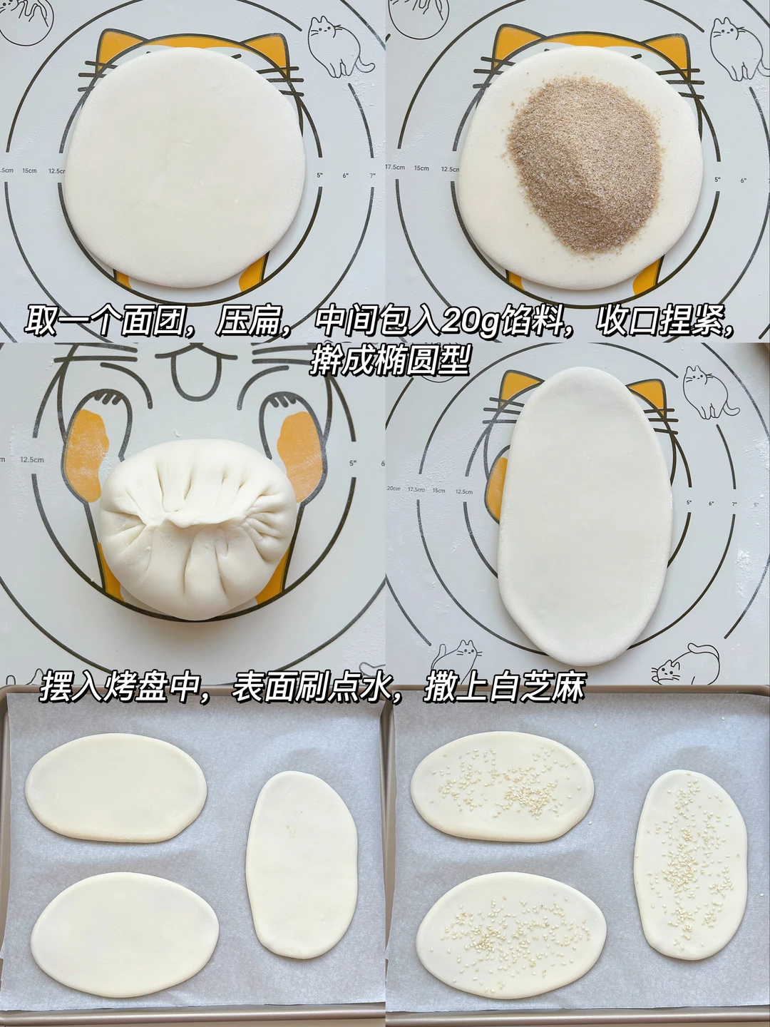2️⃣把面团均匀的分成六份,滚圆,压扁,中间包入20g馅料,收口捏紧,擀成椭圆形;表面刷点水,撒上白芝麻。