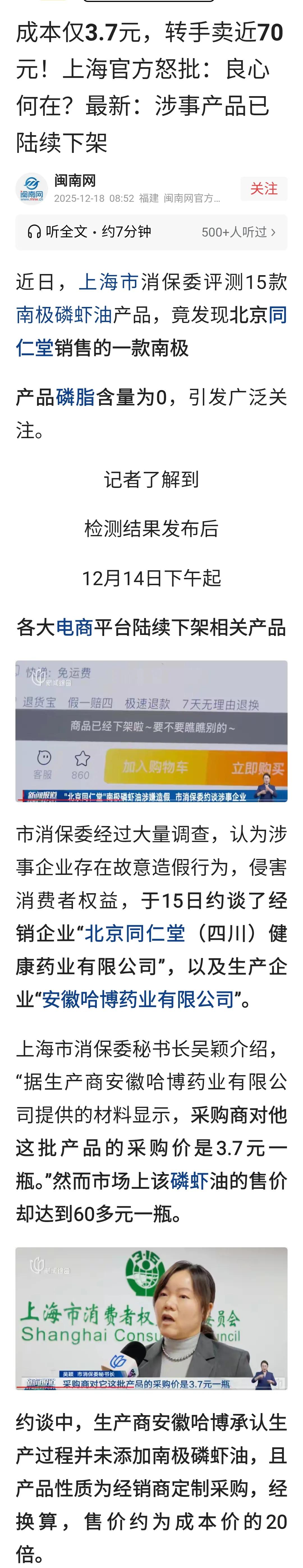 北京同仁堂销售的南极磷虾油产品,产品磷脂含量为0! 这算故意造假?欺诈消费者?