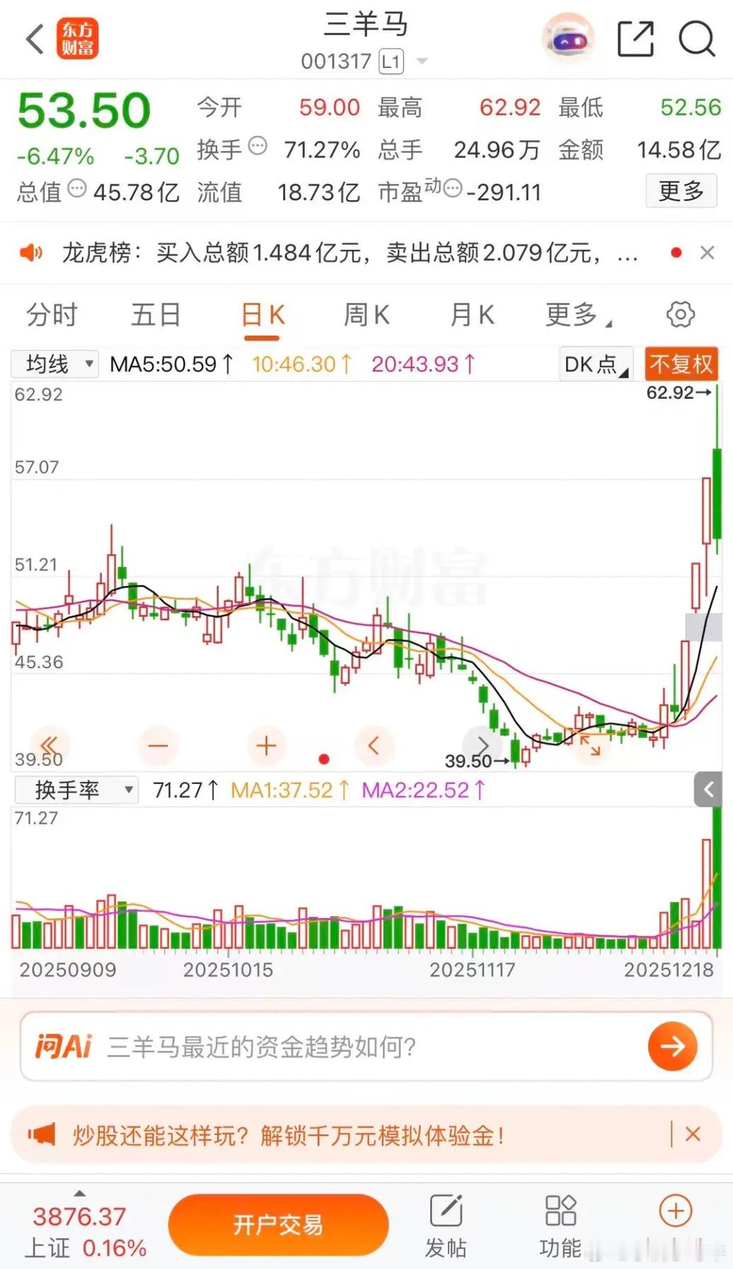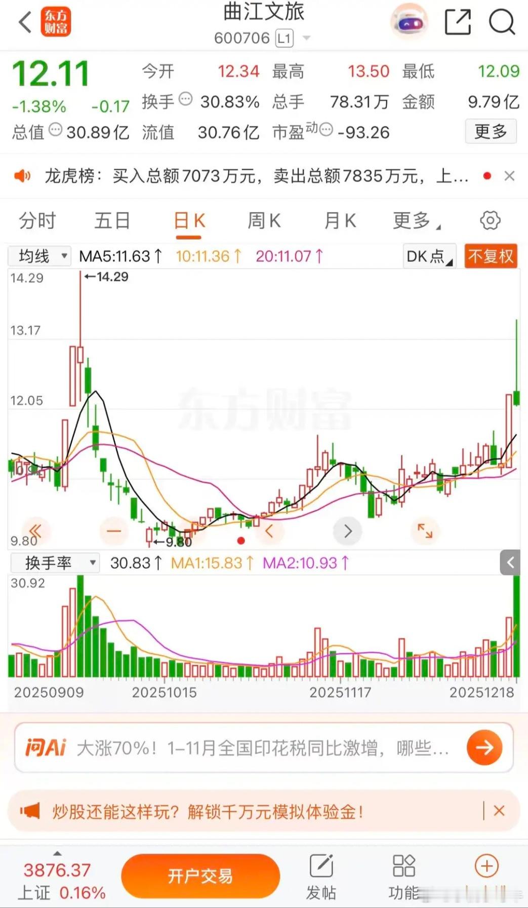宏和科技,三羊马,曲江文旅宏和科技跌幅7.55%收盘报收32.68元每股,成交金额8.55亿元,明天反包涨停板。曲江文旅跌幅1.38%,收盘报收12.11元每股,成交金额9.79亿元,仙人指路明日涨停概率很大很大。三羊马跌幅6.47%,盘中触板,收盘报收53.50元每股,成交金额14.58亿元,强势3连板,明日反包涨停概率挺高?