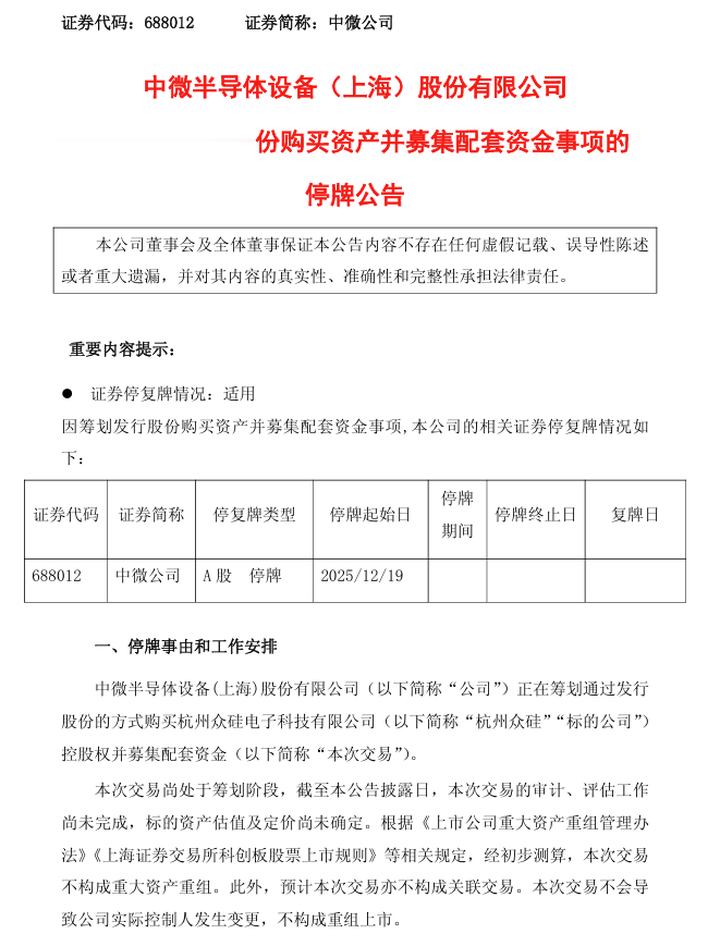 12月18日晚,国产半导体设备龙头中微公司发布公告称,公司正在筹划通过发行股份的方式购买杭州众硅电子科技有限公司控股权并募集配套资金。经公司申请,公司股票自12月19日开市起开始停牌,预计停牌时间不超过10个交易日。