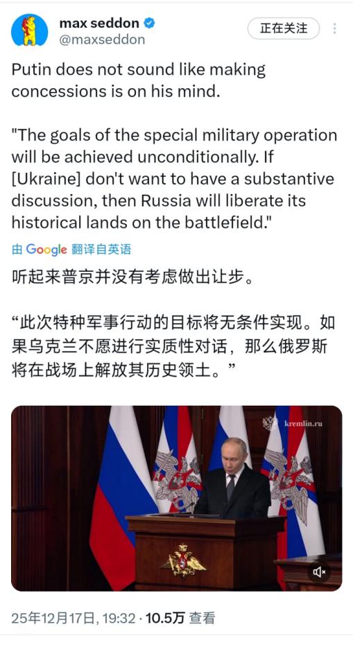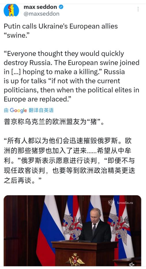 普京:“此次特别军事行动的目标将无条件实现。如果乌克兰不愿进行实质性对话,那么俄罗斯将在战场上解放其历史领土。”普京还指出:欧洲的“小猪们”当时加入了拜登政府的阵营,希望迅速摧毁俄罗斯,并从中获利。   俄罗斯的战场优势最直观的就是硬实力撑得住,2024年俄军的军费已经涨到了12.1万亿卢布,占GDP的6.3%,比2021年翻了一倍还多,这么大笔投入全砸在了国防上。   前线的俄军从来不愁装备不够用,2024年一年就制造和翻新了1500多辆主战坦克,比损失的数量还多,就算是翻新的库存装备,对付乌克兰前线的缺口也绰绰有余。   更让人头疼的是俄军的滑翔炸弹,用老旧炸弹改装一下,就能远程精准打击乌军工事,乌军至今没找到有效应对办法,俄罗斯还打算把2025年的产量从4万枚提到7万枚,这玩意儿威力大,被击中基本没活路,前线乌军最怕的就是这个。   战线推进上,俄军虽然慢但稳扎稳打,2023年10月到2024年2月打了5个月拿下阿夫杰耶夫卡,2024年7月开始攻波克罗夫斯克,熬了5个多月,2025年初也拿下了城市的“南大门”库拉霍夫,一步步把顿巴斯地区的关键节点攥在手里。   反观乌克兰这边,早就扛不住了,前线士兵每天都要面对无人机的追杀,60%到80%的无人机刚飞出去就被击落,每月损失超过万架,可就算这样,想靠无人机拦住俄军也难。   更要命的是乌军缺弹药,2023年还能收到160万枚155毫米炮弹,2024年就降到了150万枚,2025年初更是直接减量,前线指挥官经常早上10点就被告知弹药用完了,想用无人机对付一辆俄军坦克得耗好几个小时,而俄军的炮火覆盖从来没停过,这种实力差距摆在那,俄罗斯自然有底气硬气。   普京说的“历史领土”也不是凭空捏造,顿涅茨克、卢甘斯克、赫尔松、扎波罗热这些地方,从基辅罗斯时期就和俄罗斯有着千丝万缕的联系,几百年来疆界变动中,这些地区的居民大多一直说俄语,认同俄罗斯文化,在俄罗斯看来,这些本来就是自家的历史疆域。   现在俄军不仅在军事上推进,还在占领区搞起了治理,推进俄罗斯货币流通,重建基础设施,安抚当地民众,慢慢把这些地区纳入自己的管理体系,相当于在战场上为“解放历史领土”铺路。   再看那些被普京称作“小猪们”的欧洲国家,当初跟着拜登政府一头扎进来,又是给乌克兰送武器又是递钱,可现在自己也陷入了困境。   欧盟搞了个2024到2027年援助乌克兰500亿欧元的机制,到2025年11月已经拨付了不少款项,挪威还在2025年底宣布追加2.68亿欧元援助,包括F-16的弹药和防空导弹,可这些援助看着热闹,实际根本填不上乌克兰的缺口。   欧洲的工业能力早就到了极限,没法满足前线持续的弹药需求,而且内部分歧越来越大,有的国家已经开始抱怨援助负担太重,民众反战情绪也越来越高,想靠打压俄罗斯获利,结果反倒让自己的经济和能源压力越来越大,完全是搬起石头砸自己的脚。   当然俄罗斯也不是没麻烦,俄军推进效率确实受无人机影响,为了反制乌军的“机海战术”,每个阵地的干扰器从6个加到15个,虽然管用,但也减慢了进攻节奏。   欧洲虽然援助乏力,但没完全停手,F-16的配套弹药还在陆续交付,给乌军留了点喘息的机会。   而且打了这么多年,俄军也有消耗,2024年四季度财政赤字一度达到4.06万亿卢布,三年累计赤字10万亿卢布,虽然还在可接受范围,但长期战争的消耗也是不小的压力。国际社会的制裁和压力也没断,这些都是俄罗斯要面对的难题。   不过俄罗斯也在想办法应对,除了提升武器产量,还在巩固占领区的控制,让当地治理慢慢走上正轨,减少后续隐患。   在经济上,虽然面临制裁,但2024年预算收入还是增长了26%,油气收入和非油气收入都超预期,靠着能源出口转向亚洲等方式,扛住了西方的经济打压,为战争提供了持续的资金支持。   2024年以来的战场态势已经很清楚,俄罗斯的优势越来越明显,普京的讲话其实就是对这种态势的明确表态。   乌克兰要是一直拒绝实质性对话,俄军只会继续在战场上推进,一步步实现自己的目标。那些欧洲国家当初想趁火打劫,现在却陷入两难,援助多了自己扛不住,援助少了乌克兰撑不下去。   俄罗斯要想完全实现目标,还得应对长期消耗和外部压力,但就目前的战场形势和自身实力来看,确实有底气说“目标将无条件实现”。   这场冲突的走向,最终还是要看乌克兰是否愿意坐下来谈判,以及欧洲国家能不能持续扛住援助的负担,而俄罗斯显然已经做好了打持久战的准备,不达到目的不会轻易收手。