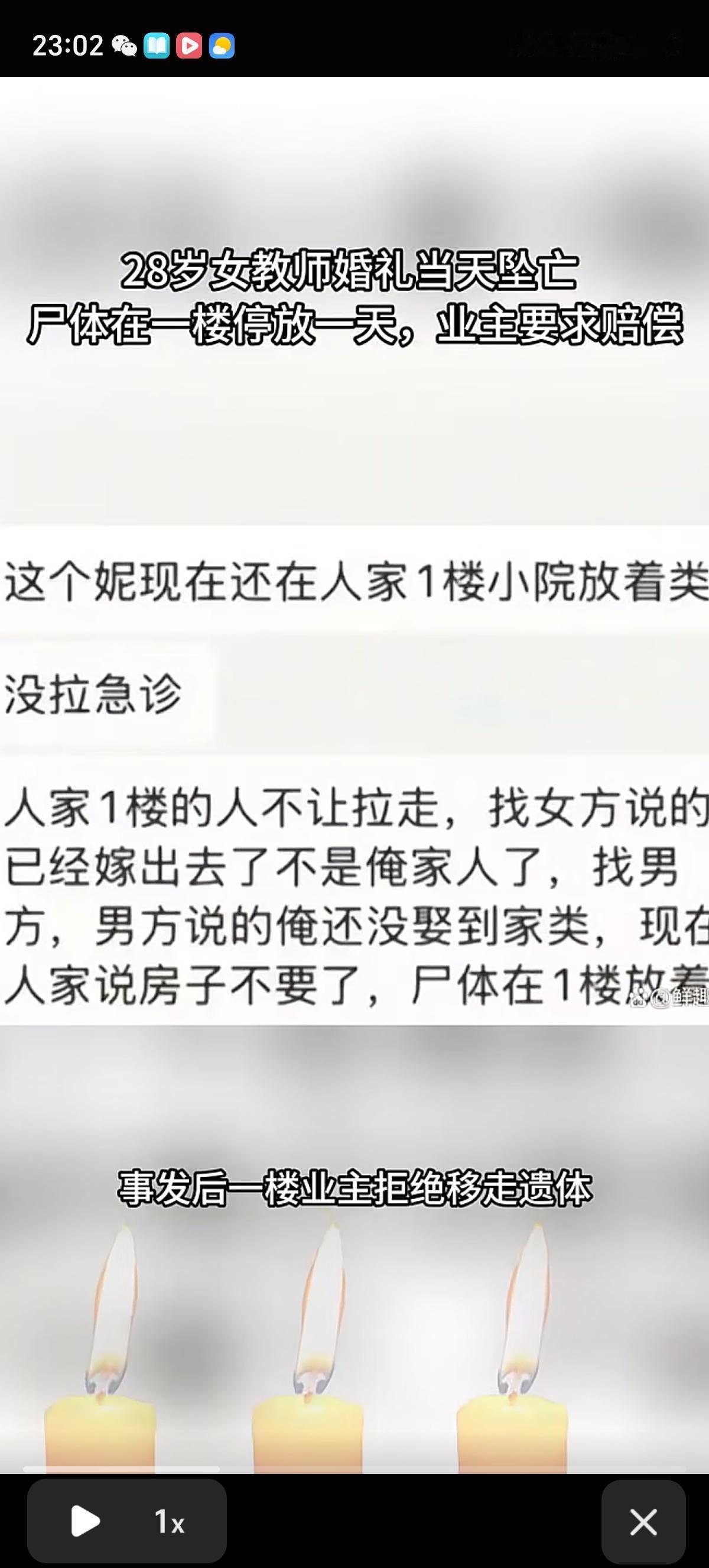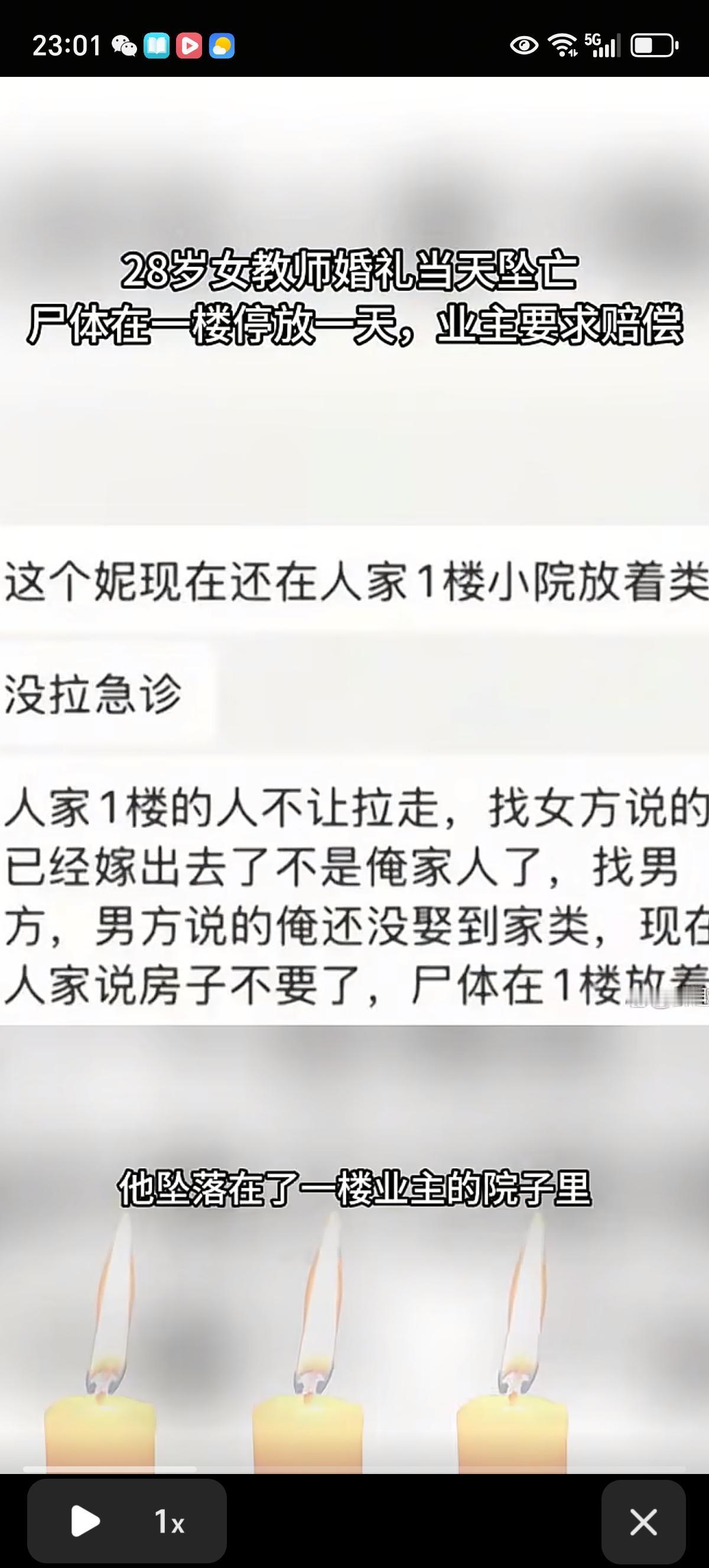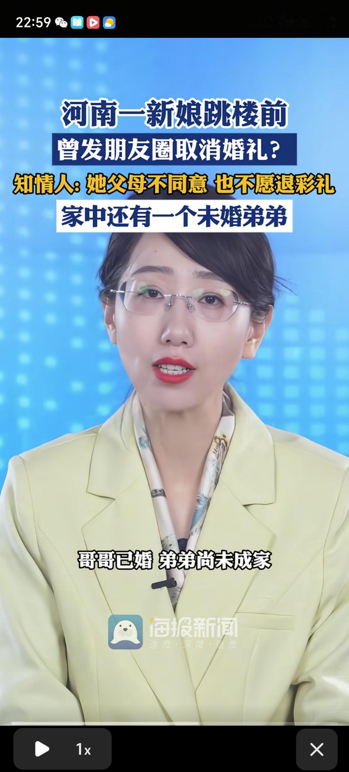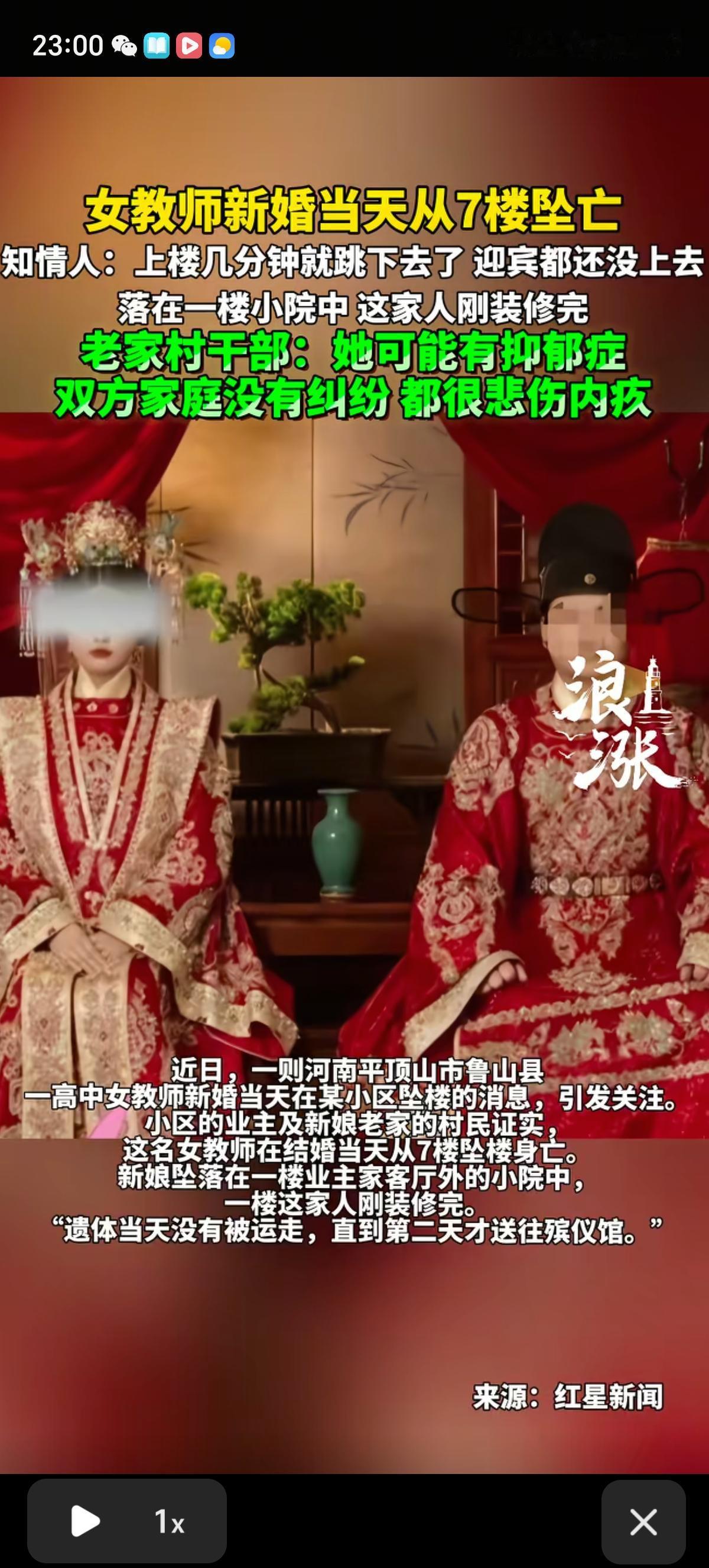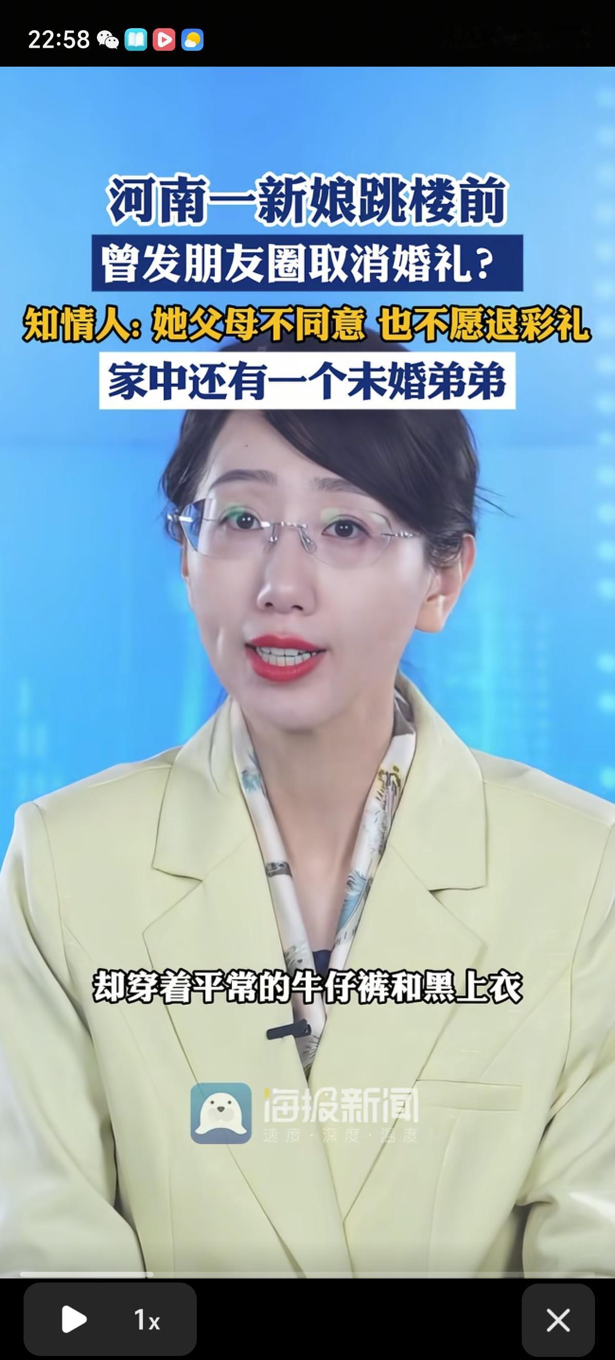 河南跳楼的女教师新娘在婚礼前穿着平常的牛仔裤和黑上衣,从婚房的7楼跳到了1楼业主的院子里,放了一天。刚装修好的房子变成了凶宅。1楼业主气坏了,说自家房子不要了,要求赔偿。 这个女教师之前想退婚的,娘家人不同意,不给退彩礼。彩礼20多万呢,她又没有钱还,就这么想不开把自己坑了。 7楼的婚房和一楼的新房都成了凶宅,房子贬值缩水了,张律师说双方可以找女方的父母赔偿,只能从女方留下的那3万元里赔偿。 一楼的业主还可以找7楼的业主赔偿,因为7楼是高风险区域,如果7楼的业主没按要求安装好防止人掉落的围栏就可以找7楼的业主新郎赔偿。