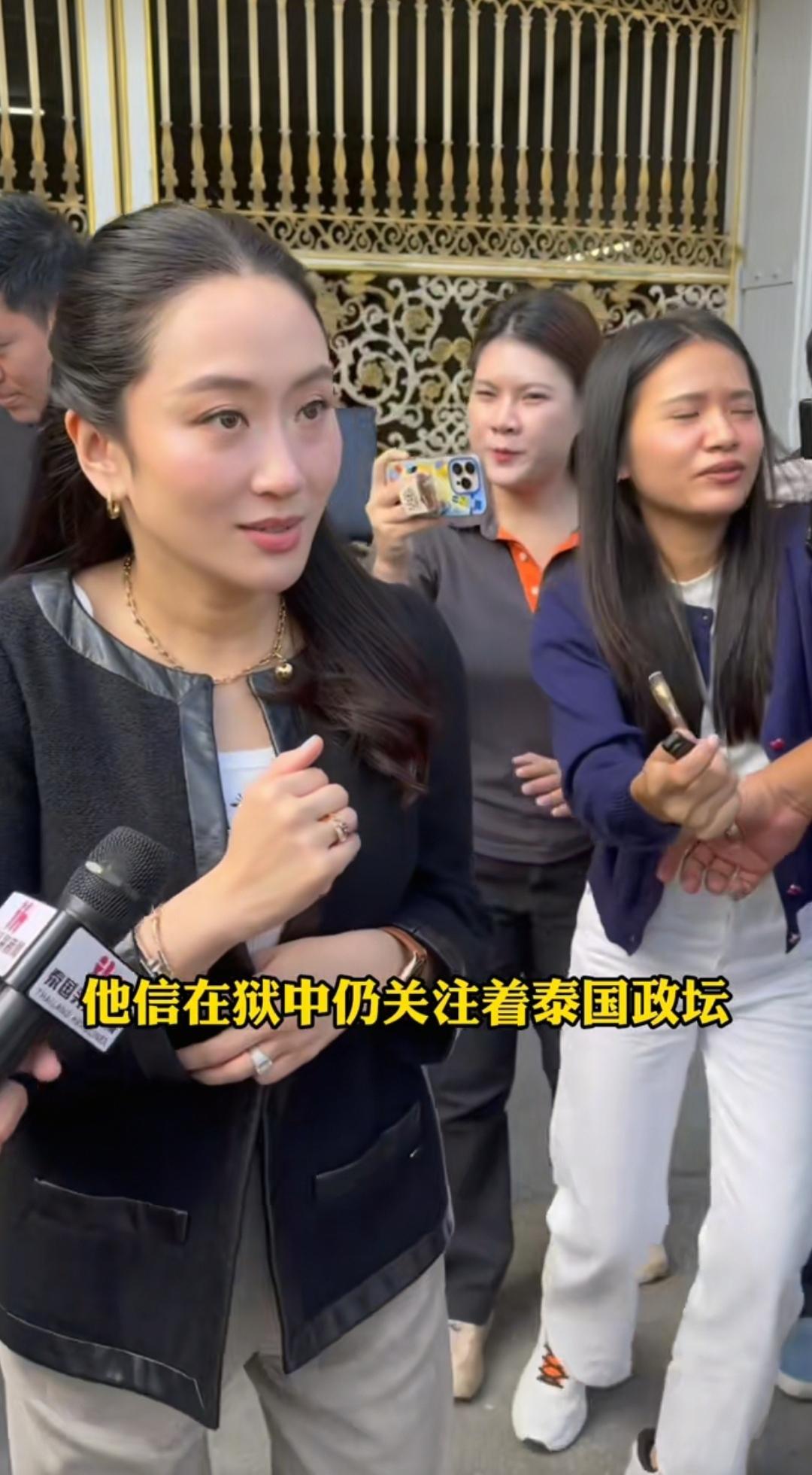 12月18日上午,佩通坦和老公再次看望父亲,这次看望完父亲出来后,看起来还是特别的开心。 佩通坦穿着时尚,穿着白色高跟鞋,浅色阔腿裤和黑色夹克,脖子上佩戴金项链,拿着黑色皮包。 佩通坦透露她姑姑的儿子也就是她表哥约查南被推荐成为为泰党总理候选人之一,这对她们家族来说也是目前最大的期待。