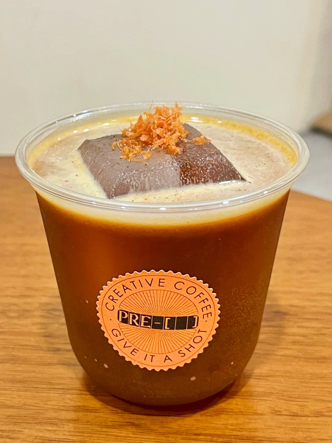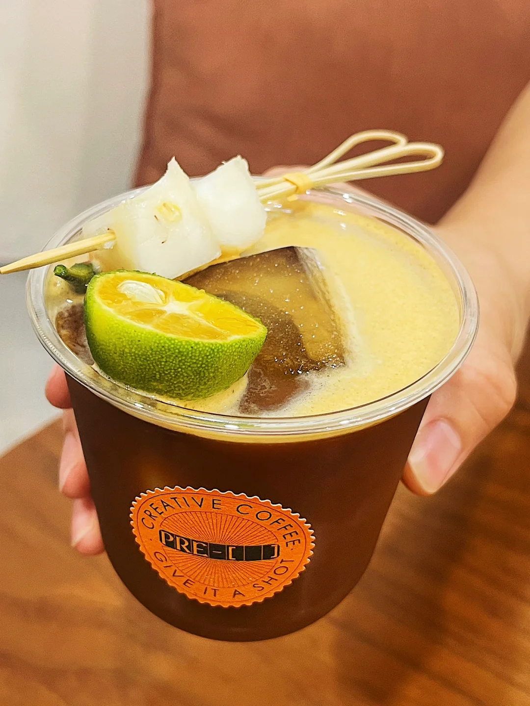 🗯️我点了一杯美梅,第一次有看到用烧鹅的酸梅酱和咖啡融合在一起,喝起来又酸又咸带着咖啡的气泡感,就很清爽很爱,直接击中我的心巴!现在写着写着也想来一杯了~再介绍一下点得最多招牌🐔兄,将椰子鸡咖啡融合在一起,我有两个朋友都喝了,爱的人觉得很爱,不爱的人觉得喝不惯。
