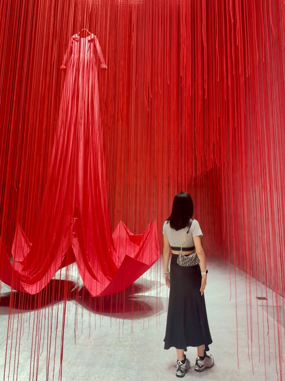 三件高耸的红裙静静伫立,藏着无法言说的情绪与故事。