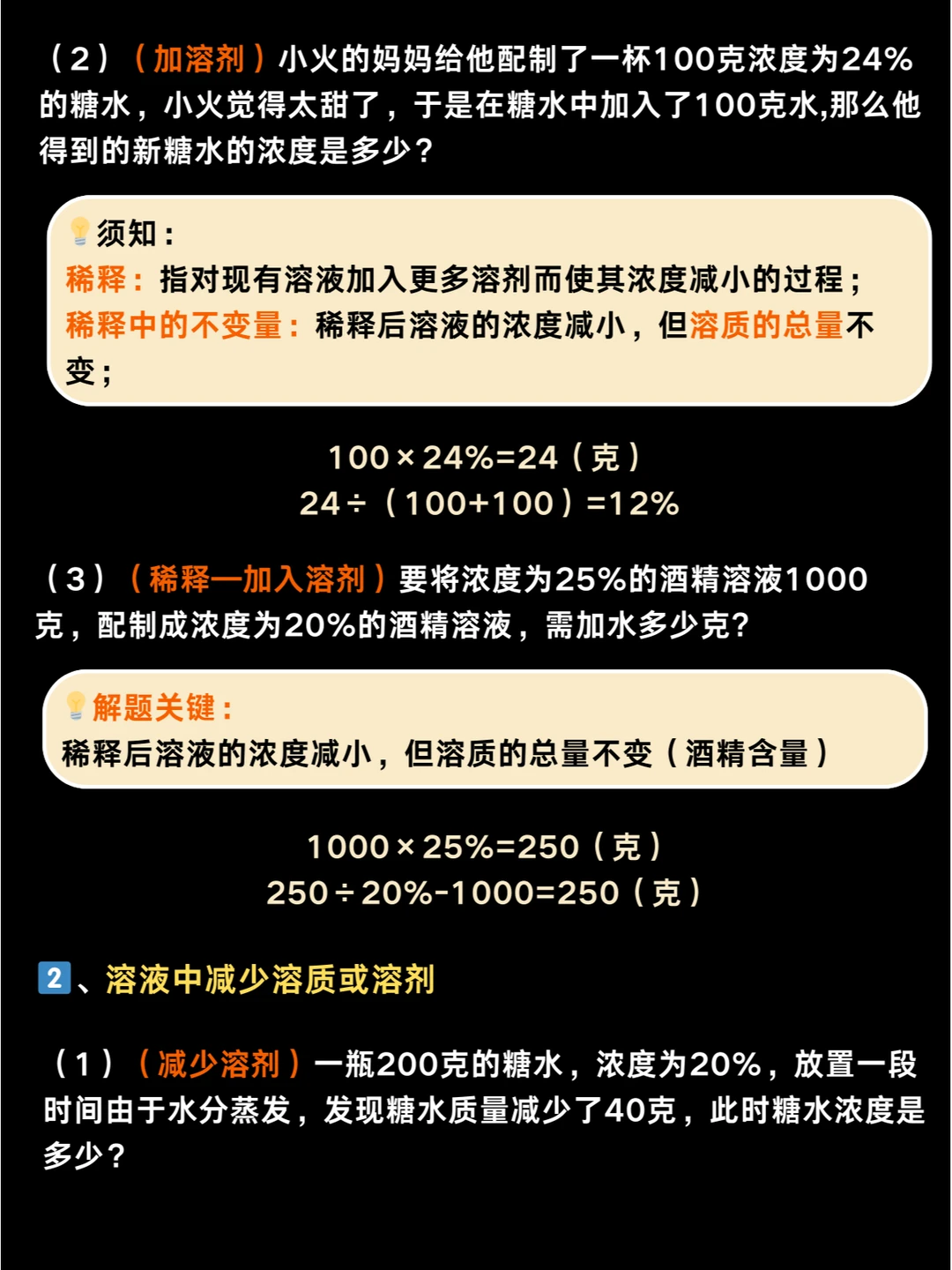 2️⃣、浓度=溶质÷溶液×100%