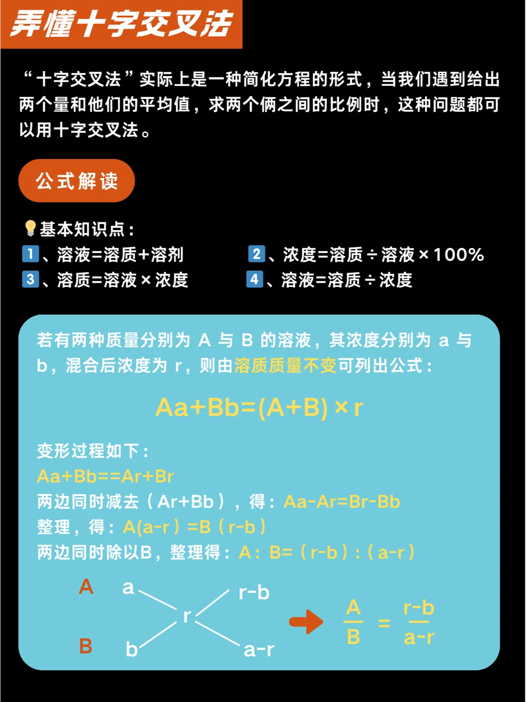 👉十字交叉法:实际上是一种简化方程的形式,若有两种质量分别为 A 与 B 的溶液,其浓度分别为 a 与 b,混合后浓度为 r,则由溶质质量不变可列出公式: Aa+Bb=(A+B)×r
