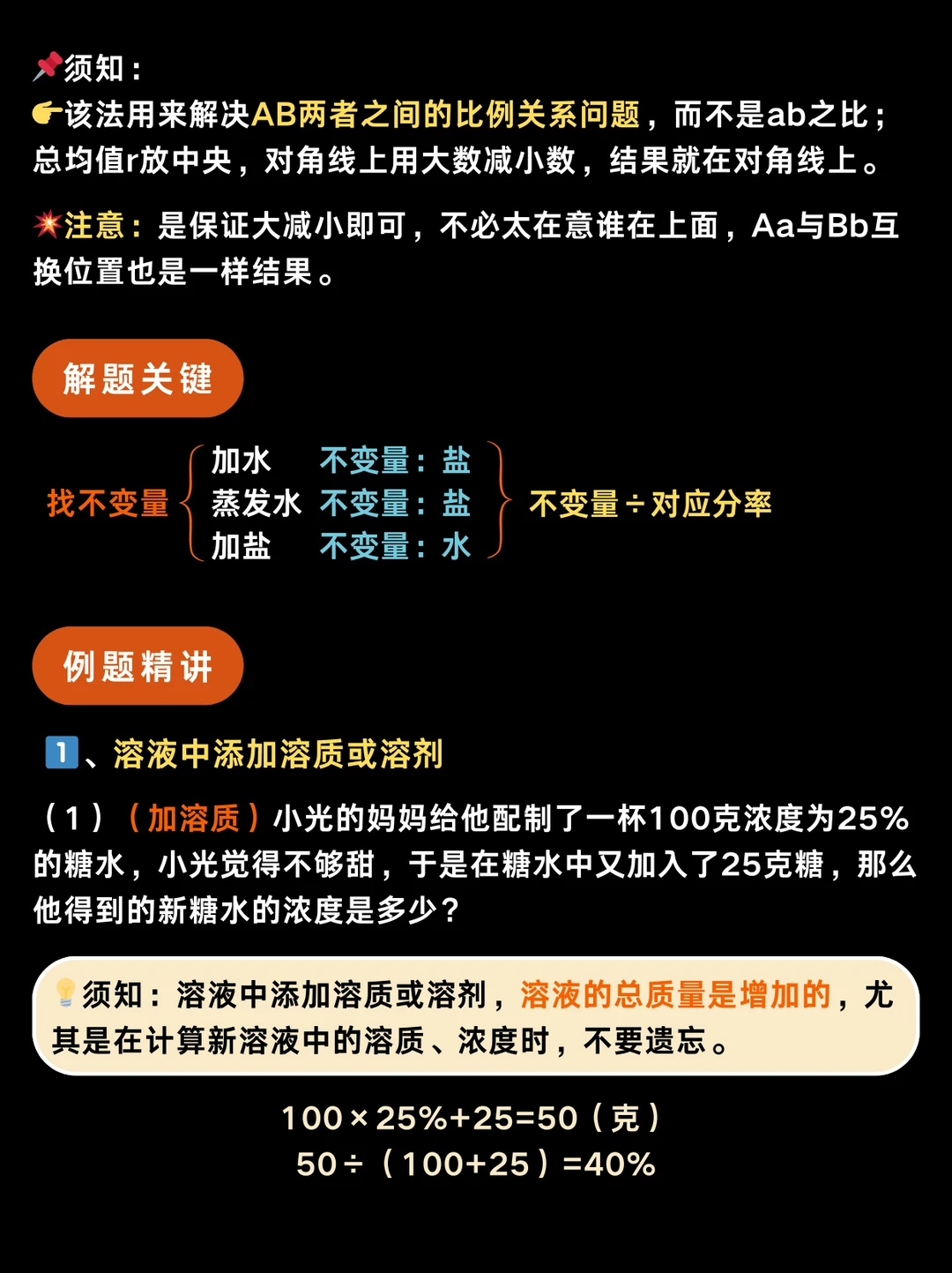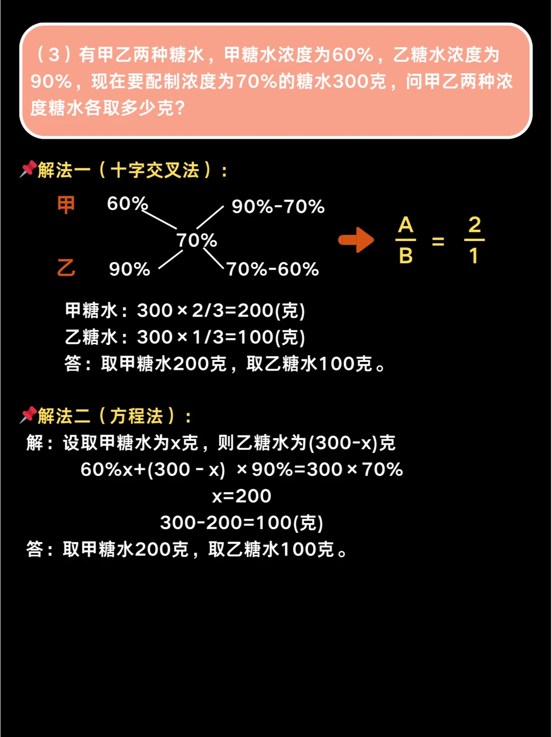 🔥须知:浓度问题,无论是稀释、浓缩还是配制,一定要转化为甲、乙两种溶液混合成第三种丙溶液,方可利用十字交叉法💥