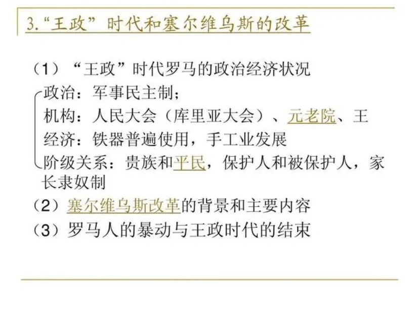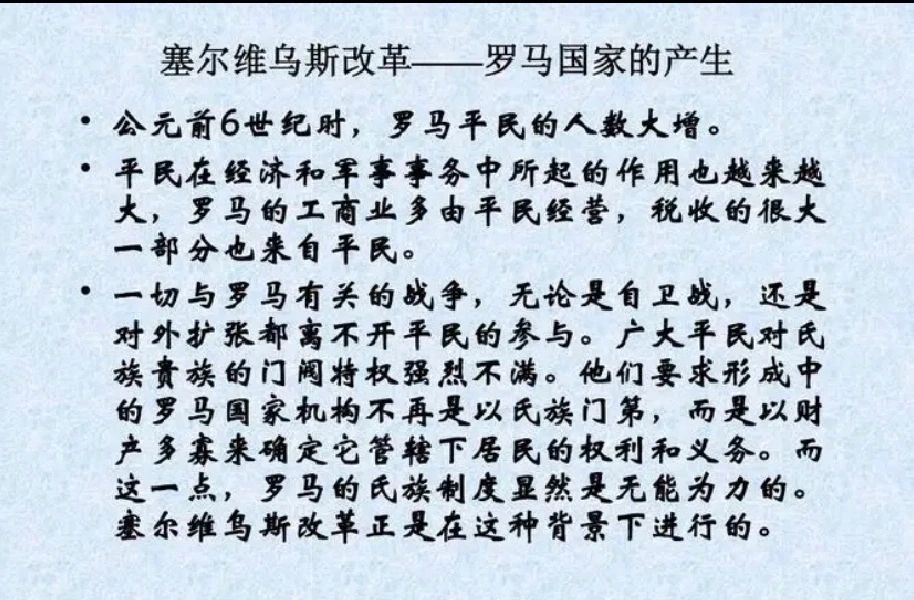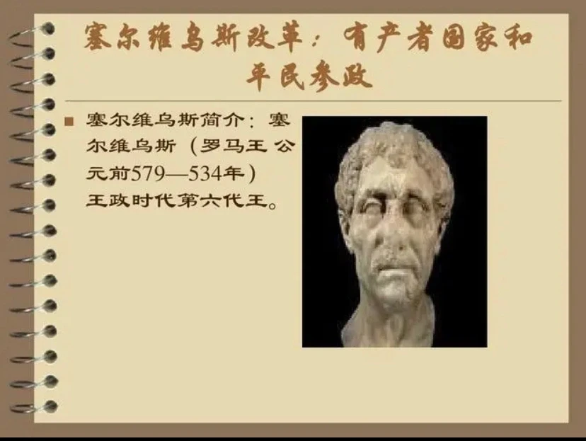 王政时代后期,为了适应当时社会发展和对外扩张的需要,增强罗马的实力,调整社会内部关系,第六王塞尔维乌斯实行了一系列改革。
