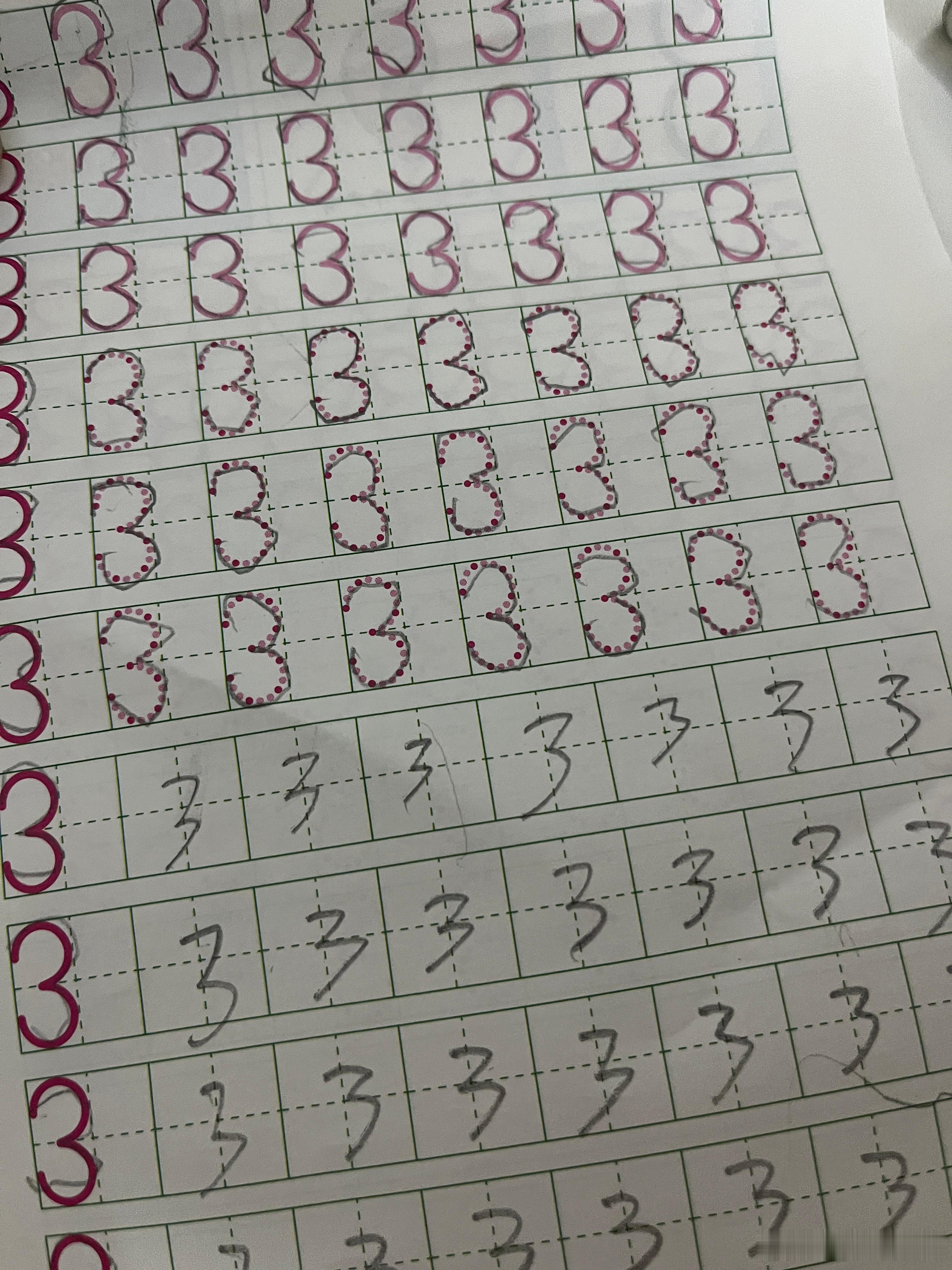 认真的娃,我给她读完书,准备带她睡觉,她说要写字,做作业。今晚写了3字,前面是她照着写的,后面是我教她写的。