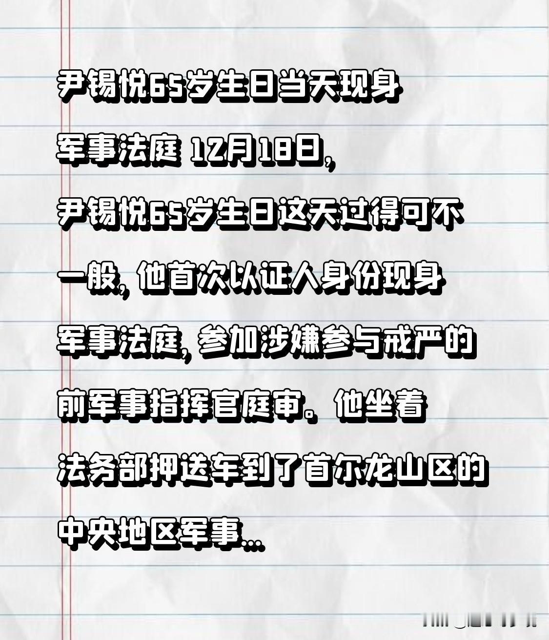尹锡悦65岁生日当天现身军事法庭 12月18日,尹锡悦65岁生日这天过得可不一般,他首次以证人身份现身军事法庭,参加涉嫌参与戒严的前军事指挥官庭审。他坐着法务部押送车到了首尔龙山区的中央地区军事法院,下车还短暂注视了下镜头,然后贴着墙进法庭,这画面还挺有戏剧性。 庭审一开始,尹锡悦就称检方滥用伪证,还表示原则上拒绝作证。之前他因为健康等原因缺席庭审,还被罚款500万韩元。生日不在家好好过,跑来法庭,这尹锡悦的生日可真是“别样精彩”啊。