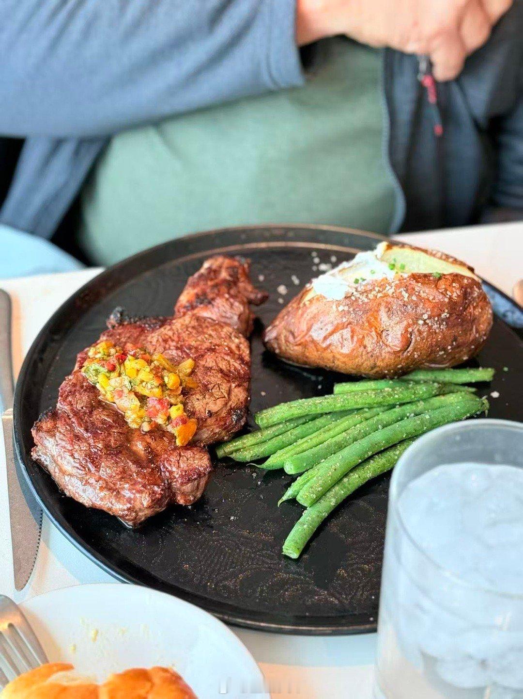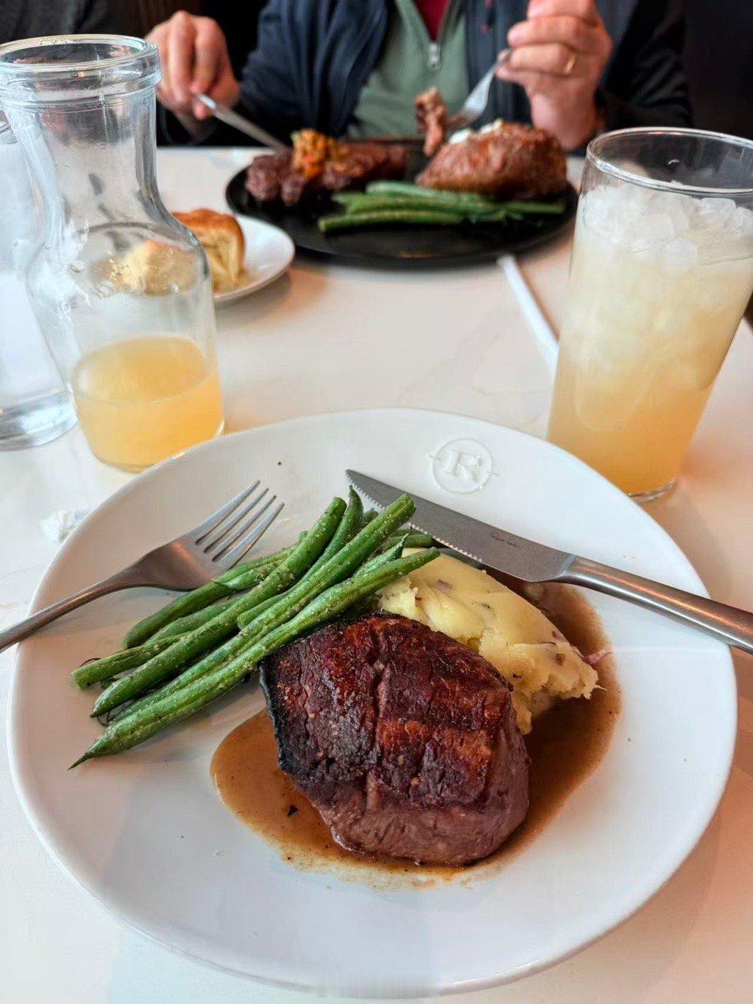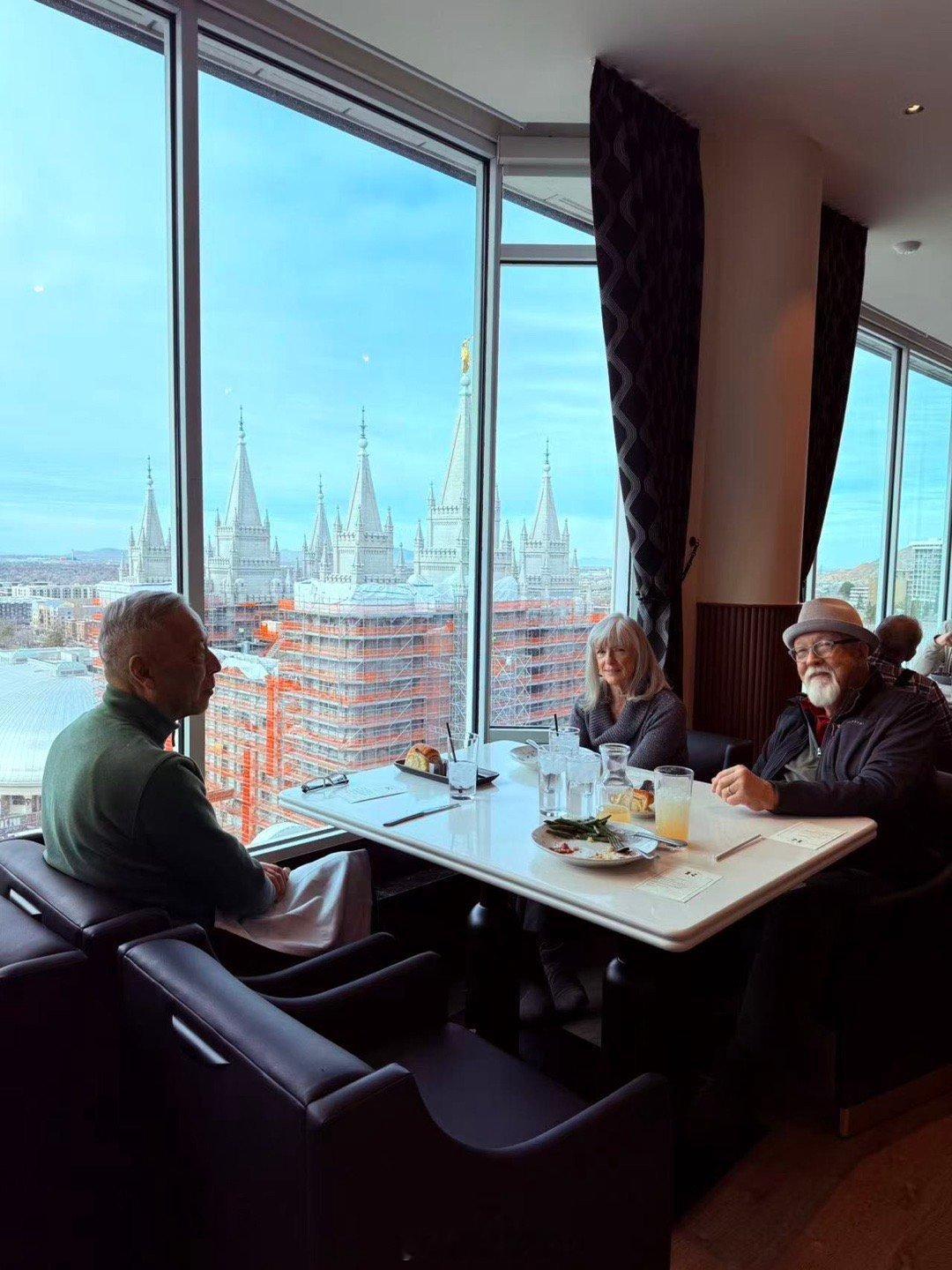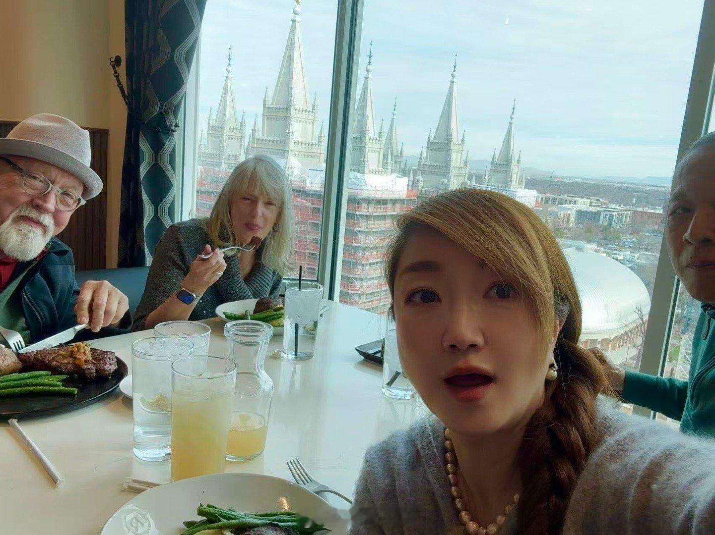 请吉哥grandparents在盐湖城Smith Memoreal Center10楼的The Roof餐厅用餐。图4是12oz ribeye, 图6是两份8oz filet之一,我不吃牛肉,点的是pork Osso Bucco(图7)。The Roof和隔邻的Garden restaurant 都是LDS enterprises,没有酒精饮料的。餐后甜点是他们的拿手,点了前菜,都没有拍。