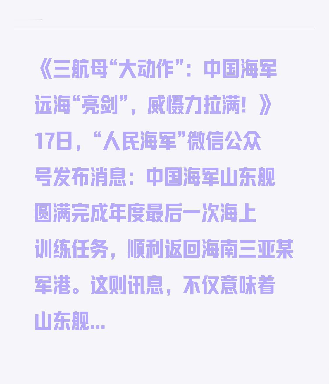 《三航母“大动作”:中国海军远海“亮剑”,威慑力拉满!》 17日,“人民海军”微信公众号发布消息:中国海军山东舰圆满完成年度最后一次海上训练任务,顺利返回海南三亚某军港。这则讯息,不仅意味着山东舰与辽宁舰同期开展训练,更在同一天,将福建舰的动态推至公众视野。中国三艘航母的动向,瞬间成为外界瞩目的焦点。18日,军事专家在接受《环球时报》记者采访时直言:这标志着航母编队体系全面作战能力实现质的飞跃,航母战略威慑力已然成型。 海军新闻发言人王学猛海军大校7日透露,中国海军辽宁舰航母编队于宫古海峡以东海域,有条不紊地组织舰载战斗机飞行训练。虽未与山东舰同框,但两大航母编队,分别在不同海域同时开展海上训练任务,这一事实,已然清晰呈现。 军事专家张军社18日向《环球时报》记者剖析道:“从时间维度审视,在南海海域训练的山东舰与北部西太平洋海域训练的辽宁舰编队,近乎同时现身南北两大海域。”尽管两支航母编队未开展联合训练,但这种几乎同步的训练安排,意义非凡。“这充分彰显我国现有航母编队,具备同时应对南北两个方向海上局势的能力,为国家主权和海洋权益的捍卫,筑牢坚实壁垒。” 12月17日,恰逢山东舰入列六周年纪念日。作为我国首艘完全自主设计、自主建造、自主配套的航空母舰,山东舰自2019年12月17日在海南三亚某军港交付海军以来,便肩负起重要使命。央视17日报道称:“入列至今,山东舰通过持续升级航空保障体系、开展实战化远洋训练以及进行双航母编队协同作战验证,已形成完整作战能力,并突破多项关键技术瓶颈。” 张军社指出,入列6年间,山东舰多次穿越所谓岛链,深入西太平洋海域开展远海训练,航迹不断拓展延伸。在与强敌对手的激烈较量中,山东舰体系作战能力与远海作战能力持续提升,制空、制海及对陆打击等全面作战能力日臻成熟,战术技术水平稳步上扬。 国际媒体法新社等援引台湾地区消息称,福建舰16日航经台湾海峡,且强调“这是中国最新最先进的航母,上月正式服役以来首次穿越台湾海峡”。台湾地区发布的福建舰影像显示,模糊的黑白画面中,航母甲板上未停放任何舰载机。台相关部门推测,福建舰可能正前往上海长兴岛——造船厂所在地。 对此,张军社分析认为,福建舰此次穿越台湾海峡,有可能是返厂保养。“福建舰此前从东海转至南海期间,开展了多项实验、海事活动及训练,此次返厂或针对发现的问题进一步优化性能。”不过,他也表示,亦有可能是开展跨海区训练,舰载机可从内地转场至航母。 自11月福建舰入列,中国正式步入三航母时代,近期三艘航母的动态备受关注。先是辽宁舰穿越宫古海峡,进入西太平洋展开训练;接着福建舰通过台湾海峡北上,驶入东海;山东舰则结束今年最后一次训练,形成全面作战能力。 “近年来,中国军队建设发展动向,尤其是航母这一大国重器的发展,备受国际社会关注,周边国家及国际社会的目光,始终紧紧追随。”张军社说道。 他进一步深入分析,三航母动向受到密切跟踪与高度关注,这无疑是航母编队体系作战能力质变的生动体现,航母战略威慑力已然形成。航母编队远海作战能力与战略威慑能力的提升,有力推动中国海军由近海防御型向远海防卫型转变,标志着中国海军远海攻防作战能力再上新台阶,海上防御作战纵深进一步拓展,中国军队“御敌于国门之外”的作战能力愈发强劲。 “此次中国海军辽宁舰航母编队进入太平洋西部海域开展远海训练,便是典型例证,也是中国海军远海行动和作战能力提升的生动缩影。”张军社表示,辽宁舰航母编队通过宫古海峡北上进行训练,虽属常态化远海训练,却充分展示出航母编队强大的远海行动和作战能力。面对日本军机的抵近滋扰,航母舰载机采取有理、有利、有节的应对举措,既符合国际法和国际惯例,又展现出高超的战术技术水平。海军更强大 三艘航母 航母舰队 三航母封锁台湾 航母训练 航母航行 三航母军演