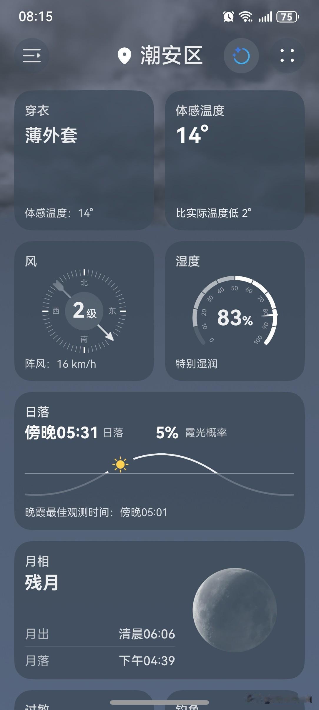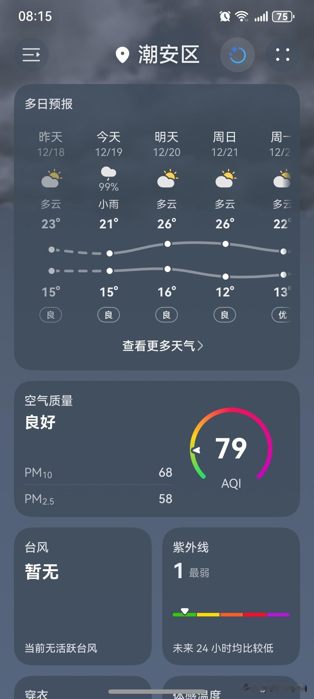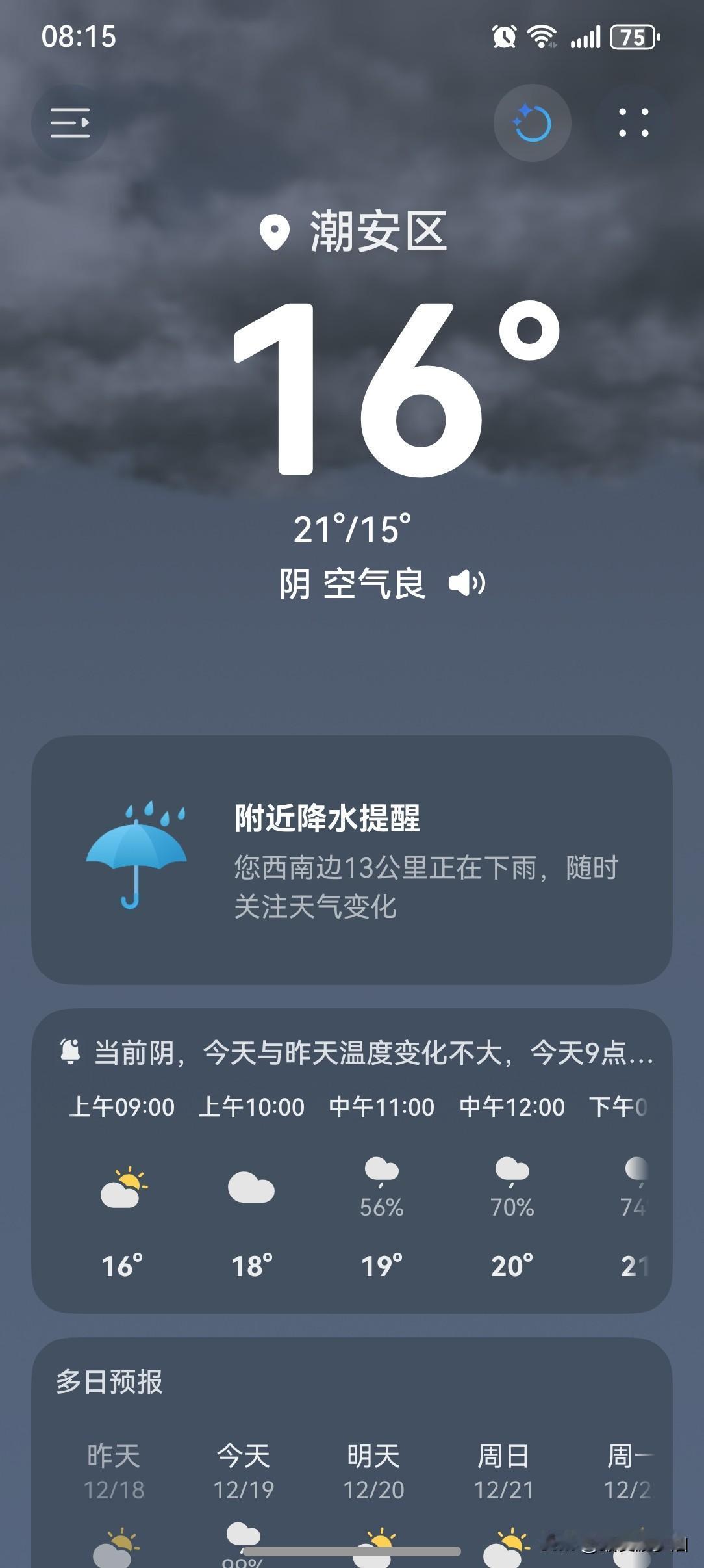 广东晴燥持续防火不能停!未来几天,广东天气依然是以晴燥为主,附赠些许散装雨。 今天(19日),珠江口东侧到粤东市县多云间阴天,有小雨,外出的小伙伴们出门记得带伞,最好把外套也带上。 今天(19日)潮州喜提一个阴天有小雨天气,气温15~21℃,此刻气温16℃,体感温度14℃。 早上天气阴沉,偶尔飘落些零星小雨,再加上风一吹,体感有些阴冷。 早上出门时顺手把外套也带上了,这样的阴雨天气,说降温就降温,极速式的,会让人措手不及的。保险起见,还是多带件衣服,以防万一。 看看现在的天气,云量又比昨天多了一些,阳光薄弱的地方甚至还隐隐约约能看到一点阳光。 这天气也不能算不好吧?还是要给个好评的! 如此天气!元芳,你怎么看? [笑哭][捂脸][灵光一闪][笑哭][捂脸][我想静静][捂脸][捂脸]