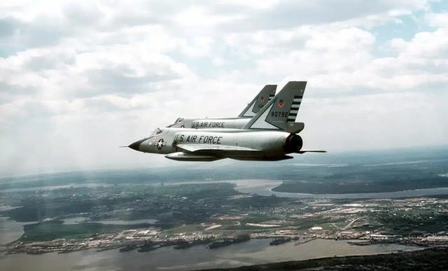 70年代,两架F-106"三角标枪"正在查尔斯顿海军基地上空飞行,它们隶属兰利空