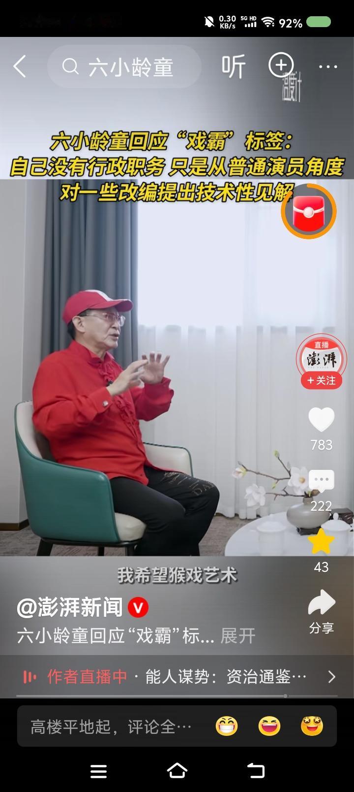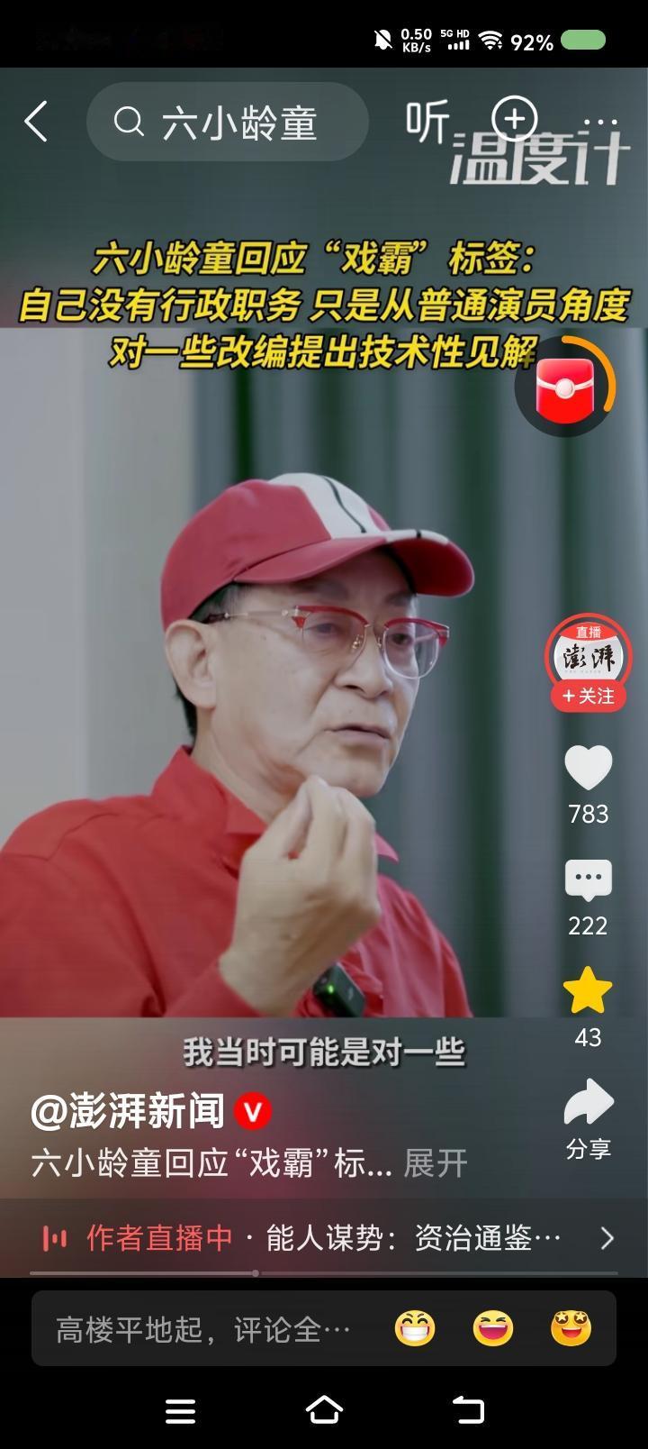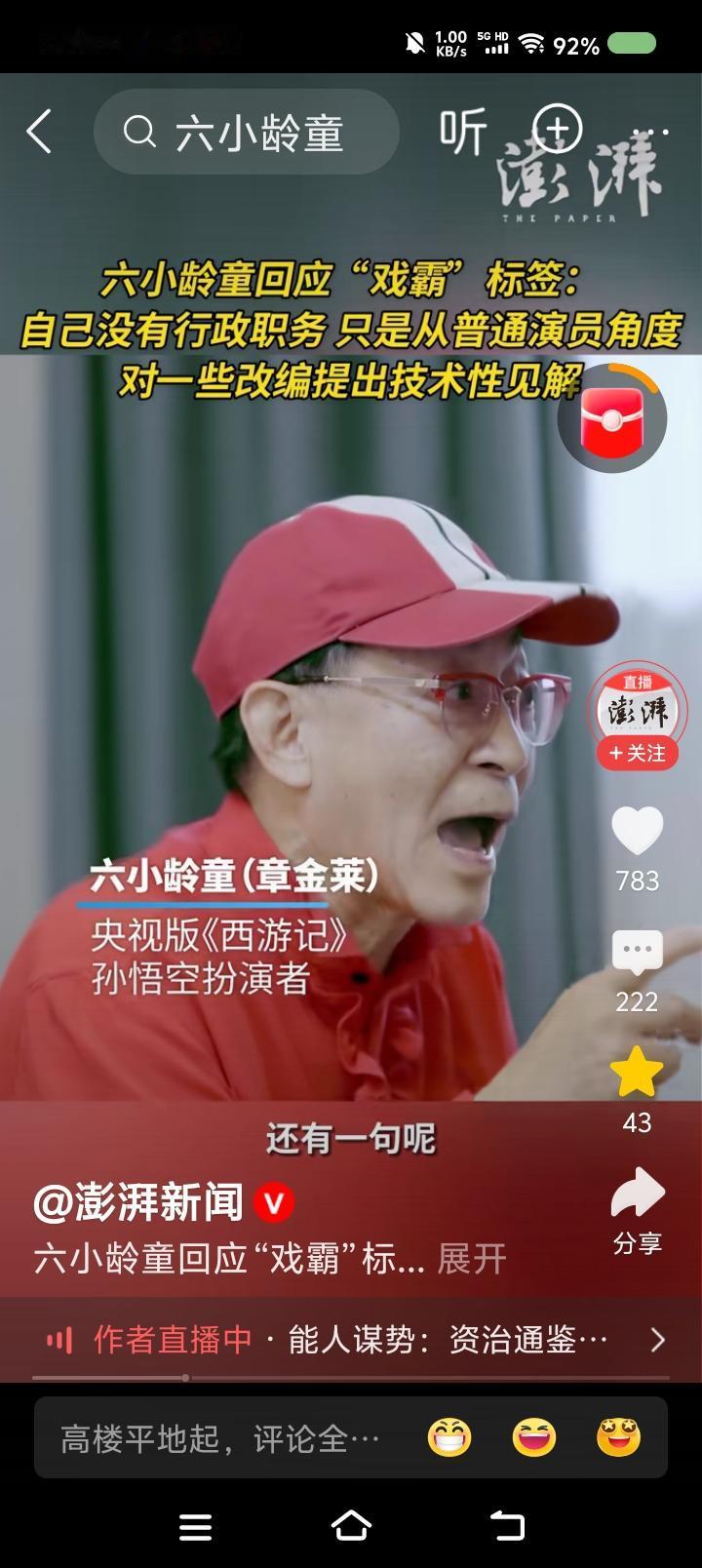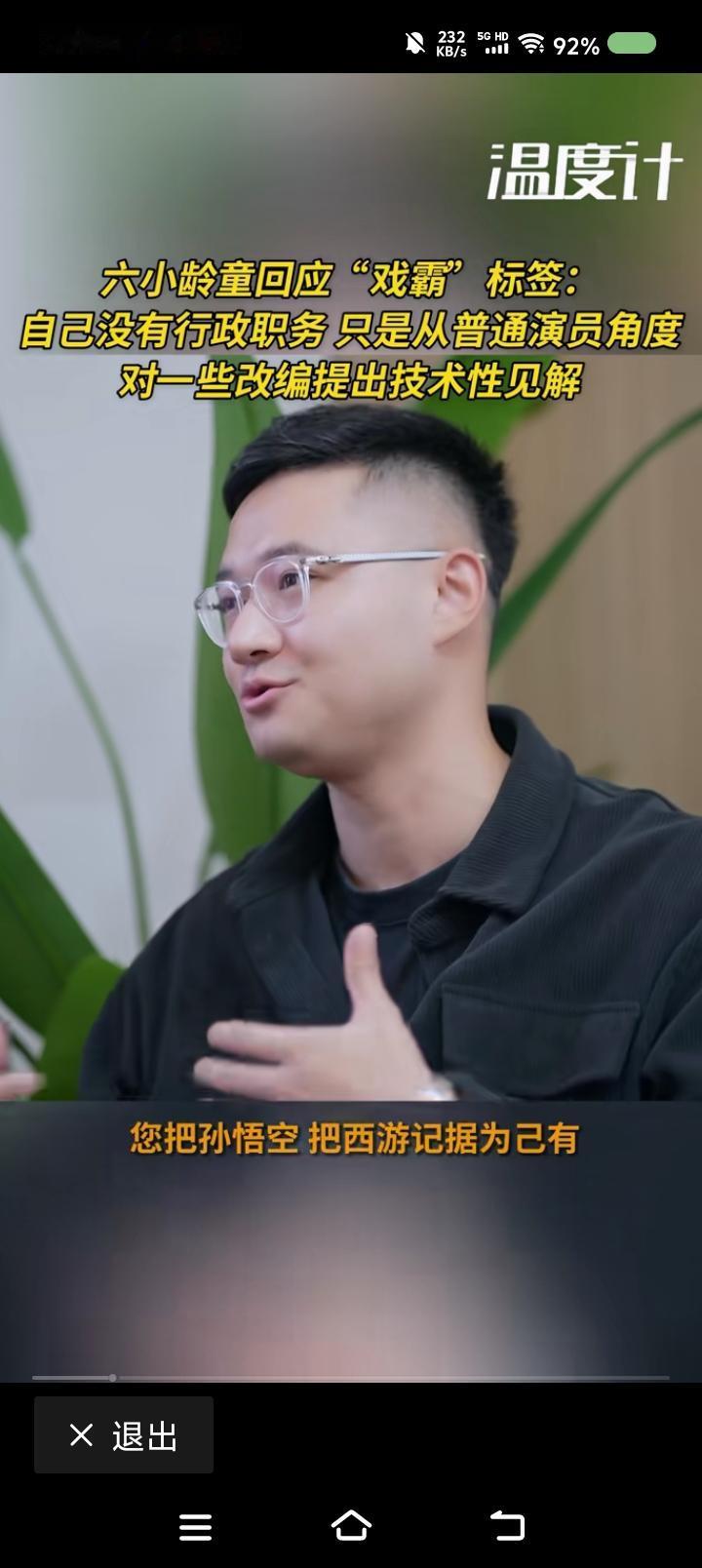 六小龄童回应“戏霸说”—— 据报道,记者问六小龄童:“有人说你把孙悟空、《西游记