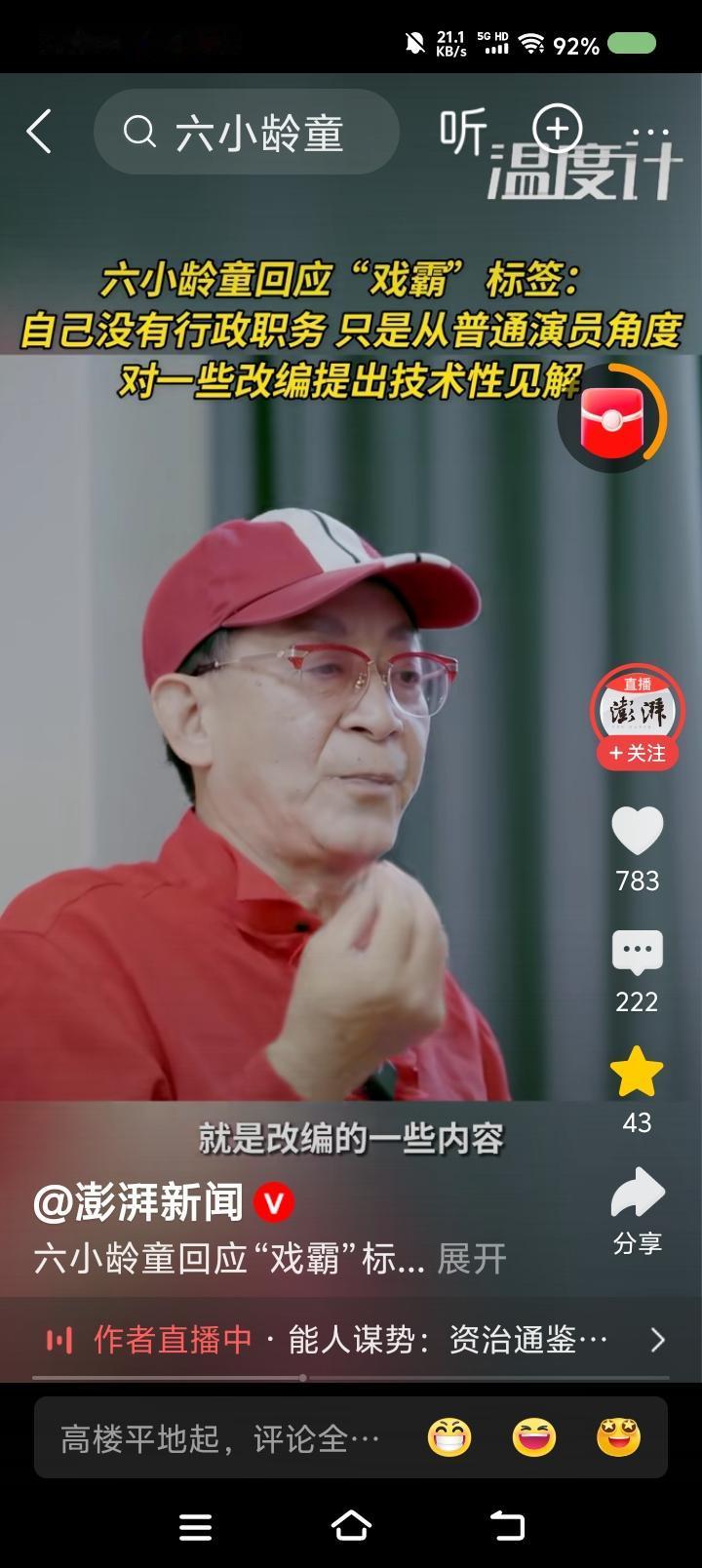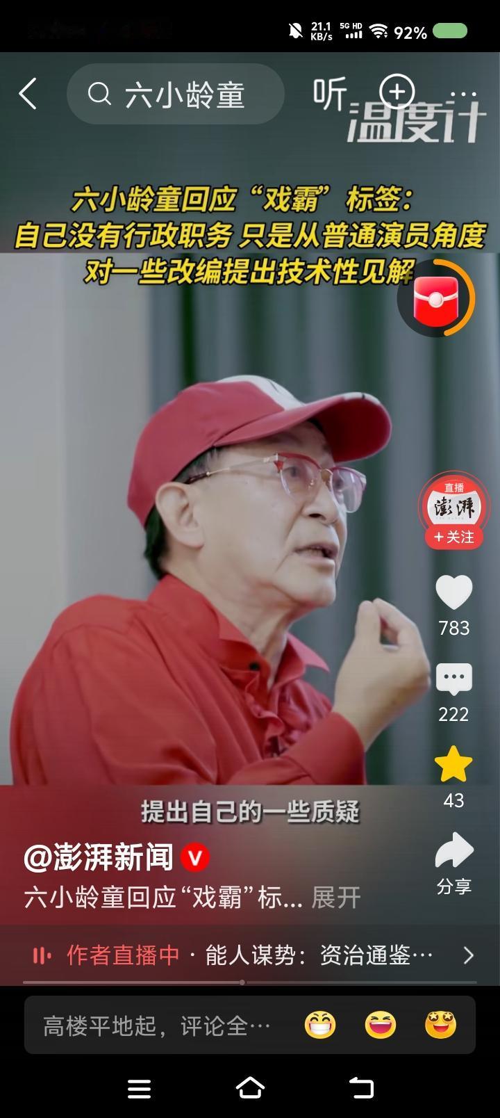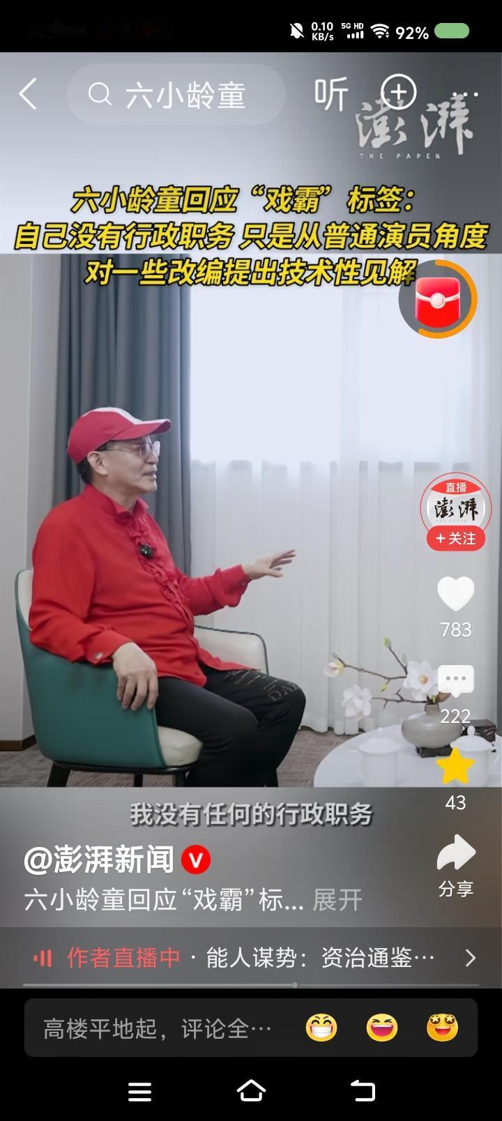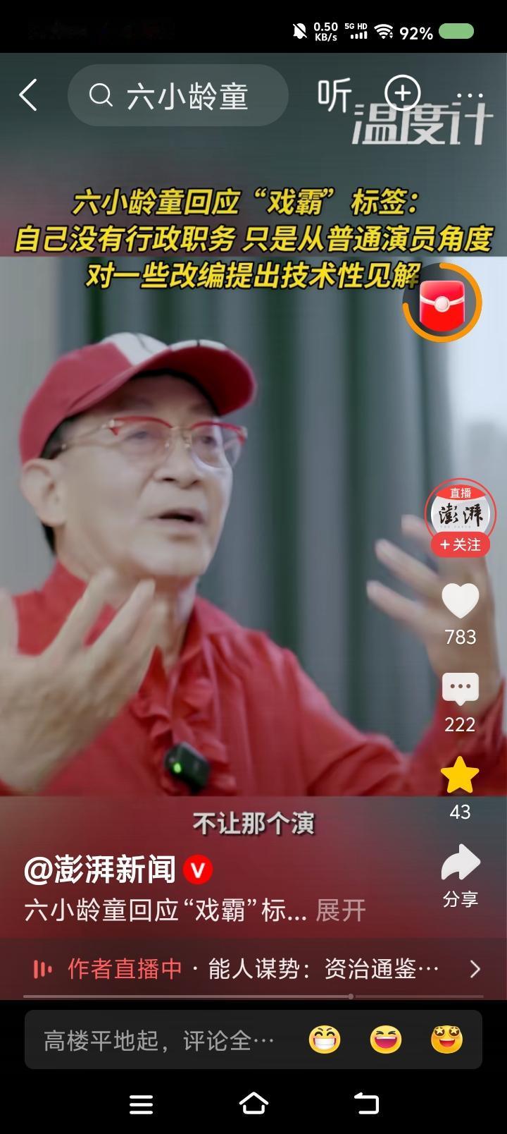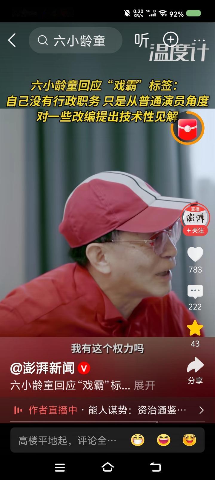 六小龄童回应“戏霸说”—— 据报道,记者问六小龄童:“有人说你把孙悟空、《西游记