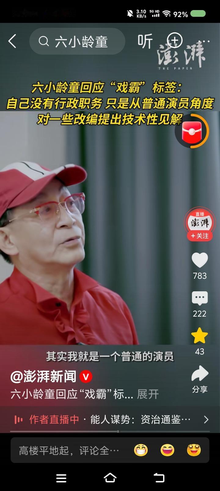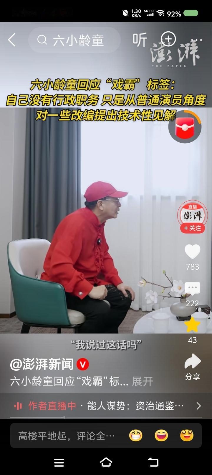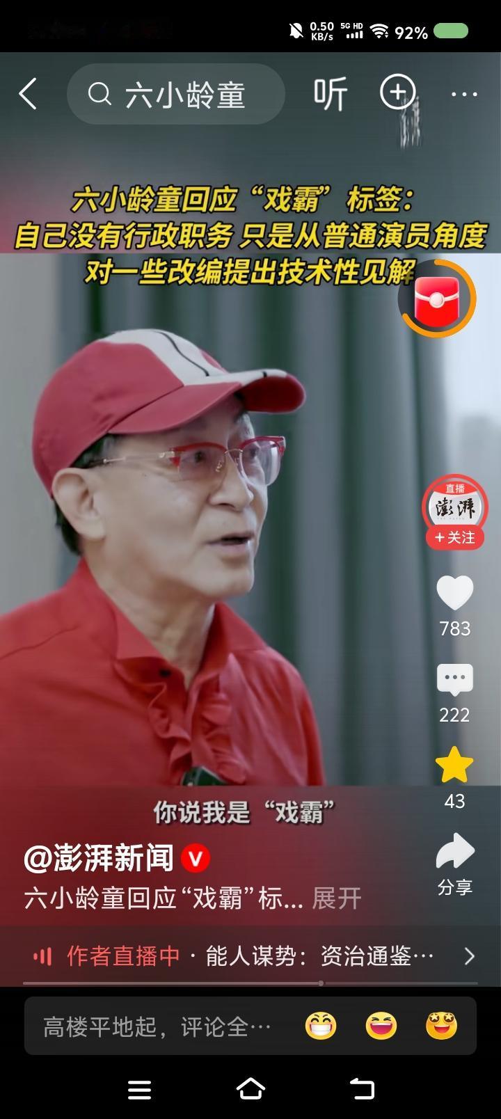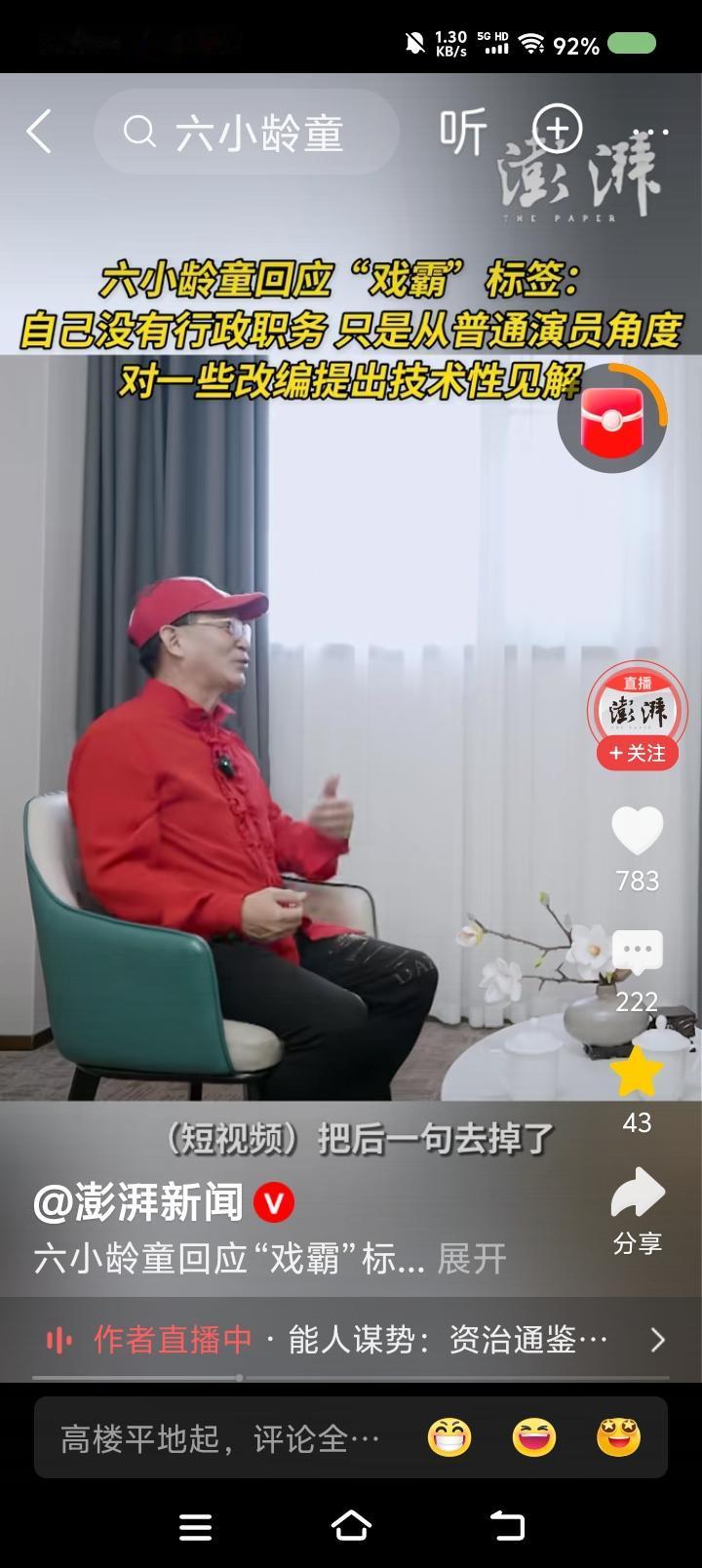 六小龄童回应“戏霸说”—— 据报道,记者问六小龄童:“有人说你把孙悟空、《西游记