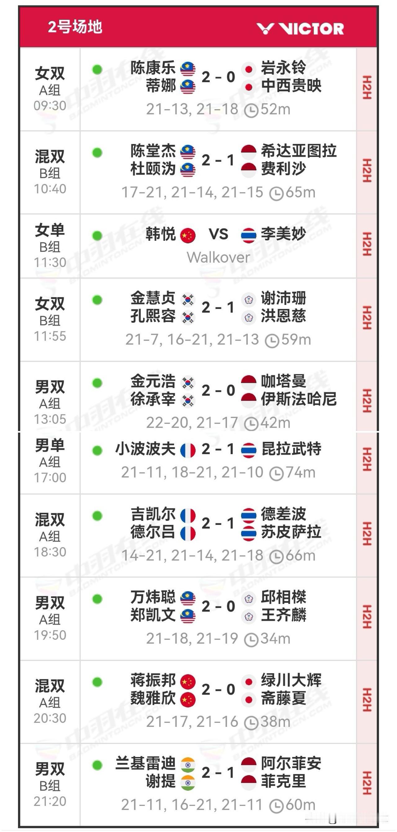 12月18日世界羽联年终总决赛小组循环赛战报 昨日小组赛中,国羽斩获8胜1负的佳绩。不过,李诗沣连输两局,败于奈良冈功大,至此已连输两场,出线希望渺茫。石宇奇、王祉怡、圣谭组合、凤凰组合和酱板鸭组合则提前出线。而韩悦、梁王组合以及贾一凡/张殊贤,出线形势不容乐观。详细战报如下: 羽毛球羽毛球爱好者 羽毛球比赛 羽毛球赛事 羽毛球赛程 石宇奇 李诗沣