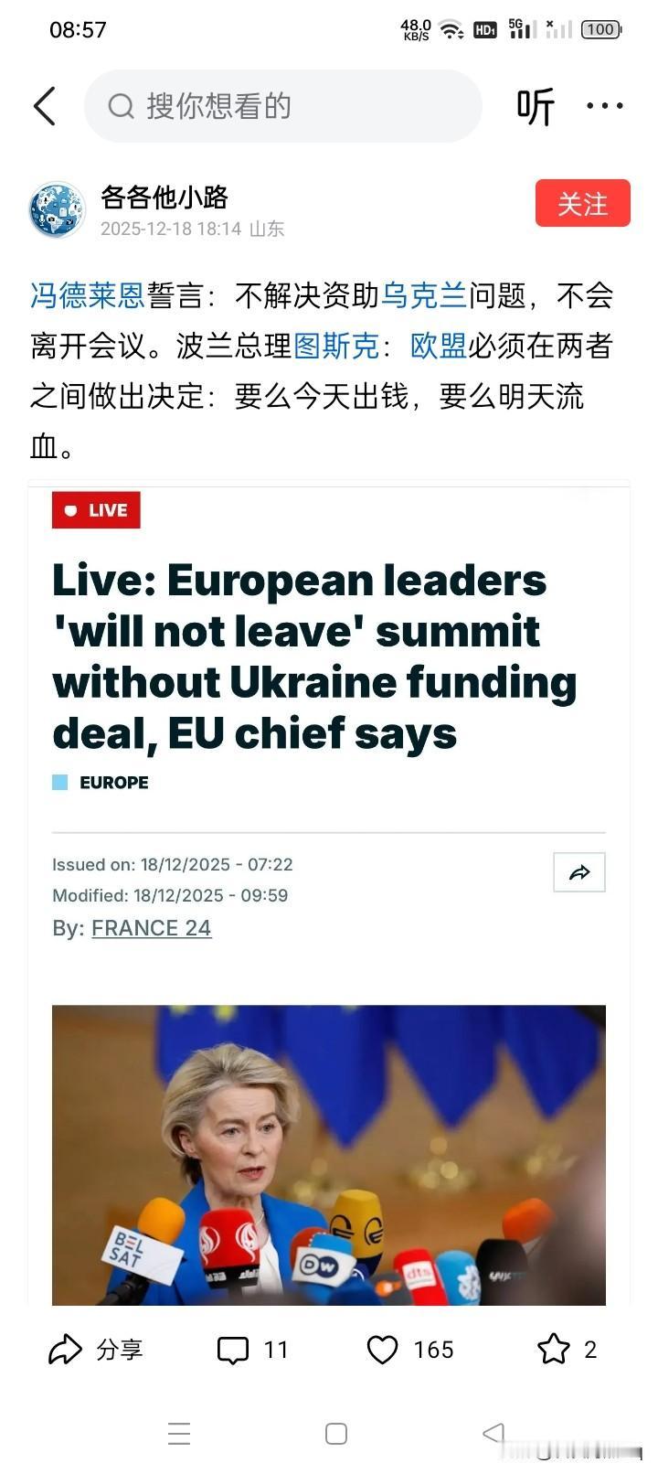 立马回手一耳光? 真的是很无语,刚刚才见网络上似乎洋洋得意的网文:“欧盟作出了理智决定”。俄罗斯卫星通讯社12月18时消息说。匈牙利总理欧尔班似乎是大出一口长气,他在布鲁塞尔的欧盟国家峰会进行中表示:欧盟委员会从欧盟峰会中移除了没收俄罗斯资产的问题。 欧尔班的话音似乎尚未散去,欧盟委员会主席冯德莱恩就誓言:不解决资助乌克兰的资金问题,谁都别想离开峰会。 而且波兰总理图斯克颇具威胁性的说:要么今天出钱,要么明日流血。 那么,这种情况如果摆在任何一个人面前,你又会作出什么样的选择呢?