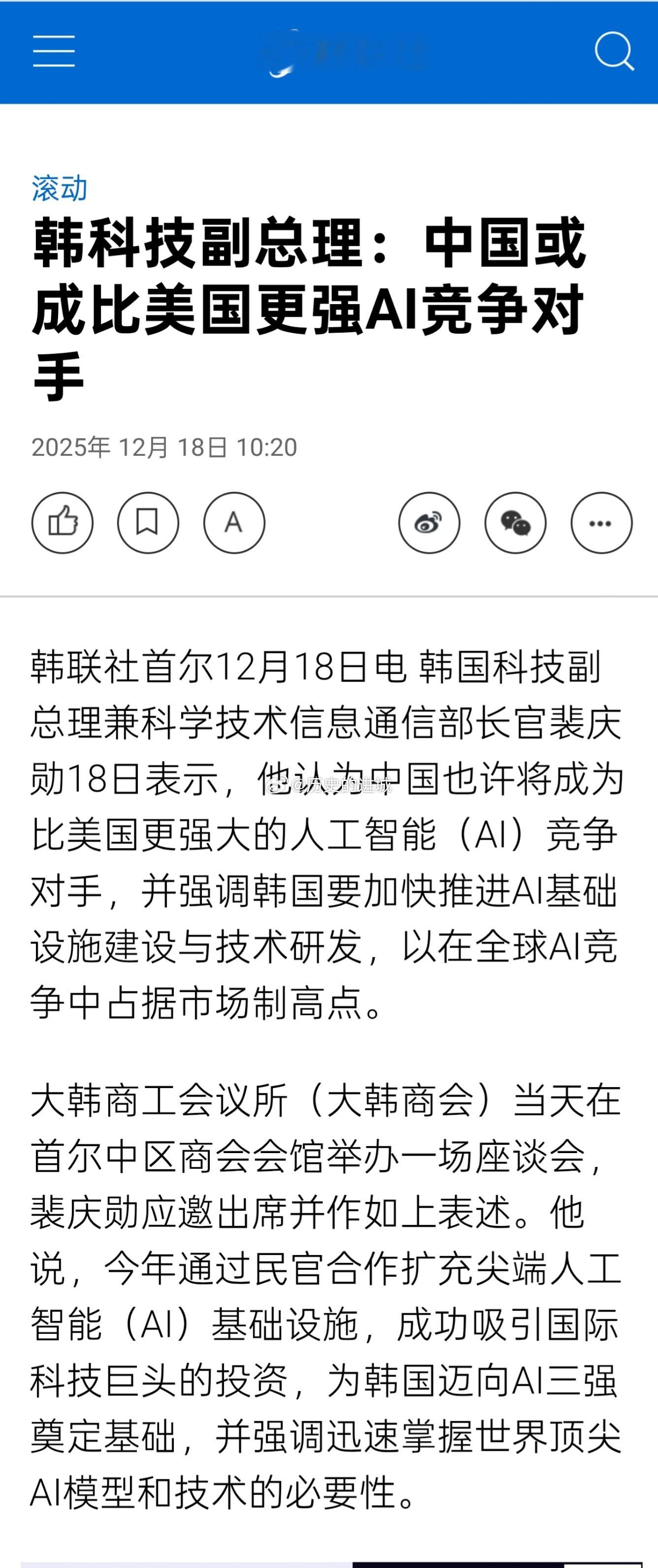 韩国科技副总理兼科学技术信息通信部长官裴庆勋18日谈及全球AI格局是时表示,裴庆勋指出,美国在AI方面投入巨大、成果显著,但中国同样不可小觑,甚至可能成为更强大的竞争对手。他认为,韩国可以在美中之间找到自身定位,但仍有大量准备工作需要完成。他说,韩国今年通过民官合作扩充尖端人工智能(AI)基础设施,成功吸引国际科技巨头的投资,为韩国迈向AI三强奠定基础,并强调迅速掌握世界顶尖AI模型和技术的必要性。AI三强,韩国挺有想法的。