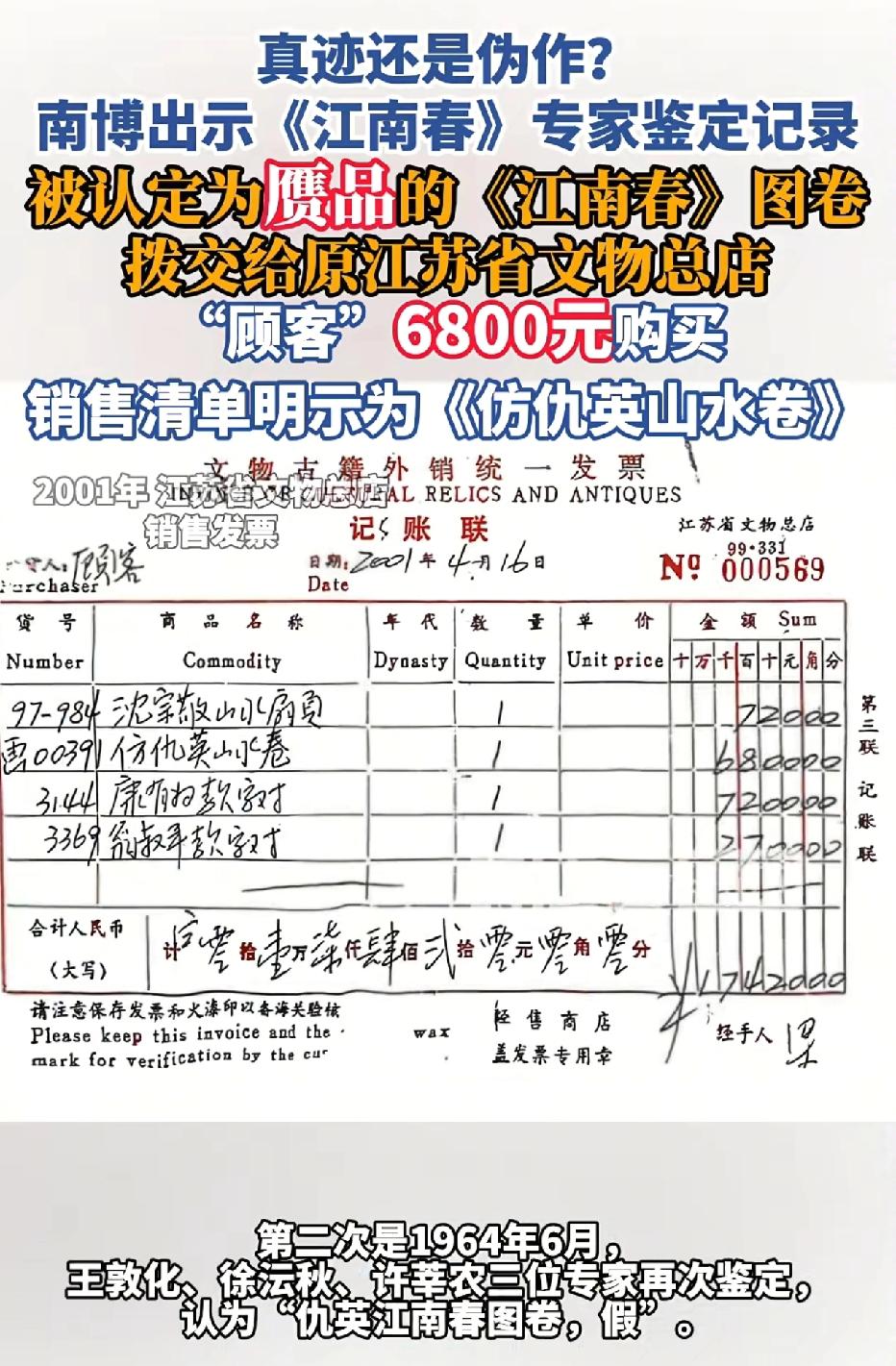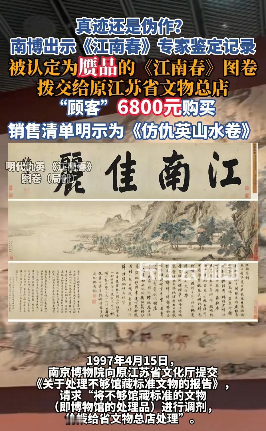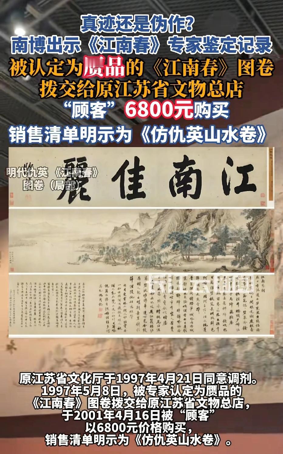 新华社追踪《江南春》图流落拍卖场的原因,大致内容:庞氏捐赠后,在1961年,1964年进行专家鉴定为“赝品”后搁置收藏,直到1997年4月15日,南京博物院向江苏文化厅提交处理意见被批准,在1997年4月22日被调剂处理。1997年5月8日“赝品”《江南春》交给了江苏文物总店,2001年 4月16日被江苏文物总店以6800元卖给顾客,直接流入民间。再加上最近拍卖的《江南春》确实有庞氏的私印,可以确认就是南京博物院处理的“赝品”《江南春》。所以问题来了。首先,南京博物院鉴定为“赝品”,为什么北京拍卖会会鉴定为“真品”?其次,庞氏捐赠的物品,既然为假,为什么不通知后人?后人发现后,很长时间不回复是什么意思?最后,“赝品”《江南春》卖了6800元,这笔钱归谁?难道捐赠者捐了文物,被验证为赝品,就可以买卖营收吗?不过当时验证的专家以及经手馆长大部分都不在了,估计查证很悬!