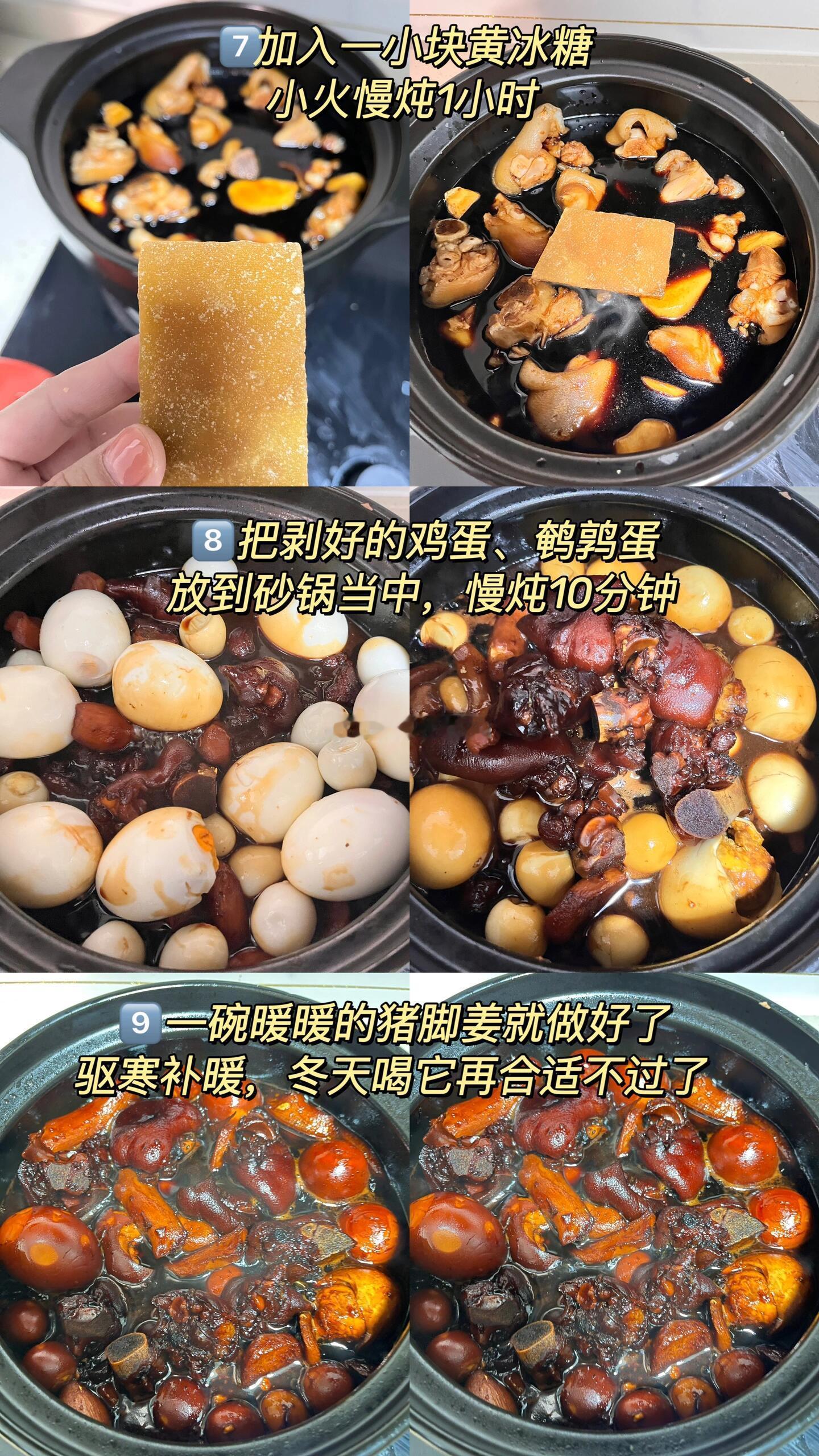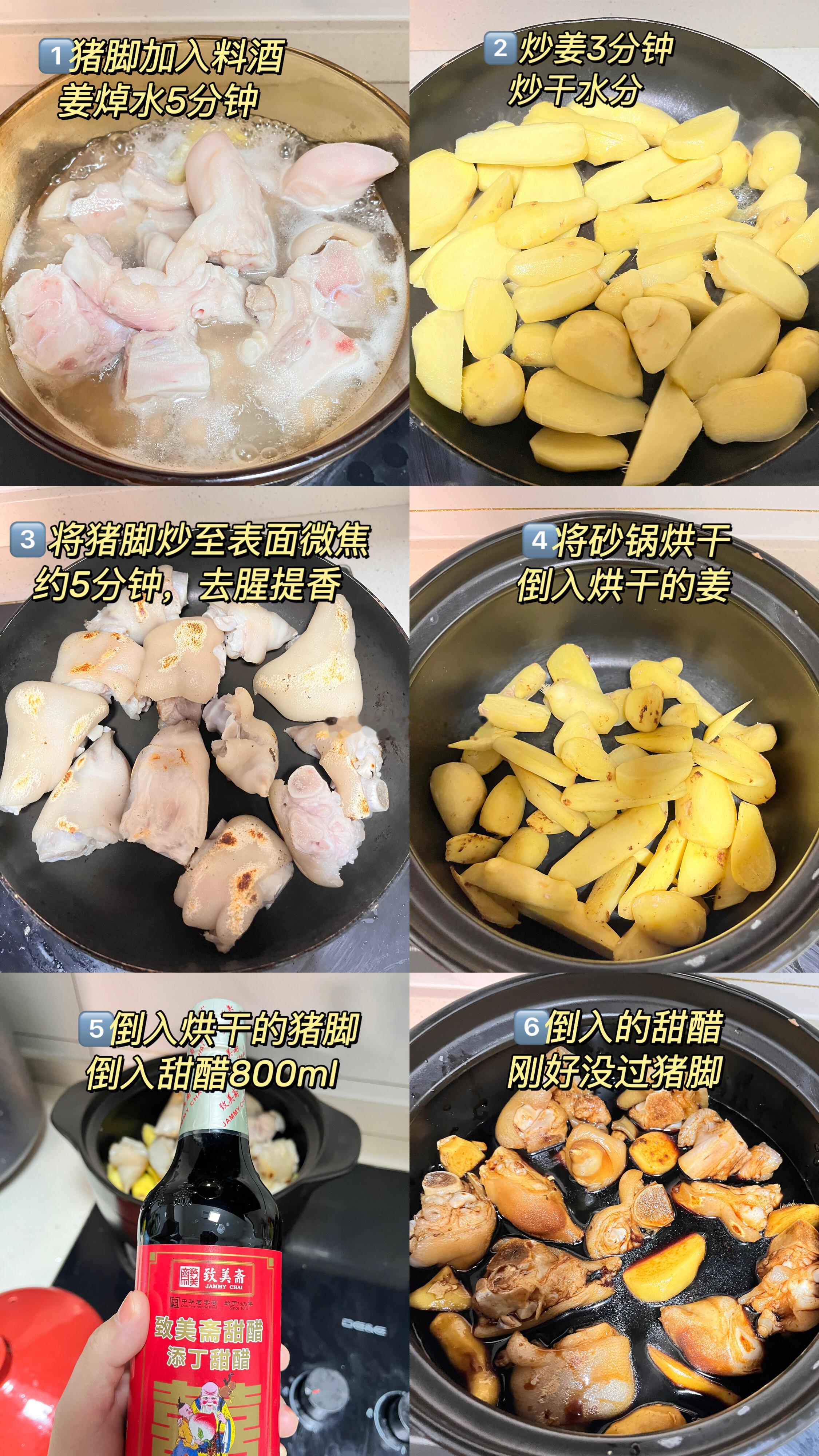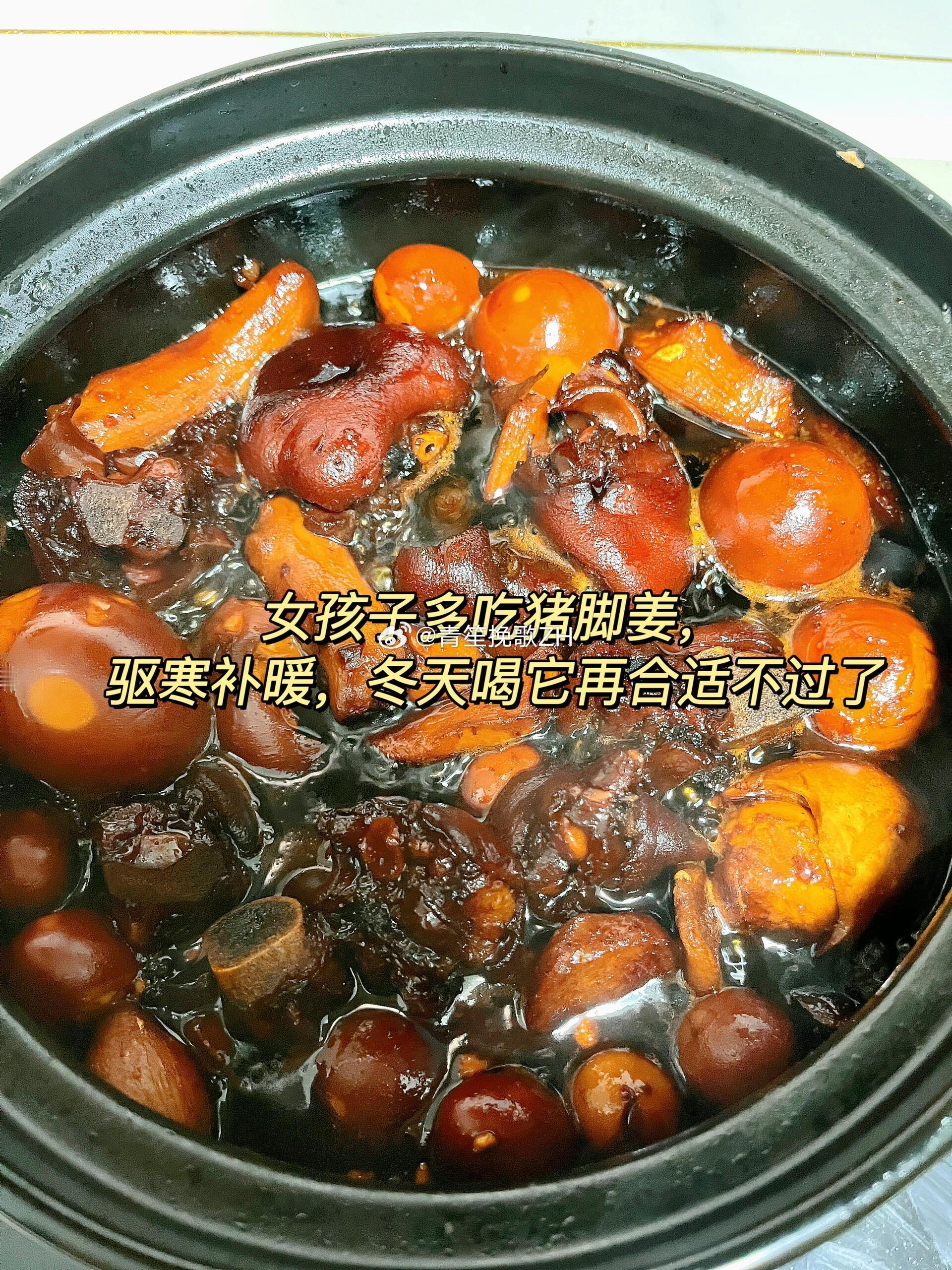 广州街头20元一份的猪脚姜女孩子冬天一定要多吃猪脚姜!👍猪脚姜醋是广府人坐月子必不可少的滋补品,也很适合冬日来上一碗,驱寒保暖补气血。分享猪脚姜制作教程🌷〰️〰️〰️ 〰️〰️〰️ 〰️〰️〰️ 〰️〰️〰️ 〰️〰️〰️【食材准备】:半只猪手、小黄姜半斤、嫩姜半斤、致美斋甜醋2瓶、鸡蛋8个、鹌鹑蛋20个,半块黄片糖。【制作步骤】:1⃣️猪脚加入料酒、姜焯水5分钟2⃣️ 炒姜3分钟炒干水分3⃣️ 将猪脚炒至表面微焦约5分钟,去腥提香 4⃣️将砂锅烘干后才能倒入炒干的姜5⃣️倒入炒干的猪脚及甜醋6⃣️倒入的甜醋,刚好没过猪脚和姜7⃣️加入一小块黄冰糖,小火继续慢炖1小时8⃣️把剥好的鸡蛋、鹌鹑蛋放到砂锅当中,慢炖30分钟9⃣️一碗暖暖的猪脚姜就做好了,驱寒补暖,冬天喝它再合适不过了✅冬日降温来一碗暖暖的猪脚姜,吃完整个人都暖暖的,驱寒保暖补气血,想吃的姐妹赶紧自己动手做起来吧😋温暖的食光好好拍照的一年晒出我的年度兴趣 广州街头20元一份的猪脚姜