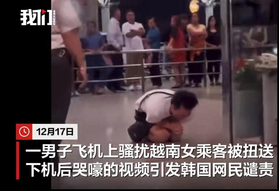 韩国男子因骚扰女乘客被扔下飞机,跪在门口哭着求工作人员让他上飞机 在胡志明飞往釜山的航班上,韩国男子多次骚扰女乘客,被乘务人员劝阻之后仍然继续骚扰,随即被机场警察扭送下飞机,这时他突然跪地上哭喊“我要上飞机” 越网友:活该被禁飞,从海里游回去吧