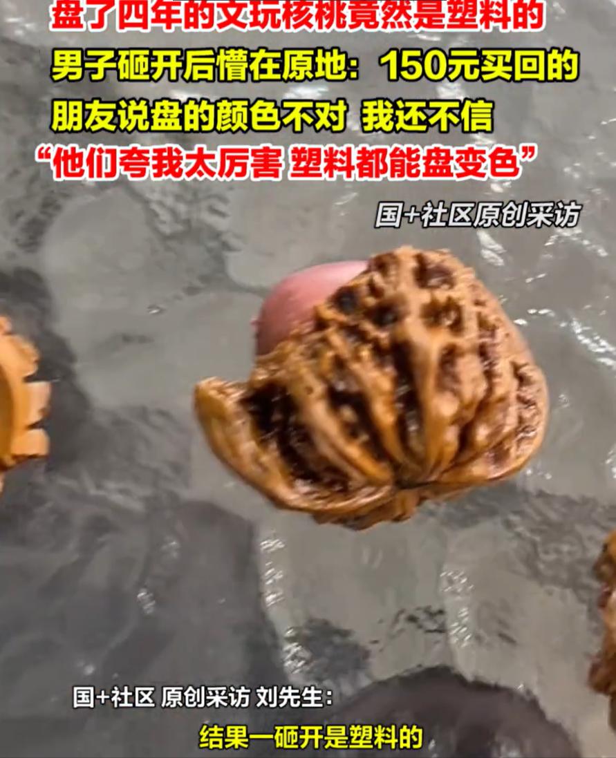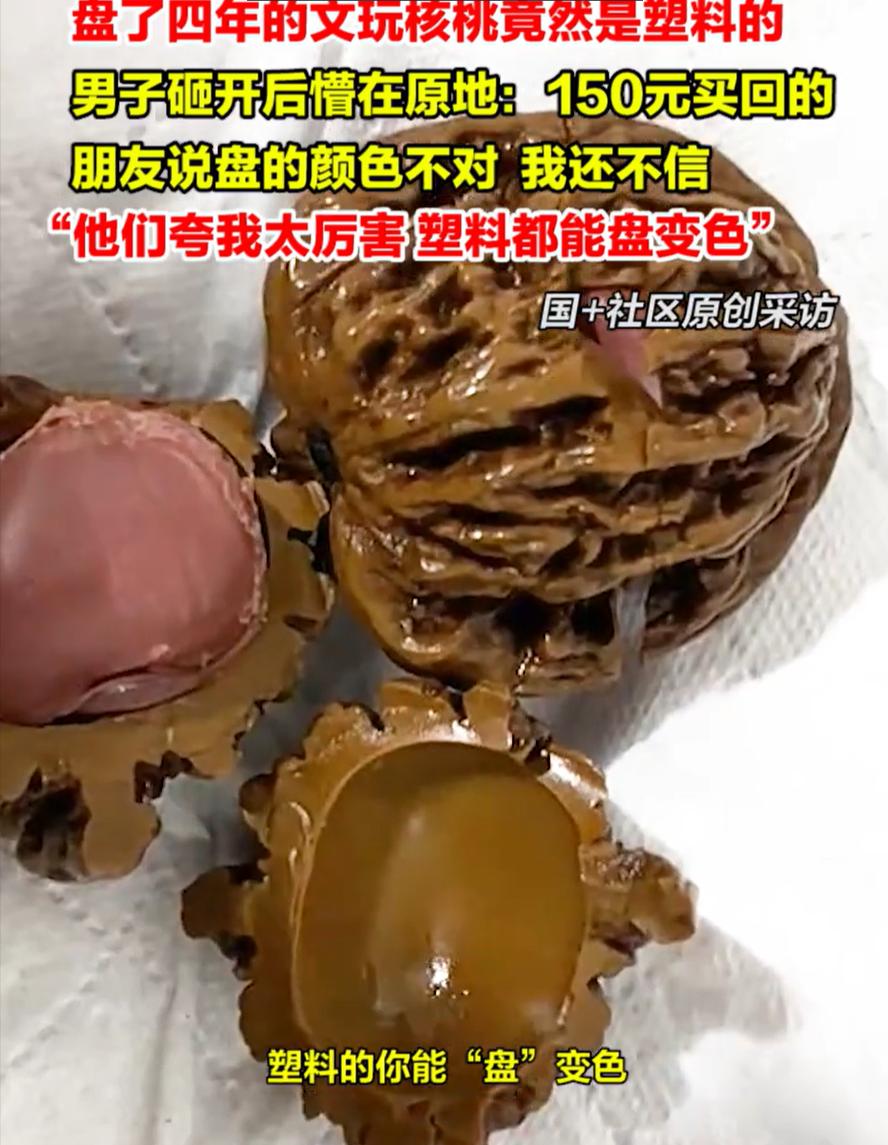 伤害性不高侮辱性极强!河北唐山,男子盘了四年文玩核桃,结果给朋友展示时,对方一眼就指出他这个有问题,一开始男子还不信,结果砸开一看,才发现是塑料的,盘了四年就算了,当初他还花了150块钱购买的。男子说朋友们都夸他“太厉害”,连塑料都能盘变色! 河北唐山,男子李哥(化姓)的手里攥着两半碎裂的“文玩核桃”,脸色一阵红一阵白。这对被他精心盘玩了四年、磨得油光锃亮的宝贝, 在朋友一句“看着不对劲”的提醒下,竟被证实是塑料仿制品。四年的心血投入,到头来成了圈子里的笑谈,连当初150块的购买价,都成了无法回避的尴尬。 四年前,李哥在本地一个文玩集市上一眼看中了这对核桃。摊主说这是天然麻核桃,纹路饱满、配对整齐,是盘玩的好料子。 李哥本就对文玩核桃感兴趣,当场就付了150块钱买了下来。从那以后,这对核桃就成了他的随身物件,不管是上班休息间隙,还是饭后散步时,都会拿在手里反复揉搓。 为了让核桃尽快包浆,李哥还跟着网上的教程学习养护方法,定期用软布擦拭,从不舍得让它磕碰。 日子一天天过去,原本浅褐色的核桃表面,渐渐形成了一层温润的包浆,颜色也变成了厚重的深棕色,看起来质感十足。李哥对这对核桃愈发爱惜,逢人就忍不住拿出来展示,身边的亲友都知道他有这么一件“宝贝”。 直到几天前,李哥约了一位同样喜欢文玩的朋友小聚,自然又拿出了这对盘玩四年的核桃。没想到朋友刚看了一眼,就皱起了眉头,说这对核桃的纹路太过整齐,反而显得不自然。 李哥当时就不乐意了,觉得朋友是在开玩笑,自己盘了四年,手感和包浆都实打实的,怎么可能有问题。 朋友见他不信,就建议他仔细对比两只核桃的纹路,还说天然文玩核桃哪怕配对再精细,也会存在细微差异,而这对核桃的纹路几乎完全重合,更像是模具复制出来的。 在朋友的坚持下,李哥半信半疑地将两只核桃放在一起比对,果然发现纹路、尺寸甚至小坑洼的位置都分毫不差。 为了验证真相,李哥狠了狠心,拿起一只核桃往坚硬的桌角一砸,“咔嚓”一声,核桃裂开了一道缝,里面露出的不是木质纹理,而是泛着塑料光泽的白色材质。 这一发现让李哥彻底愣住了,他又把另一只核桃砸开,结果完全一样。原来自己精心呵护四年的“宝贝”,竟是用树脂塑料浇筑的假货。 更让他哭笑不得的是,这种塑料假核桃的造假成本极低,一套模具就能批量生产上千对,原材料成本不足10元,却被摊主以150元的价格当成天然核桃卖出,利润空间惊人。 其实这种塑料假核桃的造假套路,在文玩圈早已不算新鲜。现在的造假工艺越来越成熟,假货不仅能模仿天然核桃的纹路和颜色,部分造假者还会在内部填充沙子,模拟天然核桃的坠手感,让不少新手甚至资深玩家都栽了跟头。 而李哥之所以四年都没发现异常,是因为塑料表面在长期盘玩下,也能形成类似包浆的光泽,仅凭手感很难分辨。 专业玩家表示,鉴别这类假核桃有几个简单有效的方法。最直接的就是看纹路,天然核桃必然存在细微差异,完美复制的纹路大概率是假货; 其次是听声音,天然核桃碰撞时声音清脆厚重,塑料假核桃则会发出发闷的塑料声;还可以用手搓揉后闻味道,塑料假货受热后会释放出轻微的化学异味,而天然核桃只有淡淡的木质清香。 李哥的经历也给众多文玩爱好者提了个醒。购买文玩核桃时,不能只看表面的纹路和包浆,更要通过多个维度仔细鉴别,尤其是在集市、流动摊位购买时,更要提高警惕,不要被“完美配对”“低价好料”的噱头迷惑。 毕竟文玩的乐趣在于盘玩的过程和天然材质的独特性,买到假货不仅浪费金钱,更会让这份乐趣大打折扣。对此,你们有什么看法,欢迎评论留言~