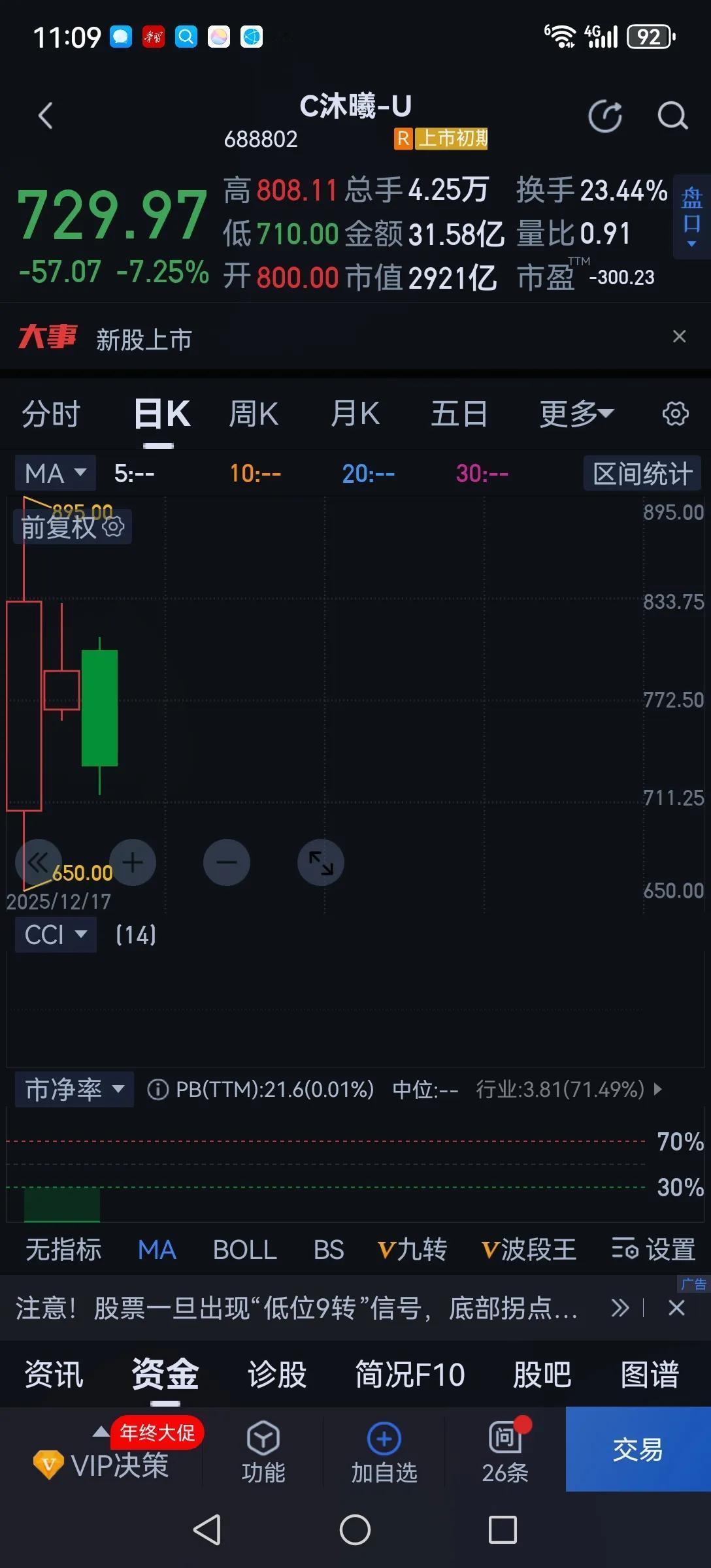两支高价新股开始大幅下跌了,会不会重复中石油现象?最近新上市的两支新股疯狂程度远超中石油上市时的情景。中石油48.6元开盘,随后一路下跌,还把大盘带了下来。今天两支高价新股开始大幅下跌了,这就是疯狂的代价。虽不至于把大盘带下去,至少预示着短期的风格转换。后面若有行情,一些严重滞涨的周期股存在补涨机会。