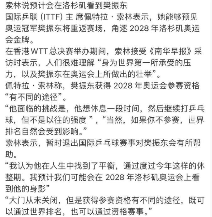 很多人希望樊振东回归国家队,参加国际比赛,连国际乒联主席佩特拉.索林也是如此。 她在接受采访时表示,她预计奥运冠军樊振东将回归赛场。她觉得樊振东将以不同的途径,获得2028年洛杉矶奥运会的参赛资格,角逐奥运金牌。 至于樊振东将以什么样的身份,或者以什么样的途径获得奥运参赛资格,就等时间来检验吧。 反正很多人希望他回归。不光是广大球迷,也包括了一些国际组织。 因为樊振东的影响力太大了。他对乒乓球运动的推广有很大的帮助。