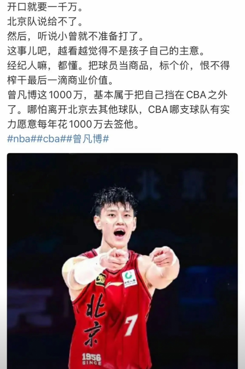 不管他有多离谱,最终还是选择回到首钢,这是据杨毅透露的……只是价格不可能有1000万。 上赛季曾凡博场均拿到14.7分、4.7板、1.5盖帽,40.5%的三分命中率、入选本土最佳一阵,同时拿到最佳进步奖。 赛季结束后他决定留洋。 9月曾凡博和篮网签下Exhibit 10合同。10月曾凡博在NBA季前赛出场。 11月曾凡博未加入篮网下属球队打G联赛,也没有同首钢达成续约协议。 11月底的世预赛发挥稀烂。 12月中旬,曾凡博依旧没有签约。