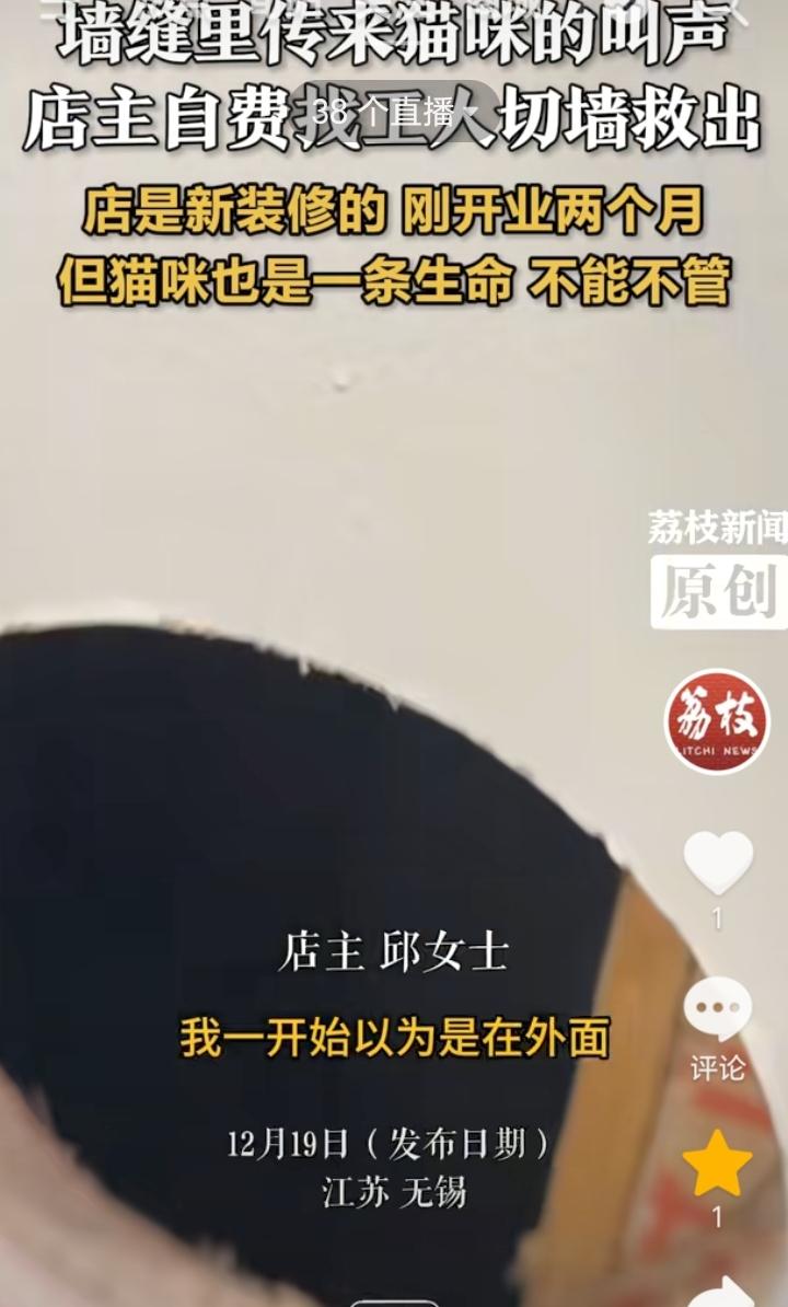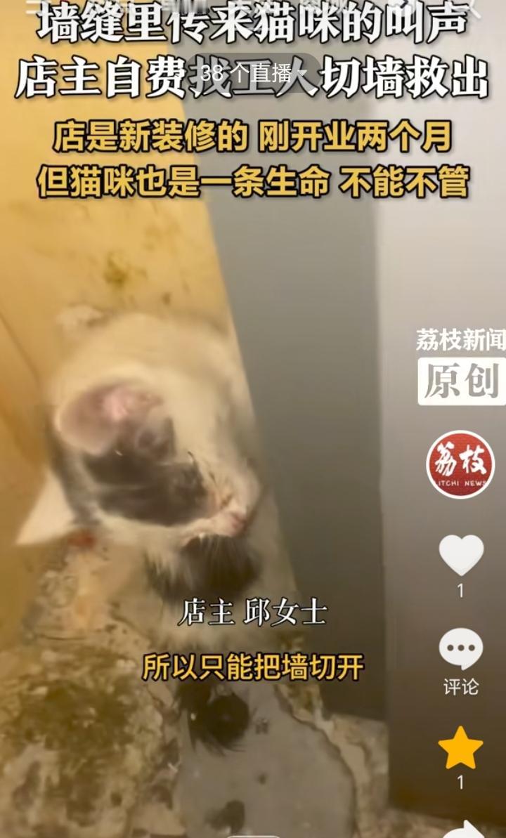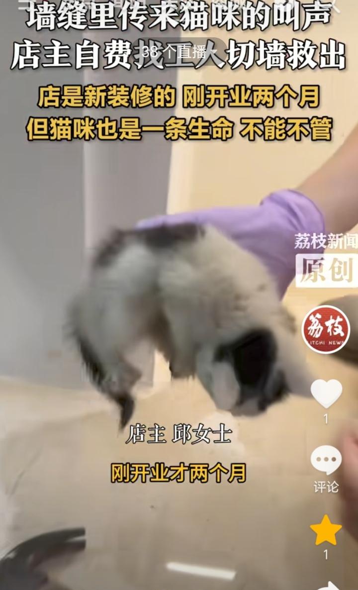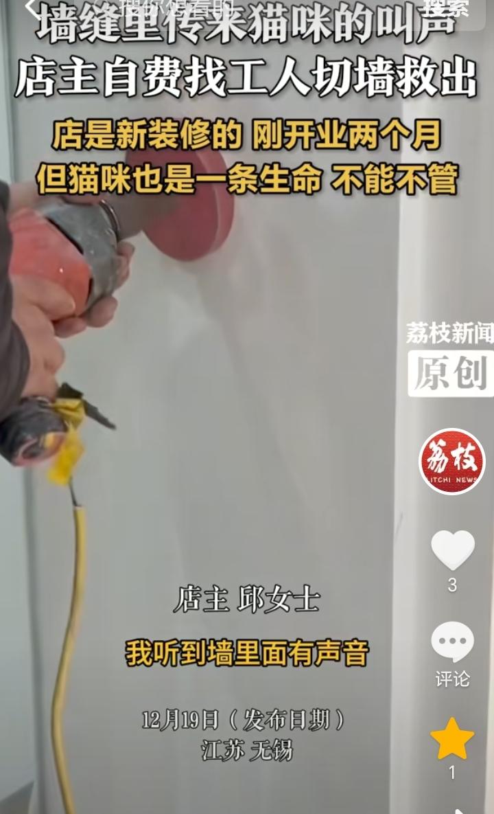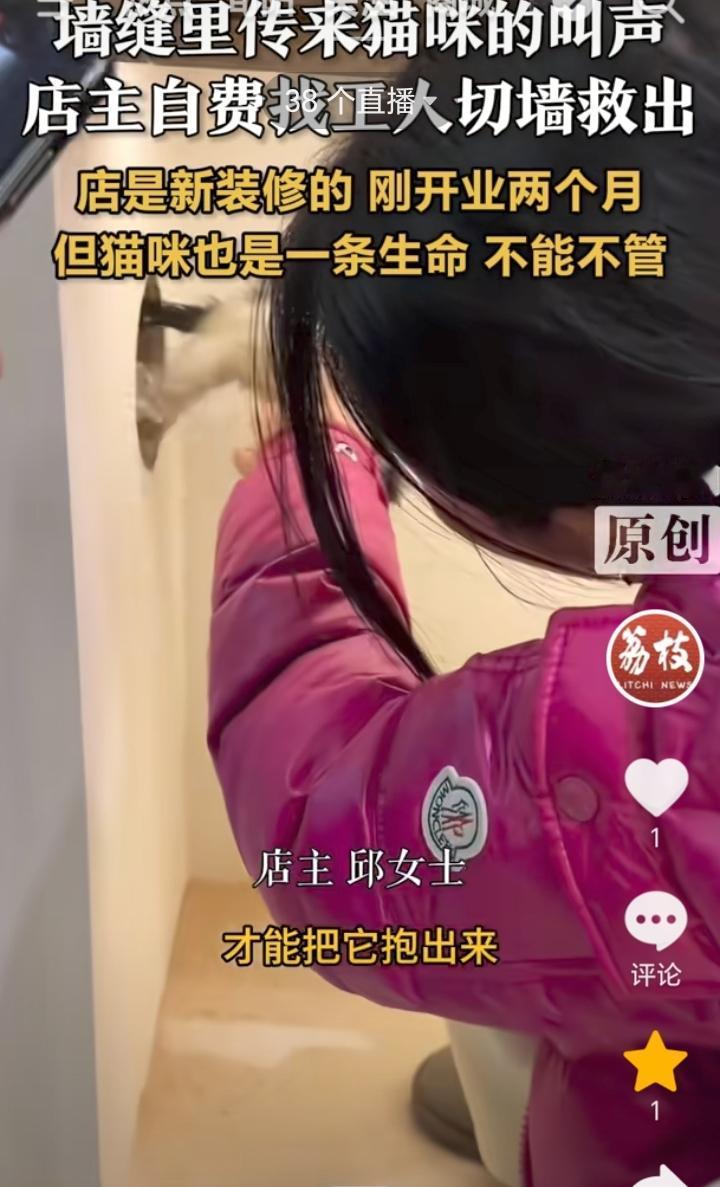 猫也是一条生命!江苏无锡,女店主听到墙里面有猫叫声,一开始女店主以为是在外面,后面发现是在墙里面缝隙里,想要解救出来只能把墙切开,店面新装修刚开业两个月,女店主没有犹豫的就决定切开墙把猫救了出来,因为她觉得猫也是一条生命不能不管。 虽然是一只小动物,但是它也是一条生命,女店主的做法很正确,从这里也是可以看出女店主是一个非常有爱心善良的人,一般这种人都会有福报,希望女店主生意兴隆,财源广进。 有些人可能不喜欢小动物,但是动物也是一条生命,不爱请不要去伤害。