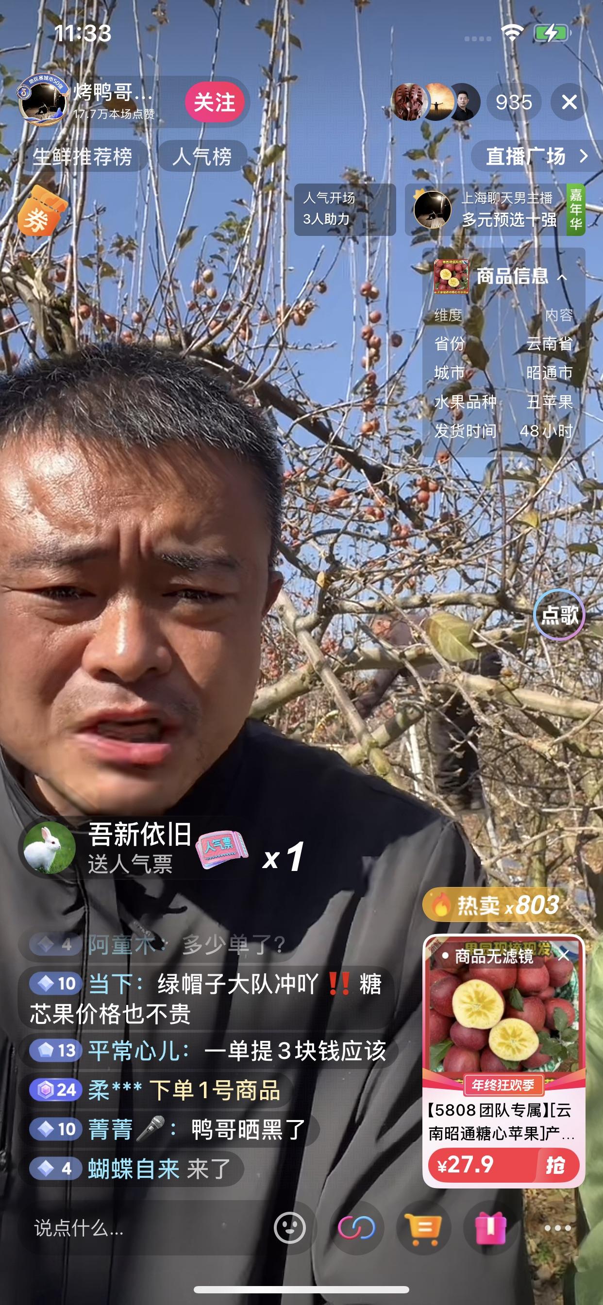 沈圈总算走出一个烤鸭了[赞]平时直播有上千人在线,打pk有网友站榜刷礼物。现在,烤鸭在云南直播卖苹果,也有网友支持,一个早上卖出了近千单。 沈巍身边的主播有一二百人,能直播,能pk,能带货的主播,三样全能的也就烤鸭了。