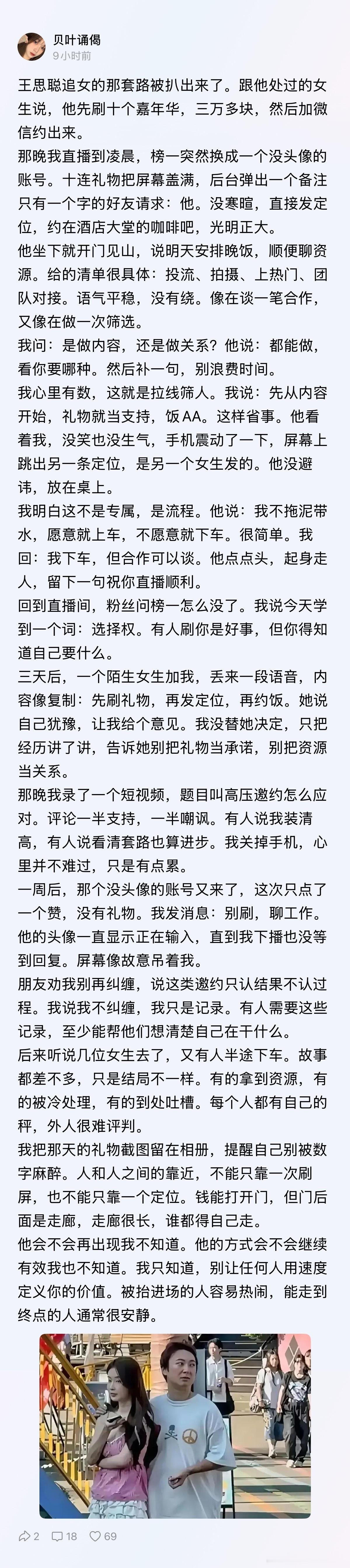 王思聪追女的那套路被扒出来了。跟他处过的女生说,他先刷十个嘉年华,三万多块,然后