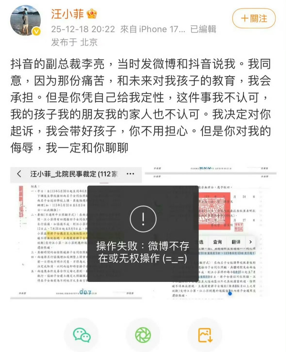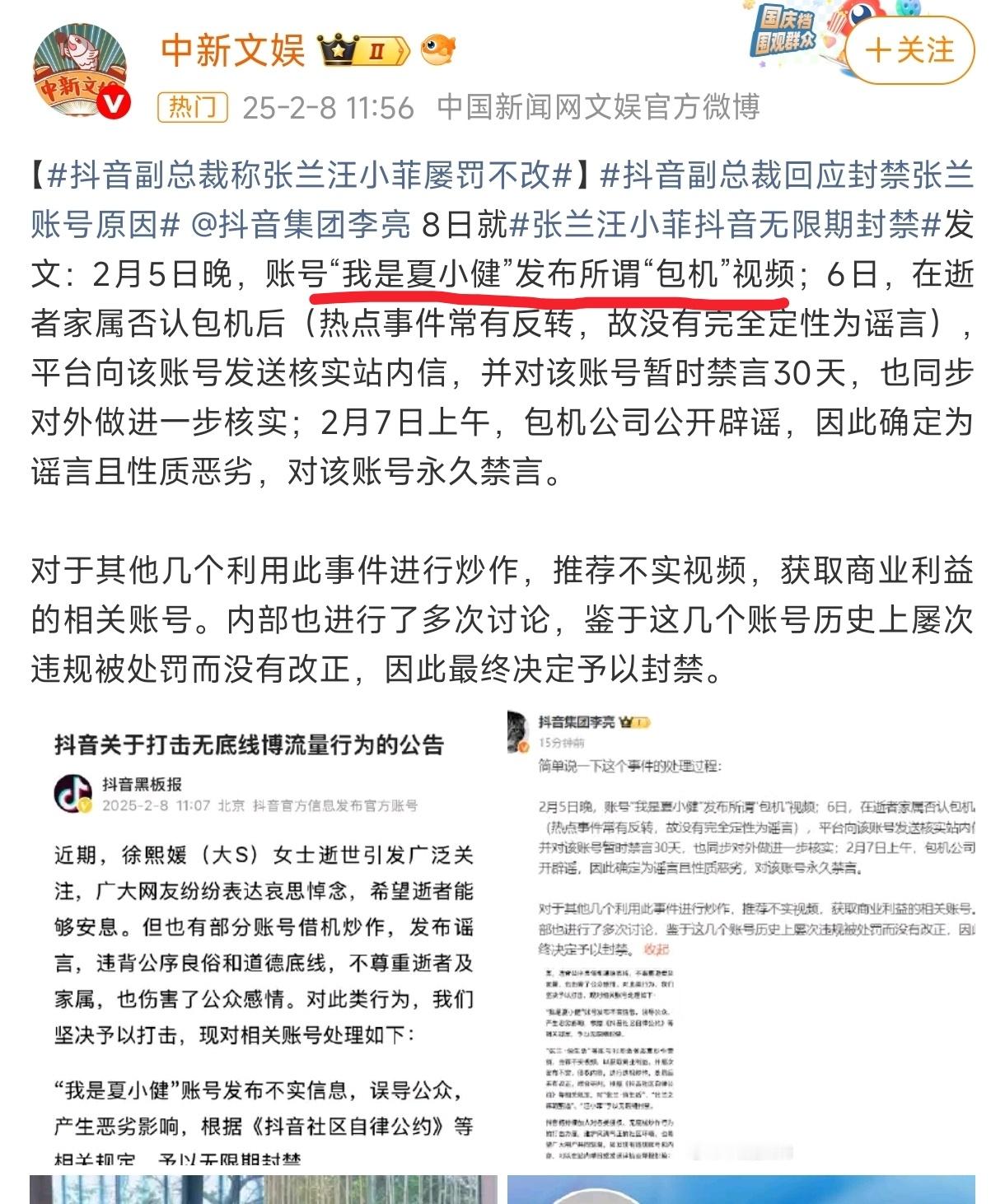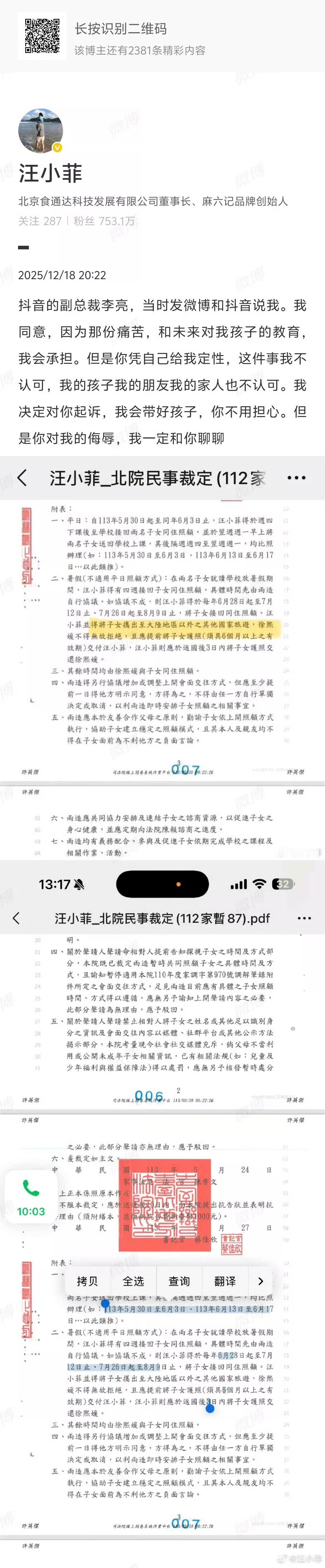 今年2月抖音集团副总裁说的对汪小菲包机和封号事件的处理。汪小菲昨天说要起诉 !!发完了抖音集团李亮的内容后昨天微博又删除了。还有网友质疑他对孩子的教育。他发了和大S的法院判决书的协议附表,是离婚父母双方约定汪小菲每周三天陪孩子,暑假至少四周陪孩子。