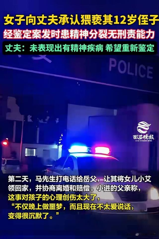 甘肃临夏,男子哄睡3个孩子后不见妻子,他到处寻找,最后在12岁侄儿的房间找到了,妻子告诉他,她对侄儿实施了猥亵。男子以为妻子故意气他的,侄子却证实这事是真的。男子气炸了,让岳父将妻子领回家,还要离婚加赔偿,可这时候侄儿又不见了。男子家被闹得鸡飞狗跳,妻子却被鉴定出精神分裂,不能受到处罚。 据西安晚报等报道,马先生和妻子小艾是经人介绍认识的,当时小艾只有19岁,就和他结婚了。 一晃7年过去,马先生和妻子已经孕育了3个孩子。 如很多夫妻一样,马先生和妻子也开始了七年之痒,妻子小艾不久前和他闹起了离婚。 马先生的大哥一家在外地打工,今年12岁的侄子小进小升初,放暑假比较早,于是回来看望爷爷奶奶,当时和马先生一家住在一起。 7月3日晚上,马先生将三个孩子哄睡后,发现妻子不见了,他每个房间寻找,最后在侄子住的房间找到了她。 当时,妻子躺在小进的床上,小进却一个人坐在沙发上。 马先生感觉有点奇怪,就询问妻子小艾为什么躺小进的床上。 小艾却神色诡异地告诉了马先生一个消息,说她将小进猥亵了。 马先生根本不信,还以为是小艾和他闹离婚故意气他的。 可随后,侄子小进向他证实,这件事竟然是真的。 原来,早在6月30日,小艾就对小进做出了不当行为,只是小进只有12岁,脸皮薄,没好意思将这件事说出来。 马先生气炸了,第二天一大早就给岳父打电话,将这件事告诉了他,让他把女儿领回去,协商离婚的事,还要求对小进赔偿。 这件事闹开后,侄子小进也离家出走了,家人找了一天才把孩子找了回来,马先生家里一片鸡飞狗跳。 7月6日,马先生家里报了警,7月10日,本案被行政立案,家属不断反映情况,7月21日,本案转为刑事立案。 7月23日,小艾因涉嫌强制猥 亵儿童罪被刑事拘留。 可3天后,马先生一家接到一份鉴定通知,称案发时小艾处于精神分裂症发作,没有刑事责任能力。 也就是说,小艾不用承担刑事责任。随后小艾被送去治 疗。 马先生不服,他和小艾朝夕相处一起生活了7年,她到底有没有病,自己还不清楚吗? 马先生的大哥也不能接受,因为经历过这件事,原本开朗的儿子变得沉默寡言,半夜还经常说梦话、做噩梦、惊醒。 马先生一家曾经提出过异议,可检方申请对小艾进行强制医疗被驳回,马先生家申请对小艾精神状况重新鉴定,也因为小艾不配合一直没能进行。 马先生一家都希望对小艾重新进行精神鉴定,并追究她的刑事责任。 那么,此事从法律角度应该如何分析? 小艾即便真的和小进发生了亲密行为,也只能认定为猥 亵。 这是因为《刑法》中有规定,强 奸罪和强制猥 亵罪的主体是不同的。 强 奸罪是指违背妇女意志,使用暴力、胁迫或者其他手段,强行与妇女发生关系的行为,或者故意与不满14周岁的幼女发生关系的行为。 而强制猥 亵罪是指以暴力、胁迫或者其他方法强制猥 亵他人或者侮辱妇女的行为。 在刑法体系中,强 奸罪的犯罪对象主要针对女性,对于男性被性 侵的情形,目前并不认定为强 奸罪。 小进是12岁男性,所以小艾哪怕真的得手,也只构成强制猥 亵儿童罪,不构成强 奸。 案发后,小艾在被刑拘后鉴定出精神问题,精神问题能否免除对小艾的刑罚? 《刑法》第十八条规定,精神病人在不能辨认或者不能控制自己行为的时候造成危害结果,经法定程序鉴定确认的,不负刑事责任,但是应当责令他的家属或者监护人严加看管和医疗;在必要的时候,由政府强制医疗。 本案中,经鉴定小艾案发时处于精神分裂症发作,没有刑事责任能力。按照法律规定,小艾不用承担刑事责任,但应被送去治疗。 因此,小艾被送去治疗,因效果不错,检方提出的强制医疗提议,被驳回了。 不过,马先生一家对此存在异议,他们不相信小艾在案发时有精神问题。但因小艾一直不配合,再次鉴定一直没能进行。 那么,小艾拒绝配合鉴定,马先生是不是就没有办法了? 《刑事诉讼法》第一百四十八条规定,侦查机关应当将用作证据的鉴定意见告知犯罪嫌疑人、被害人。如果犯罪嫌疑人、被害人提出申请,可以补充鉴定或者重新鉴定。 马先生一家作为相关利害关系人,有权对小艾的精神状况鉴定结果提出异议并申请重新鉴定。小艾拒绝配合的行为是不合法的,不能成为阻碍重新鉴定的理由。 司法机关可以采取合理措施保障重新鉴定程序的进行,比如可以采取适当的强制手段确保鉴定顺利开展,以保障案件处理的公正性和客观性。 所以,即便小艾不配合,也并不意味着就可以免除重新鉴定。 如果再次鉴定小艾没有精神问题,她应当受到的处罚仍然免不了。 即便小艾真的有精神问题,马先生大哥也可以提起民事诉讼,要求小艾对小进进行赔偿。