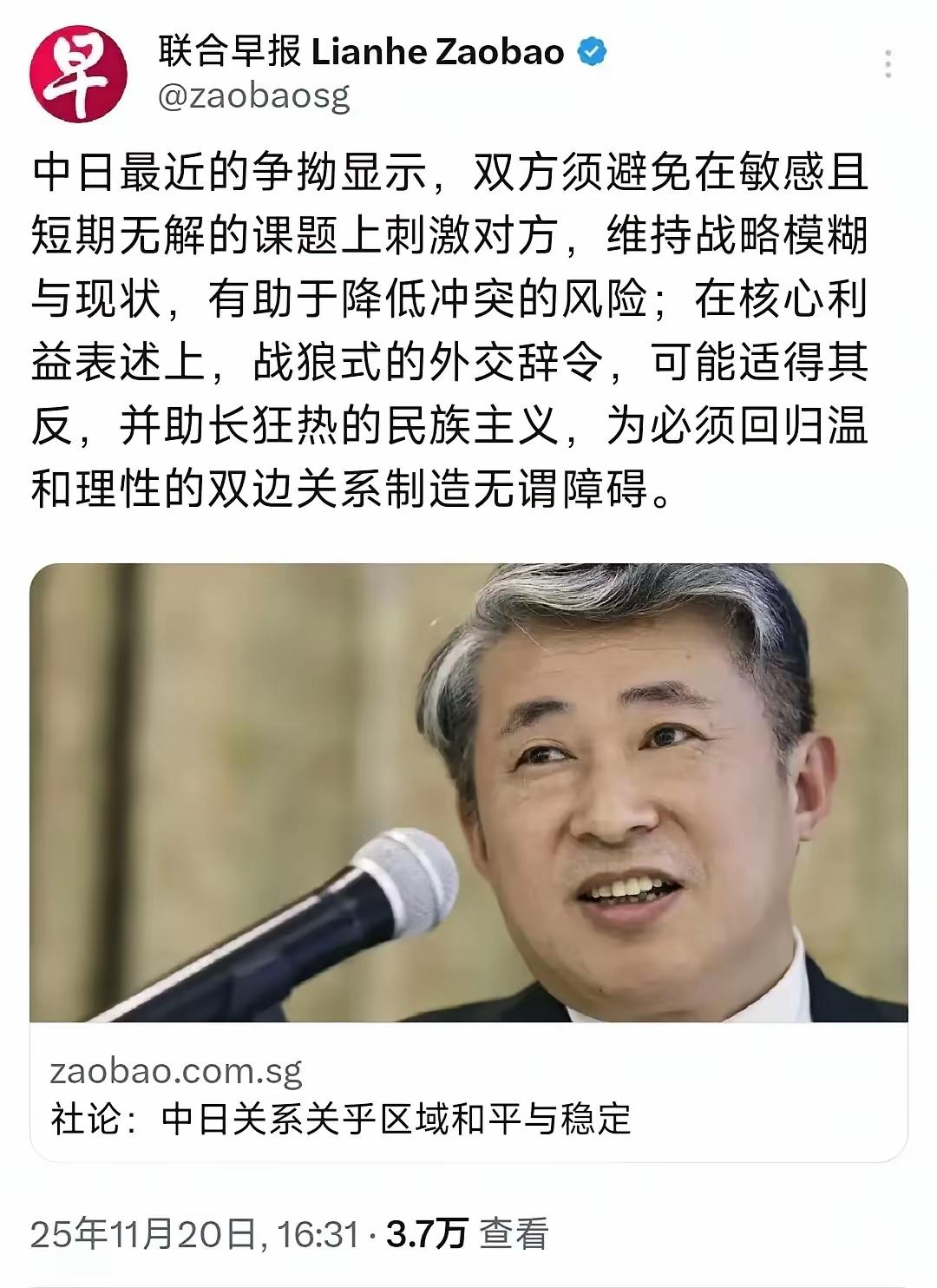 新加坡联合早报:在核心利益的表述上,战狼式的外交辞令,可能适得其反,并助长狂热的民族主义,为必须回归温和和理性的双边关系制造无畏障碍。 喷两句:新加坡联合早报的意思就是中国面对日本对中国主权的挑衅,只能选择忍气吞声,吞下苦果。联合早报这是需要中国回到100多年前的清末,918时的蒋光头,任人宰割啊。 新加坡人非常惧怕中国崛起,2009年,李光耀亲赴华盛顿游说奥巴马政府重返亚洲,平衡中国在亚洲的影响力。从此中国周边再也不得安宁。 这次中日交恶,日本考试扫描是是挑衅者,但是新加坡早报只口不提日本挑衅在先,却要中国忍气吞声,简直是不可理喻。