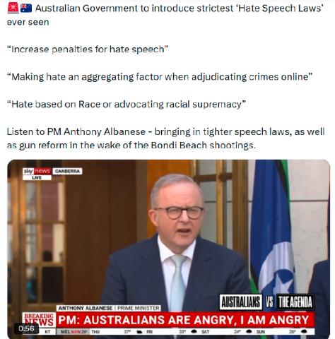 澳洲推出史上最严“仇恨言论法”引争议:是护安全还是乱方寸? 澳大利亚正在做死的路上继续狂奔!邦迪海滩袭击事件后,左翼阿尔巴尼斯政府不仅要收紧言论相关法律,推进更严格的枪支改革,还直接抛出史上最严厉的“仇恨言论法”。 这份争议满满的法案核心内容包括: ——大幅提高对仇恨言论的处罚力度; ——裁定网络犯罪时,将“仇恨动机”明确列为加重处罚的关键因素; ——重点打击基于种族的仇恨行为,以及鼓吹种族至上主义的言论与举动。 这些就是左派的治标不治本。 澳洲应该做的难道不是: ——叫停大规模难民引进计划,尤其严控穆斯林难民流入; ——坚决驱逐非法移民——这是任何法治国家的基本操作。非法存在本身就不合规,不驱逐既是对守法移民的不公,更会彻底摧毁法治根基; ——升级移民审查标准,对特定国家和群体的入境申请实施重点筛查; ——强化归化管理:入籍者必须认同澳洲国家价值观与法治规则,杜绝以自身宗教、意识形态为借口肆意妄为,甚至仇视国家的行为; ——全力维护国家团结,避免情绪宣泄与意识形态对立撕裂社会,把重心放在维护公共秩序与国民安全上。