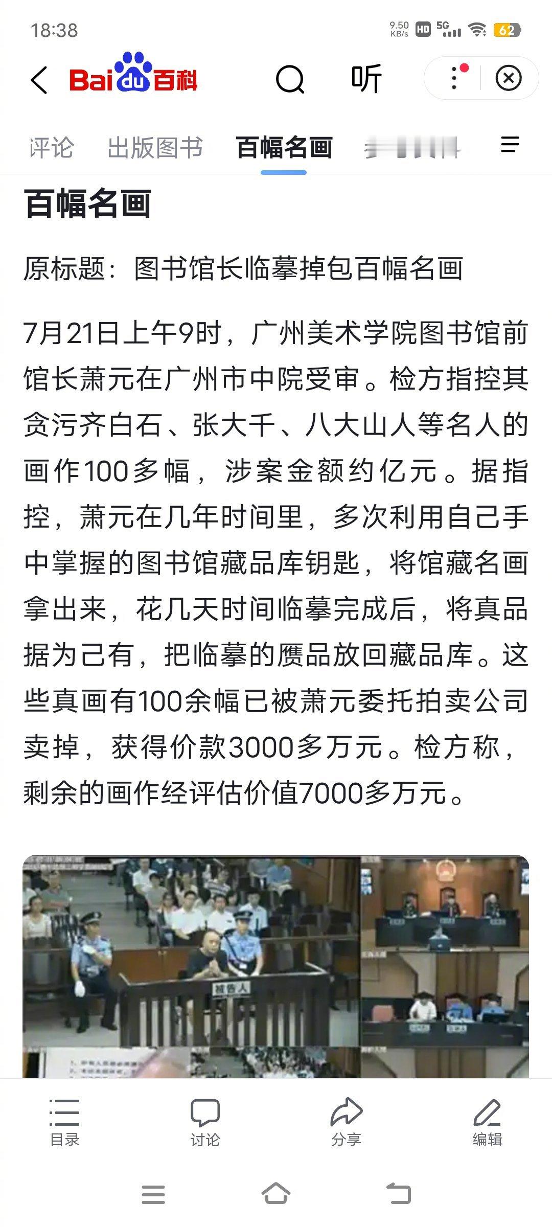南京博物院 江南春因为南京博物馆这件事情,又发现一件比较有意思的事情,武汉大学毕业的萧元,在担任广州美术学院图书馆馆长的时候,多次利用自己手中掌握的图书馆藏品库钥匙,将齐白石、张大千、八大山人等名人的画作100多幅拿出来,自己临摹一下,将真品据为己有,把临摹的赝品放回藏品库。这些真画有100余幅已被萧元委托拍卖公司卖掉,获得价款3000多万元,剩余的画作经评估价值7000多万元。不仅是南京博物馆,全国的博物馆都好好查一下吧,看看还有多少真文物,看看有多少文物都被博物馆监守自盗了??? 国家文物局调查博物馆藏画拍卖事件
