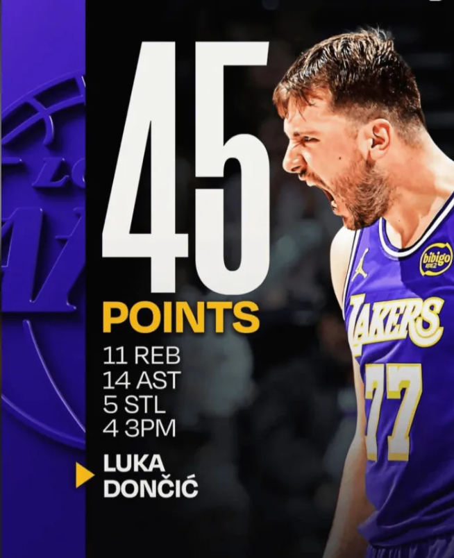 NBA常规赛,湖人143-135战胜爵士,末节实现逆转。 湖人球员东契奇全场28中14、三分12中4、罚球16中13,砍下45分11篮板14助攻5抢断。 詹姆斯赛后更新INS晒出东契奇数据:魔术师东契奇。