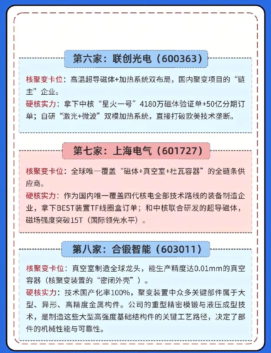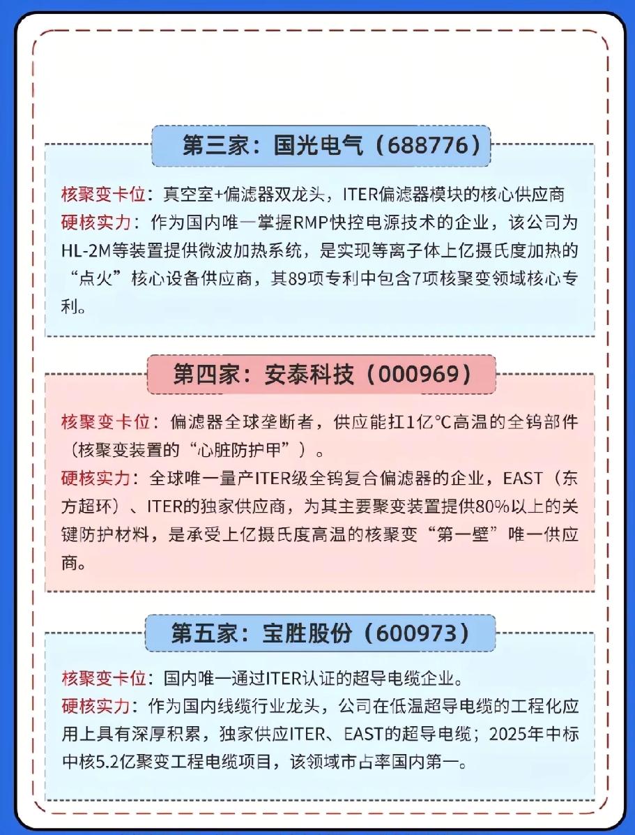 炸了,这8家公司垄断可控核聚变核心赛道未来可期! 当“终极能源”可控核聚变从实验室冲向产业,政策把它写入“十五五”未来体系、资本砸下超1300亿四大设施、技术突破让“人造太阳”离商用越来越近——这条赛道的8家核心企业,已经把关键卡位全占了! 西部超导:全球低温超导龙头,独供ITER/中国聚变堆磁体材料,占全球62%超导市场。兼具國企改革概念,公司实际控股人为陕西财政部。 永鼎股份:全球唯二能产ITER级铌三锡超导带材的企业, 国光电气:真空室+偏滤器双龙头,核聚变专利占比超8%;是我国微波电子器件主要科研生产基地之一。 安泰科技:偏滤器全球垄断者,是EAST/ITER“第一壁”唯一供应商。公司大股东中国钢研科技集团是国资控股央企。 联创光电:高温超导+加热系统双布局,自研“激光+微波”加热系统打破欧美垄断;兼具商业航天概念,旗下子公司承担重大宇航级项目配套任务。 合锻智能:真空室制造全球龙头,国内大型锻压设备自动化成套技术与装备产业化基地。 理财有风险投资需谨慎,资料取材网络仅供参考不能作为投资依据。
