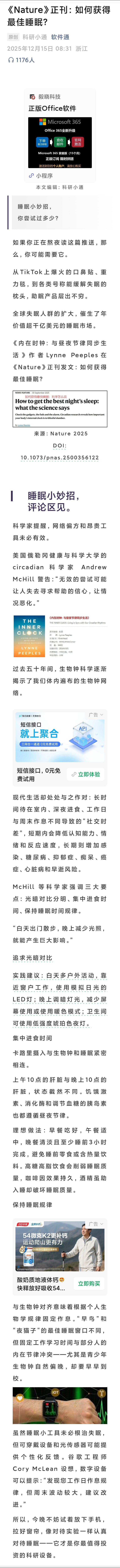 《Nature》正刊:如何获得最佳睡眠?科学家提醒,网络偏方和昂贵工具未必有效。生物钟科学逐渐揭示了我们体内遍布的生物钟网络。现代生活却处处与之作对:长时间待在室内、深夜进食、工作日与周末作息不同导致的“社交时差”。三大要点:光暗对比分明、集中进食时间、保持睡眠时间规律。“白天出门散步,晚上减少光照,就能产生巨大影响。”规律,日落而息。