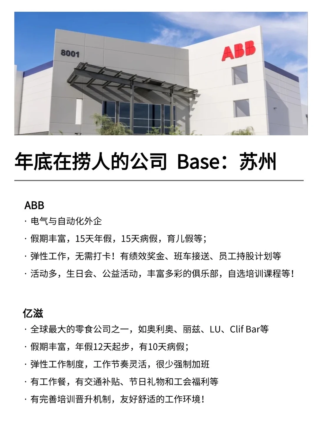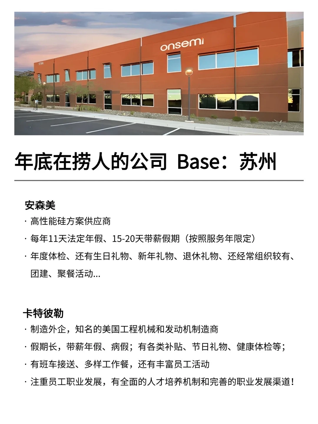 苏州发展真的越来越好,有不少小而美、冷门宝藏的公司,机会是真的很多的! 特别是有不少小众冷门的外企,真心建议大家可以去试试 · 为什么还是值得去外企? ▪️氛围好,对女性友好,年假长,基本上都是10天起步 ▪️很多还都支持居家办公、福利完善,是真的能实现WLB ▪️待遇也还不错,想在年底找工作的真的可以考虑考虑~ · 坚持日更✊🏻,帮大家在找工作路上顺利拿 offer! ·
