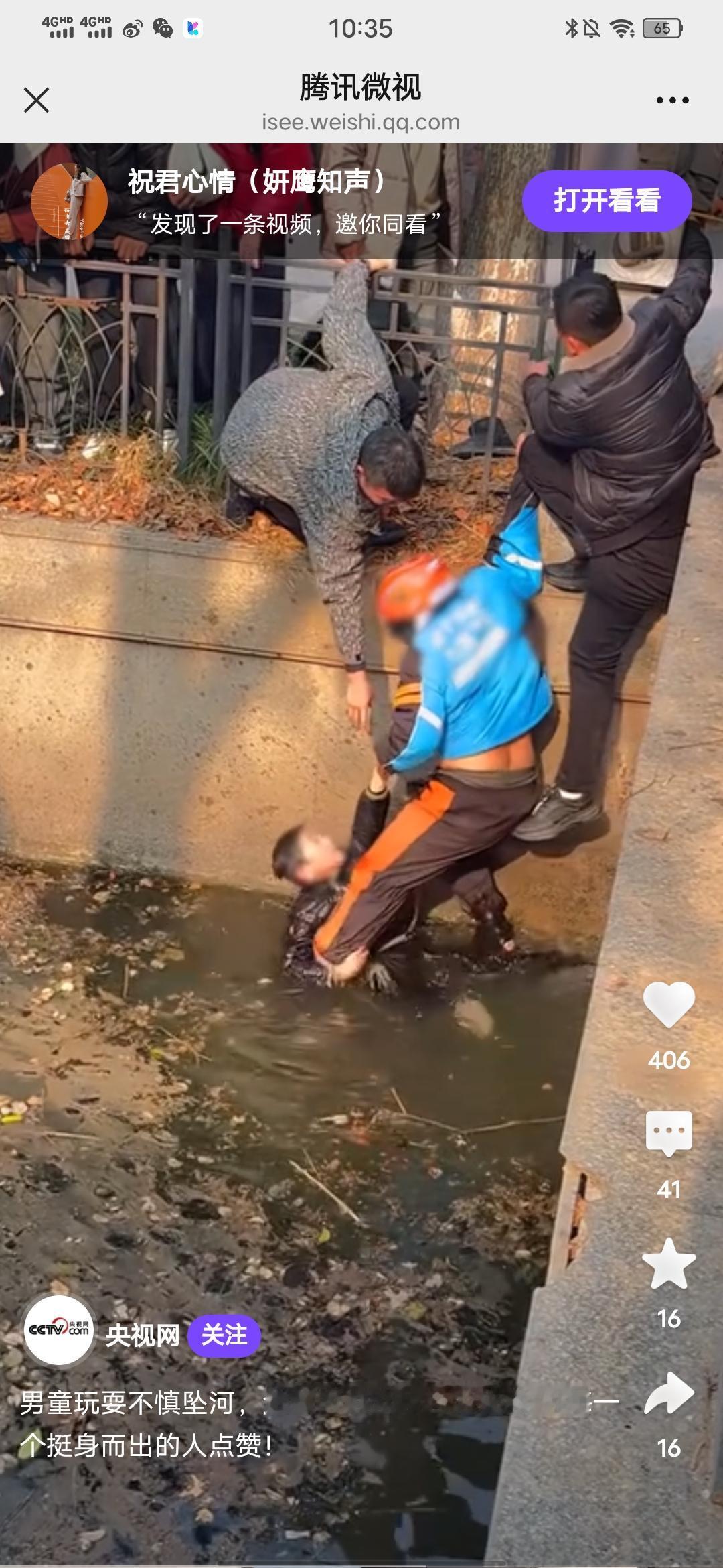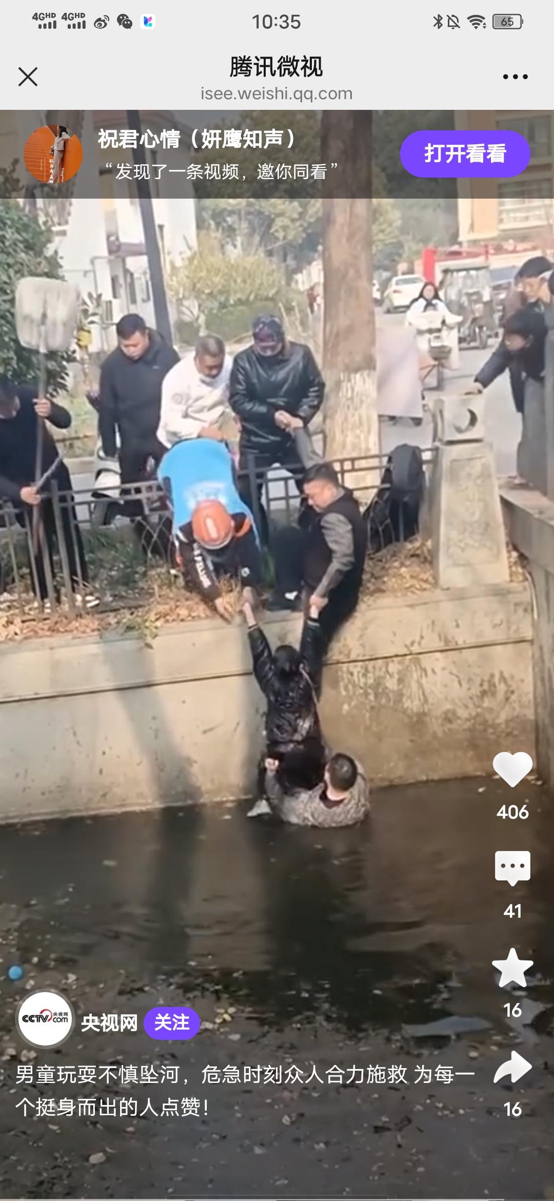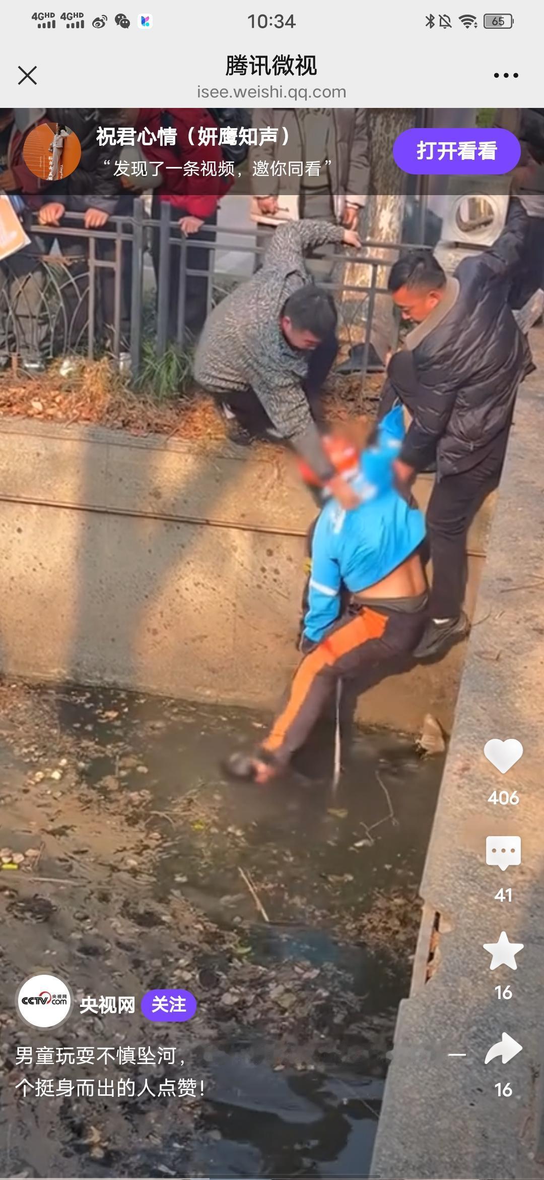 男童玩耍不慎坠河,危急时刻众人合力施救为每一个挺身而出的人点赞! 刚刚看到的央视网的消息,近日,在安徽阜阳,一个男童玩耍时不小心掉到河里了,周围围了好多人,这个时候外卖小哥,还有另外两名好心人都来帮忙救孩子,然而首次外卖小哥救援时,因为体力不支,没有能够将男童拉起,见孩子可能快要撑不住了,另一名帮忙救援的帅哥,果断跳下了冰冷刺骨的河水中,用双手将男童托举起来,最后众人齐心协力将男童救了上来。 为每一个挺身而出的人点赞,他们救人的样子真的很帅,这就是咱们中国人骨子里的善良。 不过也要提醒带孩子的家长,一定要多上心,照看好自己的孩子啊,不然真要出点事,又在那哭天抢地后悔莫及,而小朋友们玩耍也一定要远离水源啊,这大冬天的,看着就冷得刺骨。孩子嘛,不管是水源,还是其他什么地方,只要有安全隐患的,都应该远离。 最后,祝愿好人一生平安,祝愿每个孩子都有安全快乐的童年! 社会百态 正能量