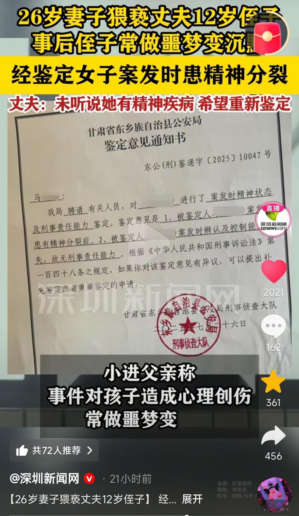 甘肃,26岁妻子猥亵了丈夫12岁侄子。几天后晚上11点多,丈夫见妻子还没回房间,寻找发现她躺在侄儿睡觉的地方。事后妻子承认三天前猥亵了侄儿,侄儿也承认了,因害羞与恐惧才不敢声张的,丈夫怒不可遏,第二天就让岳父把女儿领回去,自己准备离婚及要求赔偿。之后妻子因涉嫌猥亵儿童罪被刑拘,谁知3天后事件反转,鉴定结果称妻子犯案时患精神分裂症,没有辨认与自控力无刑责,但丈夫并不认可,称这几年妻子都从没表现出过精神疾病,要求重新鉴定并追究刑责。 (来源:红星新闻、深圳新闻网等) 甘肃的马先生与26岁妻子小艾,按说有一个幸福美满的家庭,两人结婚7年育有3个孩子,日子过得也不错,没想到今年暑假发生的一件事让这一切分崩离析。 马先生的大哥老马一家都在外地打工,12岁儿子小进也在外地上学。今年暑假,小进放假早,便回老家看望奶奶,没想到这趟探亲之旅,竟变成了一场噩梦之行。 今年7月3日晚上11点左右,马先生哄完孩子们睡觉了之后,发现妻子这么晚了都还没回房间,就在家里四处寻找,最终在侄儿小进的房间里找到了她。 小进的房间与叔叔马先生一家的房间是挨在一起的,按说婶婶进小侄儿房间似乎也正常,但丈夫发现妻子躺在侄儿睡觉的地方,侄儿则坐在沙发上,让马先生心生疑窦。 回房间后,妻子坦然承认她于6月30日晚上10点许进小进房间猥亵了他。这一度令马先生难以置信,认为妻子在故意气他,因为那几天她在闹离婚。为弄清楚此事,马先生便去询问小进,谁知小进也承认了,称因为害羞与恐惧才不敢告诉家里人的。马先生这才相信了,他又气又恼,妻子竟然背着他干下此等伤害侄儿的丑事,他该如何向大哥及家人交待啊。 第二天,马先生给岳父打电话让他把女儿领回去,并计划着与妻子离婚要求赔偿等。而也是这一天小进离家出走了,亲戚朋友找了一天都没有找到,直至第二天才在镇上一家宾馆里找到了他,否则后果不堪设想,可见这件事对小进伤害有多大! 之后小艾因涉嫌猥亵儿童罪被刑拘,原以为这次她会被绳之以法,没想到3天后事件迎来了反转,东乡公安局鉴定报告称小艾在犯案时患精神分裂症,没辨别与控制能力无刑责,这反转真是让人不可思议又猝不及防。 既然有精神分裂症,那就要强制医疗并由法定监护人严加看管,马先生欲哭无泪,称自己这几年从没发现过妻子精神异常,他与大哥都希望重新鉴定并追究刑责。 而之所以有这样的诉求,也是因为这件事对小进心理创伤太大了。据小进父亲称, 这件事之后,过完暑假的小进开启了初中生活,他每晚噩梦连连,话也不爱说了,笑容也没了,整日里沉默寡言,完全变了一个人。 婶婶犯下的这桩丑事,无疑成了侄儿一生的阴影。 真是太炸裂了,毁三观啊! 婶婶作为成年人竟不顾廉耻与伦理对12岁侄儿做下此等伤天害理之事,真是太不可思议了。孩子懵懂无知,你作为成年人也不懂吗,真是糊涂至极啊! 原以为小艾被法律严惩板上钉钉,不料事件反转,竟被鉴定为患了精神分裂症,与她生活7年的马先生矢口否认妻子有精神疾病,称妻子只说过头痛、腰痛到医院检查又一切正常。还有,当地村民也称,平时与小艾沟通交流都很正常。 这事件变得越来越扑朔迷离了,小艾到底有没有精神疾病?有意思的是,之后小艾被要求重新鉴定,她却拒不配合。 既然受害家人及公众对鉴定报告的公正性提出质疑,那么就该重新鉴定以堵住悠悠之口、平息争议才对,而不是拒不配合。 而如果一旦被查出鉴定报告不实,小艾犯案时精神正常,那么等待小艾的必然是法律的严惩。按刑法规定,猥亵14周岁以下儿童无加重情节的获刑5年以下;有加重如造成儿童身体及心理伤害等的获刑5年以上,若有精神疾病则需法定鉴定才可免刑责,但民事赔偿免不了。 因此,这件关于伦理、法律与社会的案件,其核心仍然是“鉴定”,但丈夫是有权申请重新鉴定的,同时主张民事赔偿。此案还在进一步审理中,希望小艾配合鉴定,让一切真相水落石出,这是对自己、对受害者最好的负责。 最令人心疼的还是12岁的小进,他还是未成年,人生还没开始,就陷入了巨大的心理创伤中,羞耻感与信任崩塌或将伴随他一生,希望他早日走出阴霾,快乐成长。
