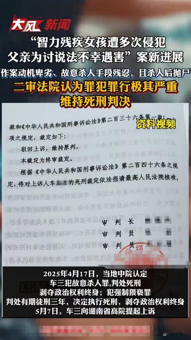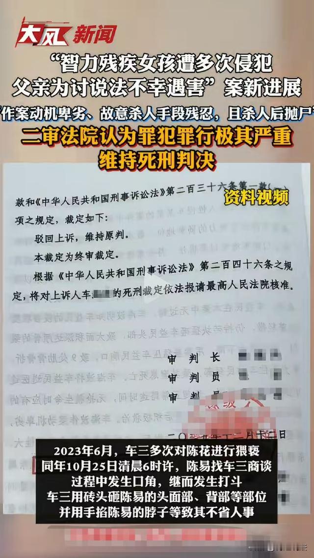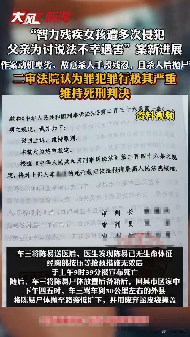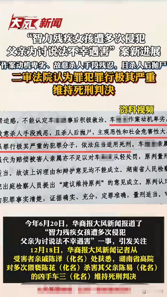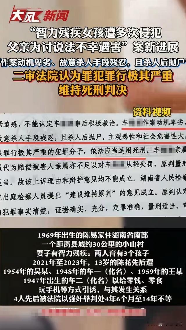 湖南,15岁智力残障女孩多次遭人性 侵,父亲起诉维权期间,女儿再次被人侵犯,父亲带女儿找对方讨说法,竟然被他掐 死,随后还将父亲抛尸荒野。被捕后,嫌犯还辩解说他是正当防卫。近日本案迎来终审判决。 据大风新闻报道,陈易是湖南南部一个小山村的村民,他为人和善,是个热心肠。 多年前,陈易不顾家人的反对,娶了一个智力残疾的妻子。 婚后,陈易和妻子生育了一子二女,可是三个孩子都遗传了妻子的智力残疾。 好不容易将孩子拉扯大,陈易的大女儿又走失了。 陈易的小女儿小花虽然上了学,可十以内的加减法都算不明白,生活也无法自理。 作为家里唯一一个正常人,陈易既要干农活又要打零工赚钱养活妻子和两个不正常的孩子,平时忙得脚不沾地,对孩子难免看顾不到。 2021年11月15日,亲戚提醒陈易,说13岁的小花肚子大的不正常,让他带去看一看。 陈易这才惊觉,他立即带女儿去检查,果然小花已经怀孕5个多月了。 陈易气炸了,询问女儿是谁干的,小花指了指附近工地干活的吴某,陈易报了警。 吴某生于1954年,被刑事拘留后,吴某交代他和小花发生过3次 关 系。 民警询问案情时,意外从小花口中得知,和她发生关系的不止吴某,还有1948年出生的车一和1959年出生的王某。 其中,车一从2019年开始,就引诱11岁的小花和他发生了 关 系,先后一共有7次。而王某和小花之间有8次。 2022年4月,小花生下了一个男孩,经鉴定孩子是王某的。 同年6月,王某、车一和吴某因 强 奸 罪,分别被判处14年、13年、12年有期徒刑。 案发后,当地非常重视,还在陈易门口安装了监控,陈易也以为不会有人再对女儿下手了,可没多久,他洗衣服时,又在女儿的口袋里发现了几十元零钱。 陈易意识到发生了什么崩溃了,他追问责骂小花,几天后,小花告诉他是亲戚车二给她的。 陈易找到车二,对方说是和小花开玩笑,让他不要报警,陈易要求他赔偿3万,车二的儿子不肯,陈易报了警,车二落网。 但是,因为案发时车二已经过了75周岁,且当时未得逞,又属于主动投案,只被判了4年6个月。 就在陈易为这事奔波时,又从村里人口中得知,小花被51岁的同村村民车三 侵 犯 了。 2023年10月25日一大早,陈易带着小花找车三对质。 谁知,车三拒不承认自己的行为,还捏造事实,称陈易和他嫂子有不正当的 关 系,还说他哥的离世,就是陈易干的。 陈易气愤万分,和车三发生了争执,随后两人发生了肢体冲突。 车三摸起一块砖头猛砸陈易的头、面部和背部和胸口,两人扭打在一起,在此过程中,车三掐住陈易的脖子,直到陈易失去呼吸。 车三回过神后,谎称陈易是他的哥哥,建房时被砸倒,将他送去抢救,但当时陈易已经浑身僵硬,被宣告离世。 车三将陈易放下后备箱里,拉到30公里外县的一处路旁低圹下,用蛇皮袋进行掩盖。 第二天,车三被抓获。被捕后,车三说他是正当防卫,企图逃避惩罚。 那么,车三最后会受到什么处罚? 车三不构成正当防卫,他的行为是确切的故意 杀 人。 《刑法》第二十条规定,正当防卫是为了使 国 家、公共利益、本人或者他人的人身、财产和其他权利免受正在进行的不法侵害,而采取的制止不法侵害的行为,对不法侵害人造成损害的,属于正当防卫,不负刑事责任。 正当防卫需要满足起因条件,即存在不法侵害。时间条件,即不法侵害正在进行。主观条件,即具有防卫意图。对象条件,及针对不法侵害人。和限度条件,即没有明显超过必要限度造成重大损害。 本案中,车三与陈易发生争执和肢体冲突,车三用砖头猛砸陈易的头、面部和背部,进而掐住陈易的脖子直至其失去呼吸。 车三的行为并非是为了制止正在进行的不法侵害,而是在冲突过程中主动实施了暴力攻击行为,不具备防卫的意图。 因此,车三提出自己是正当防卫的辩解不能成立。 《刑法》第二百三十二条规定,故意杀人的,处死刑、无期徒刑或者十年以上有期徒刑;情节较轻的,处三年以上十年以下有期徒刑。 车三在与陈易的冲突中,使用砖头猛砸陈易关键部位,并将陈易掐 死,符合故意 杀 人 罪 的范畴。 一审认为,车三不构成正当防卫,认定他犯故意 杀 人 罪,判处其 死 刑。 一审还查明,车三确实多次 猥 亵 过小花。 根据《刑法》第二百三十七条的规定,认定车三犯强制 猥 亵 罪,判处其有期徒刑3年。 《刑法》第六十九条规定,判决宣告以前一人犯数罪的,除判处死刑和无期徒刑的以外,应当在总和刑期以下、数刑中最高刑期以上,酌情决定执行的刑期。 最终,数罪并罚,车三因犯故意 杀 人 罪,判处死刑,剥夺政治权利终身;犯强制猥亵罪,判处有期徒刑三年。 根据法律规定,最终决定对车三执行 死 刑,剥夺政治权利终身。 一审判决后,车三不服,提起上诉,2025年12月12日,高院驳回了车三的上诉,并报请最高法核准。