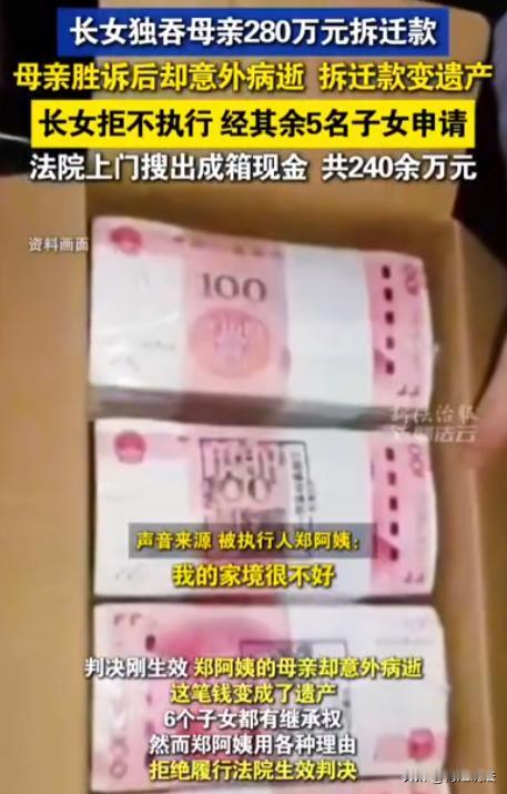 上海,一女子独吞母亲280万拆迁款,被母亲给起诉了,母亲胜诉后还没拿到钱,突然离世,这280万瞬间成了遗产,6兄弟姐妹都有份,可女子坚决不把钱拿出来分,每天还躺在100万现金上睡觉,即便她2次被拘留,房子也被查封了,还是捂着钱不撒手,最终的结局让人意想不到。 (来源:深圳新闻网) 郑女士,早些年就出嫁了,不过户口一直没从母亲的老宅迁走。 2019年,母亲的老宅赶上了拆迁,一下子得了280万拆迁款。 这钱按照规定,全归母亲所有。 郑女士看着这笔钱,她想着自己现在捞不着,等母亲去世了,这钱还得6个兄弟姐妹平分,自己到手也没多少。 于是,她偷偷把这280万拆迁款,给取走了。 母亲发现钱没了,知道是郑女士干的,就找她要,郑女士死活不承认,也不肯把钱拿出来。 母亲实在没办法了,就起诉了郑女士。 经过一番调查,查明郑女士根本就没在老宅住过,而且她自己还有福利房。 因为这些情况,最后法院判母亲胜诉,要求郑女士把280万拆迁款归还给母亲。 可母亲还没拿到这笔钱,就突然离世了。 这280万一下子就变成了遗产,按照法律规定,郑女士和她的5个兄弟姐妹都有份。 这时候,郑女士又开始耍赖了,她坚决不把钱拿出来和兄弟姐妹们分,还和丈夫一起撒谎,说钱已经花光了,要么就说拿去理财了。 弟妹们听她这么说,也没什么好办法处理,有人提议去郑女士家里搜搜看,这一搜,可不得了,在郑女士的褥子下面、床底下,居然找出了240万现金。 原来,郑女士把钱取出来后,一直藏着,她每天就躺在这些钱上睡觉,好像这样钱就真的是她的一样。 兄妹看到这个情况,本来想起诉郑女士,让她受到应有的惩罚,可考虑到毕竟是一家人,亲情还在,最后大家商量了一下,决定减免一部分利息,和郑女士达成和解。 那么,以法律的角度该如何看这件事呢? 1,郑女士在母亲不知情的情况下,私自将属于母亲的280万拆迁款取走,法律该如何认定呢? 根据《民法典》第235条规定:无权占有不动产或者动产的,权利人可以请求返还原物。 拆迁款明确归母亲所有,郑女士未经母亲同意私自取走,属于无权占有,母亲作为权利人,有权要求郑女士返还这笔钱。 郑女士这种私自取走的行为,还可能涉嫌侵占罪。 您觉得郑女士私自取走母亲拆迁款的行为,是不是太过分了?在面对巨额财产时,亲情和法律该如何权衡呢? 2,郑女士在被判决归还拆迁款后,不仅不履行义务,还和丈夫一起撒谎,将钱藏匿起来。 在搜查时,在她褥子下、床底找出了240万。 根据《民事诉讼法》第一百一十一条规定:诉讼参与人或者其他人有下列行为之一的,人民法院可以根据情节轻重予以罚款、拘留;构成犯罪的,依法追究刑事责任:…… (六)拒不履行人民法院已经发生法律效力的判决、裁定的。人民法院对有前款规定的行为之一的单位,可以对其主要负责人或者直接责任人员予以罚款、拘留;构成犯罪的,依法追究刑事责任。 郑女士在判决生效后,拒不归还拆迁款,属于拒不履行人民法院已经发生法律效力的判决、裁定的行为。 她还隐匿财产,这符合“不履行义务 + 隐匿财产”的情形。 根据《民事诉讼法》第二百四十八条规定:被执行人不履行法律文书确定的义务,并隐匿财产的,人民法院有权发出搜查令,对被执行人及其住所或者财产隐匿地进行搜查。 所以,法院最终对郑女士采取的拘留、查封房子以及搜查住所等措施。 您觉得对于这种拒不履行判决且隐匿财产的行为,应该如何加大惩处力度呢? 3,根据《民事诉讼法》第五十条规定:,双方当事人可以自行和解。原告可以放弃或者变更诉讼请求。被告可以承认或者反驳诉讼请求,有权提起反诉。 兄妹作为原告一方,有权放弃部分诉讼请求,也就是减免利息。 这种和解行为是双方自愿达成的,只要不违反法律、行政法规的强制性规定,不损害集体和第三人的利益,就是合法有效的。 一旦达成和解,就意味着双方对纠纷的解决达成了一致意见,会根据和解协议制作调解书,调解书经双方当事人签收后,即具有法律效力。 如果郑女士不履行调解书确定的义务,兄妹可以依据调解书,申请强制执行。 您觉得兄妹减免利息和解的做法明智吗?在面对亲情和利益时,您会如何选择呢? 最终判决:郑女士需归还大部分拆迁款,与弟妹达成和解。 从亲情的角度看,兄妹选择和解,是念及亲情,不想把事情闹得太僵,可郑女士的行为已经伤害了大家,不让她受到应有的惩罚,可能会让她觉得自己的行为是被容忍的。 不过,每个人都有自己的选择,也许兄妹是希望通过和解,让郑女士能认识到自己的错误,重新珍惜这份亲情。 在面对巨额遗产时,要有正确的金钱观,明白亲情比金钱更重要,不能因为钱而失去理智,做出伤害亲人的事情。 在分配遗产时,要遵循公平公正的原则,大家坐下来好好商量,尽量满足每个人的合理需求。 您对这件事有什么看法呢?